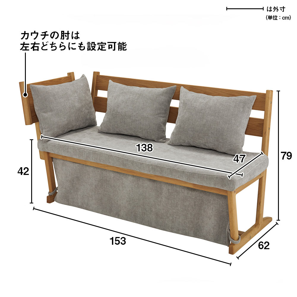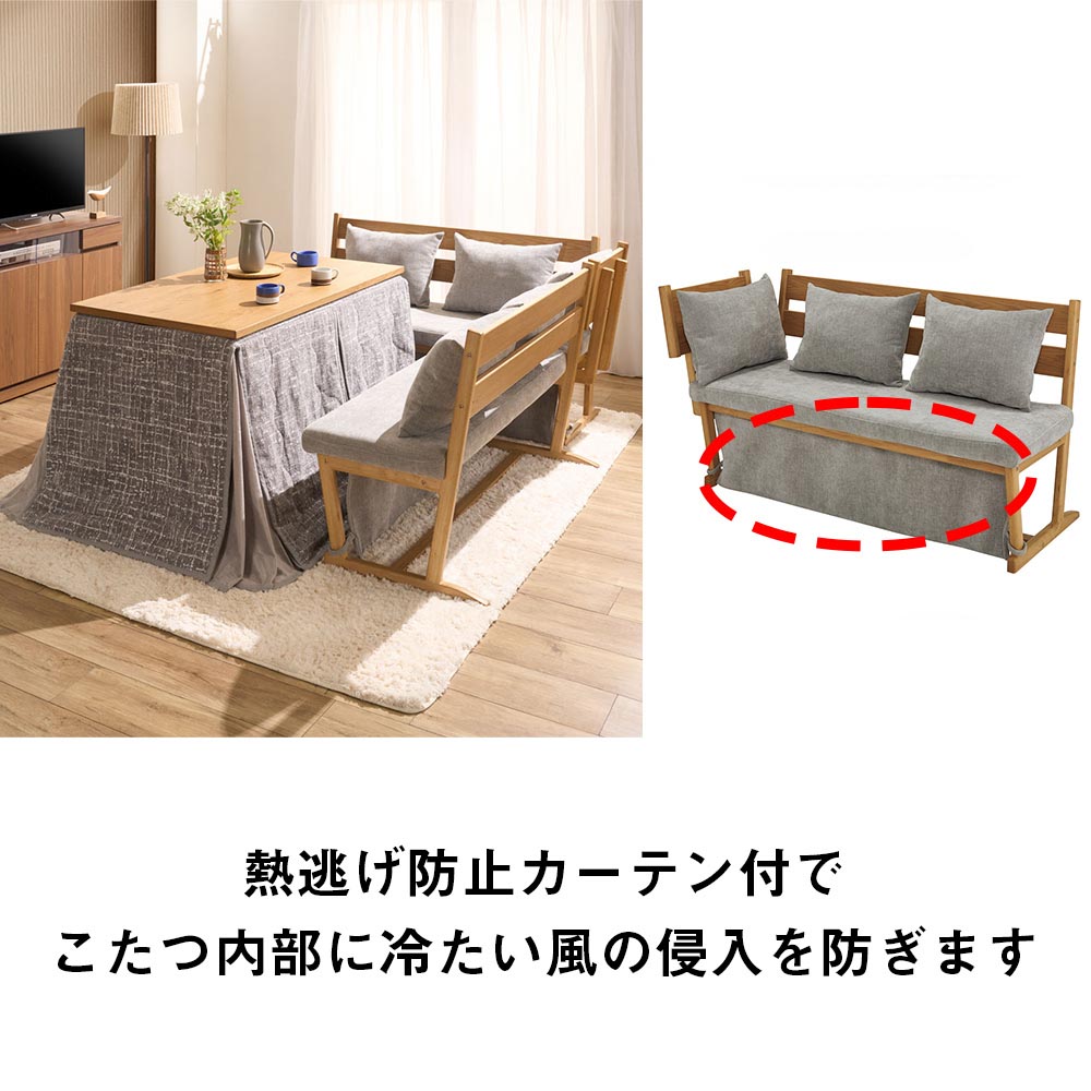 片側に肘の付いたカウチは、肘部分を背もたれにして脚を伸ばしてくつろげるのも魅力。ベンチ風の背もたれやすっきりとした脚部が、重すぎない抜け感を演出します。枕や足枕にもできるクッション3個付きで、肘部分は左右どちらにも設定できます。コーディネート例 ブラウン お届けはカウチです。写真は別売りのテーブル・ソファとの組合せです。天然木の上質感と、抜け感のあるデザインが魅力お部屋の雰囲気が重くなりがちなこたつやソファを圧迫感なく楽しめる「リビングダイニングこたつシリーズ」。脚部や背もたれに抜けをつくることで、すっきりとした空間に。リビングにもダイニングにもおすすめのデザインです。コーディネート例 ナチュラル お届けはカウチです。写真は別売りのテーブル・ソファとの組合せです。リビング&ダイニングの兼用で省スペースに狭いお部屋でも「ダイニング仕様の使い勝手」と「リビングソファのくつろぎ」を両立できるので、どちらも置くと狭くなるダイニングセットとソファを買い揃える必要がありません。本商品なら限られた空間をゆったり活用できます。上:ブラウン 下:ナチュラル(お届け商品) ※写真右はクッションを外した状態和洋の空間になじむカラーとフォルム落ち着きのある「ブラウン」、明るい雰囲気の「ナチュラル」。オーク天然木の美しい木目やぬくもり感を生かしたカラーとフォルムが、心やすらぐ居心地のよい空間を演出します。カウチの肘部分は、左右どちらにも設定できます。クッション3個付き。脚部の熱逃げ防止カーテンは取り外せます。左:ブラウン背面 右:ナチュラル側面(お届け商品)どの角度から見ても、威圧感のない構造ベンチのような背もたれやフレームは、後ろの風景や窓からの光を通すので、大型家具につきものの重苦しさや圧迫感を軽減。左:ブラウン背板正面 右:ナチュラル肘背もたれと肘部分は、表裏両面に天然木突板を使用背もたれ・肘部分は共に、表側だけでなく裏側にも天然木の突板を使用し、抜け感のあるデザインに。高級感のある佇まいで、どの方向からも美しい木目の表情を楽しめます。ナチュラル 左:座面 右:クッション座り心地にこだわった座面とクッション座面は硬すぎない適度な柔らかさ。クッションはふっくら柔らかく、背中にやさしくフィットします。ナチュラル ※写真は別売りのソファです。着脱可能な熱逃げ防止カーテンで、こたつ使用時も快適冬場にテーブルをこたつとして使うときに脚部に装着すれば、内側の暖気が逃げにくく、外からの冷気も侵入しにくくなります。ナチュラル熱逃げ防止カーテンは着脱可能脚部に面ファスナーで取り付けられて着脱も簡単。こたつを使わない時季は取り外せるので、見た目もすっきり。コーディネート例 ブラウン お届けはカウチです。写真は別売りのテーブル・ソファ・掛け布団との組合せです。ソファ&カウチスタイルで、ゆったりくつろげるシリーズ商品は、テーブル・ソファ・カウチ・掛け布団をご用意。お部屋に合わせて、L字や対面配置などご家庭にぴったりのアレンジができ、自由なスタイルでくつろげます。普段はテーブル、冬はこたつとして1年中、暮らしに寄り添います。