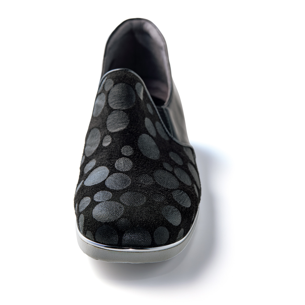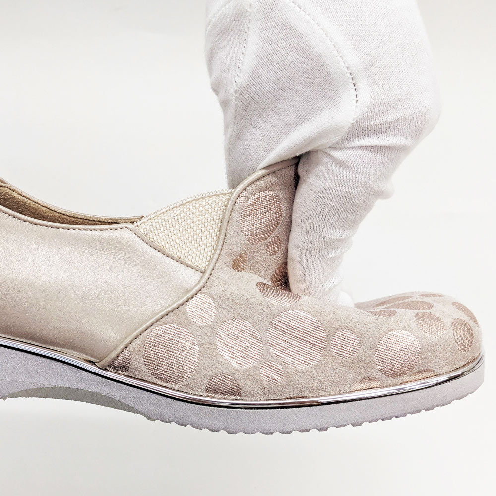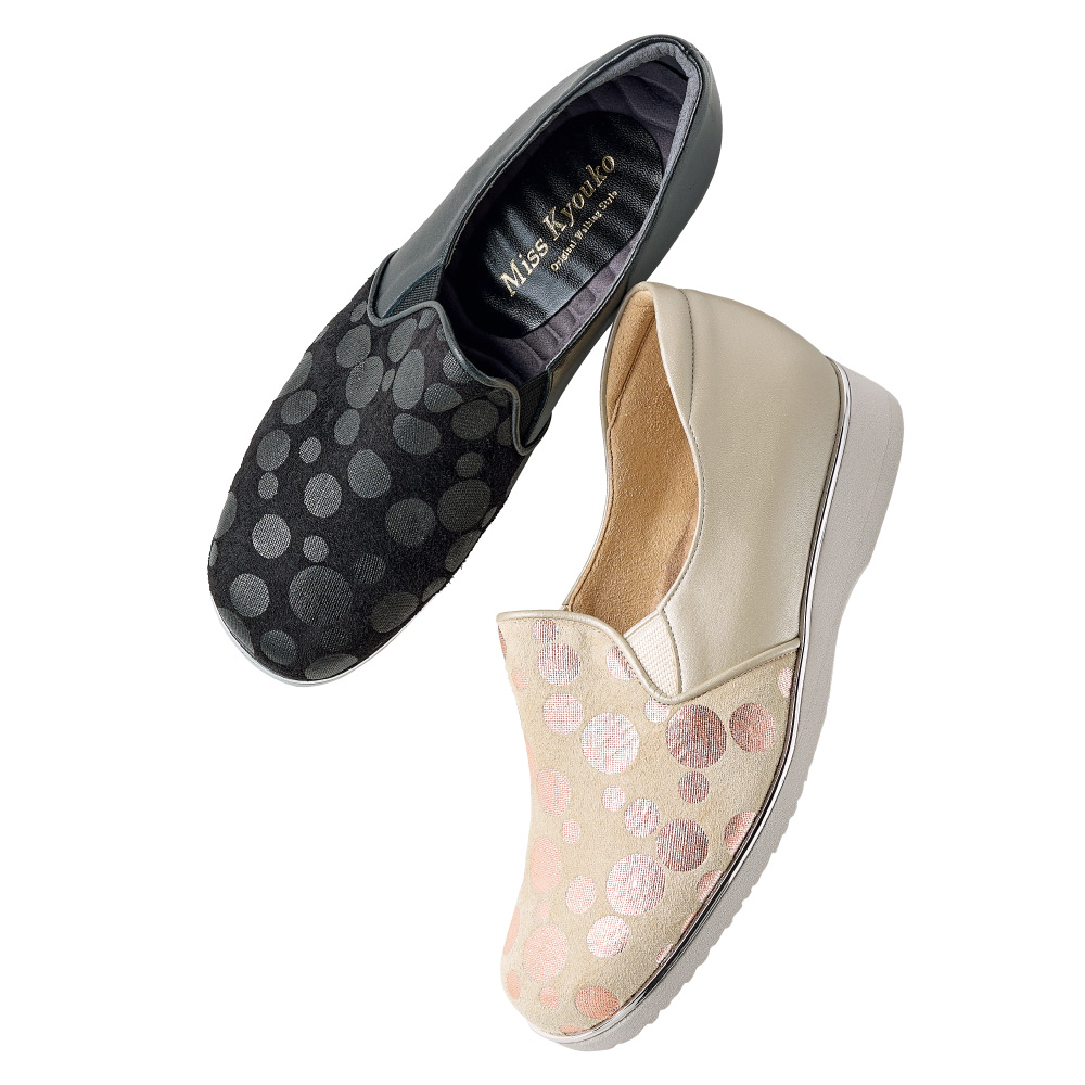 バブルドット柄で気分も華やかに!おしゃれなバブルドットに視線が集中! 機能面も文句なしの、軽やかな新作シューズ。バブルドットのおしゃれなデザインが、足元を華やかに彩ります。やわらかな豚革×牛革のコンビ素材が足になじみ、両サイドはゴム入りで着脱もスムーズ。クッション性の高いインソールは波型模様が足当たりよく、快適な歩行をサポートします。