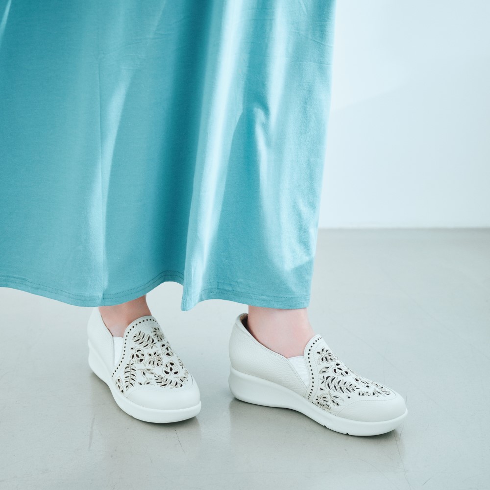 職人技が光るアートなボタニカル柄。太陽に良く似合うボタニカル柄のレザーカットを施した涼しげなスリッポン。約4.5cmの厚底ソールで自然に足長効果が期待できます。◆嬉しい3つのポイント◆・履き口のクッションはソフトな足あたりで、踵の脱げやすさを軽減。・足裏のアーチを支えるカップインソール(取り外し可能)が優しく足を包み込み疲れにくい。・高屈曲性で歩行を快適に。