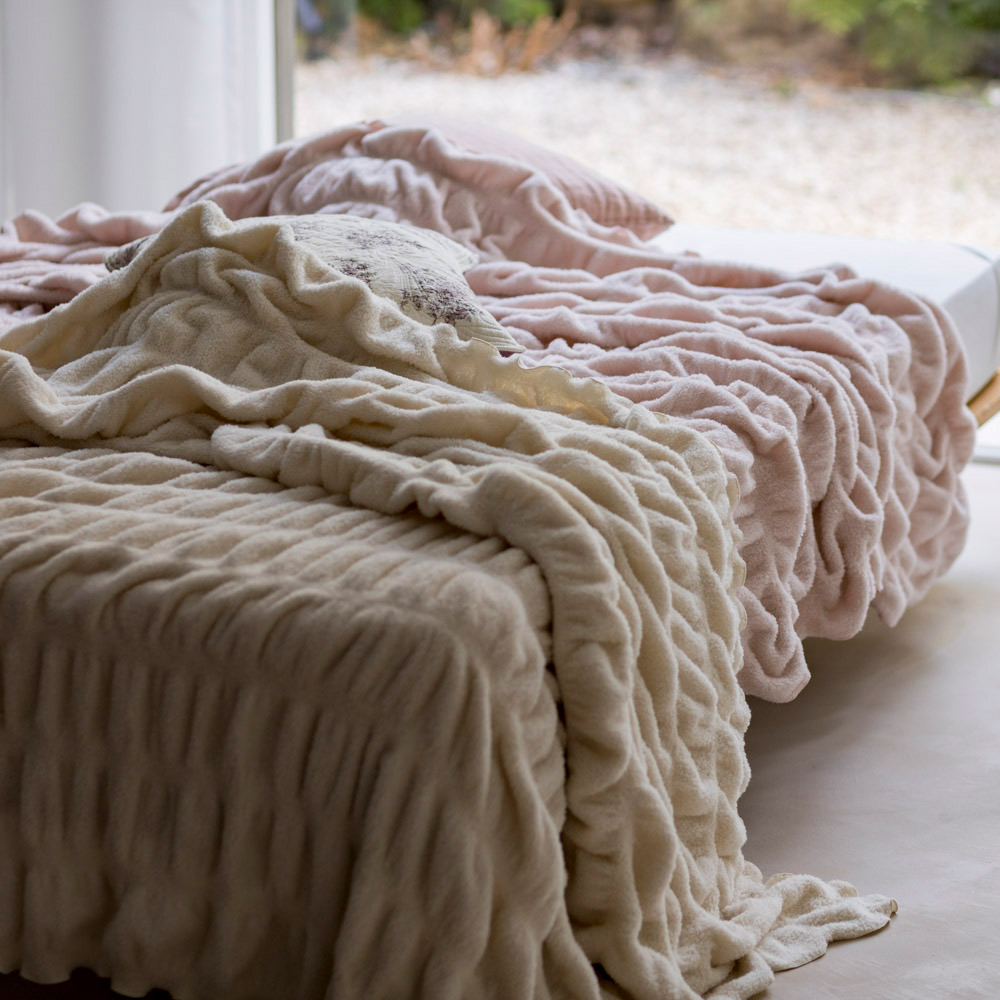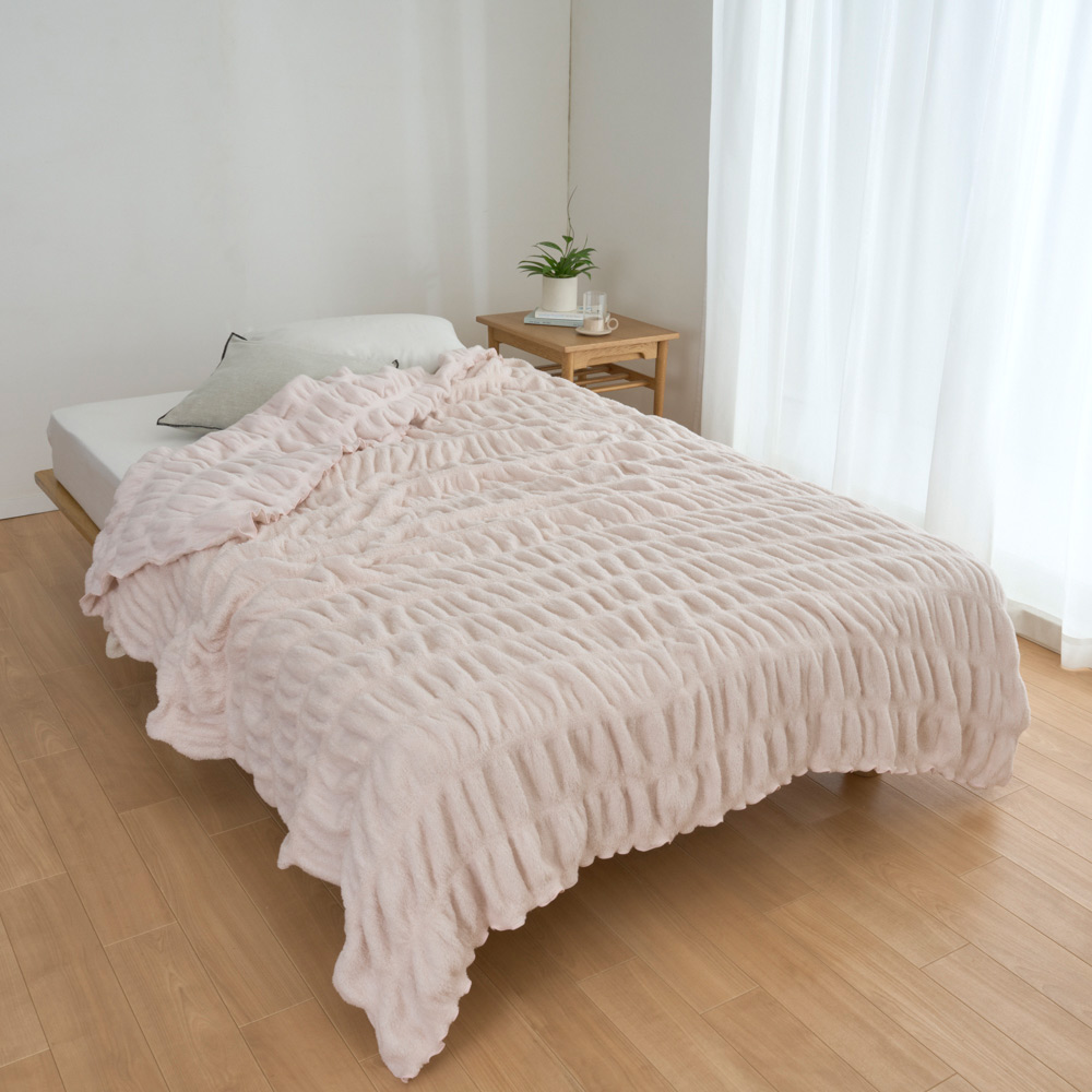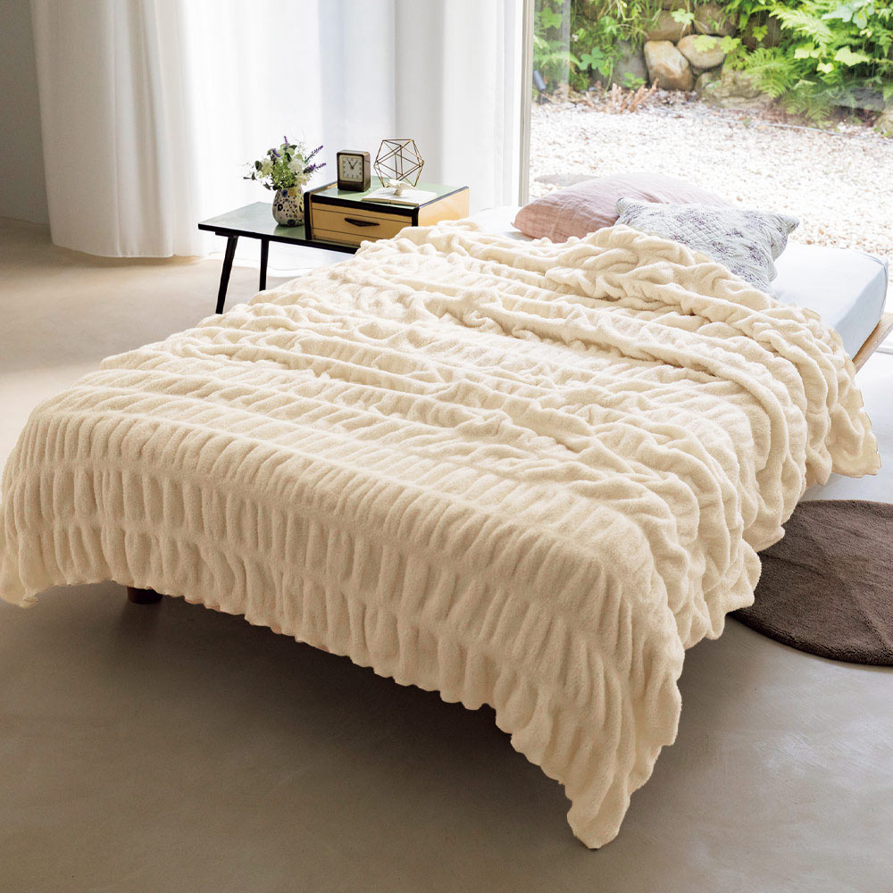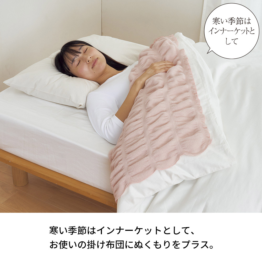 くしゅっとした構造による、身体に吸い付くような肌沿いと癒しの風合いが特長の日本製毛布です。コットンに施した吸湿発熱機能により、暖かいのにムレにくく快適。天然素材とは思えないほど軽くふわふわの掛け心地で、季節の変わり目や夏の冷房対策にはもちろん、インナーケットとしても使いやすく、一年を通して活躍します。優しく暖かいハグのように包んでくれる、コットンの発熱毛布くしゅっとした伸縮性による身体に吸い付くような肌沿いと、ふんわり軽い癒しの風合いに包まれれば、日々の疲れもストレスもほどけていくよう!コットンを使用した特殊糸に吸湿発熱機能を施し、ムレにくく暖か。真冬はインナーケットとしてぬくもりをプラス、春先や季節の変わり目には1枚でちょうどいい暖かさです。大人気のハグウォームがリッチにリニューアル!両面パイル生地に起毛を施すことで、一段とリッチでふわふわの風合いに!表裏で毛足の長さが異なるリバーシブルなので、季節やお好みに合わせてお楽しみいただけます。空気をたっぷり含んだコットンの優しい肌ざわりで、軽くムレにくく暖かな掛け心地です。“暖かい空気をたっぷり保つ”特殊糸「プレミアムツイスト」が吸湿発熱して、寝具内をムレにくく暖かくコットンに極細のポリエステルを巻きつけた特殊構造の糸に、吸湿発熱機能をプラス。細かな繊維の間に空気層ができることで、暖かい空気をたっぷり溜め込みます。特許技術の「くしゅくしゅ加工」で、身体にフィットして包み込むマルチ伸縮丁寧に起毛したニット生地をくしゅくしゅに加工。ふんわりやわらかく伸縮性があり、身体をすっぽり包み込んで冷気を遮断します。寝返りを打ってもずれにくく、暖かく快適です。ふんわりボリューミーなのに、軽くてストレスフリーな掛け心地このボリュームで、重さわずか約900g(シングルサイズ)と軽量。メーカー従来品の綿毛布と比較したところ、本品はふっくらボリューミーでありながら驚きの軽さ!空気をたっぷり含んでいるからとても暖かく軽量で、ストレスフリーな掛け心地です。洗濯機で洗えて、洗うたびやわらかな風合いにご自宅の洗濯機で丸洗いでき(ネット使用)、清潔に気持ちよくお使いいただけます。洗うたびふっくらやわらかな風合いが楽しめます。日本製の高い技術が織りなす絶品毛布石川県能登の編み工場で丁寧に仕立て、和歌山県の起毛工場で丹精込めて仕上げました。繊細な糸を使い、丈夫かつふんわりなめらかな毛布に仕上げるために、日本が誇る高度な技術と職人技が注がれています。寒い季節はインナーケットとして、お使いの掛け布団にぬくもりをプラス軽量でずれにくいのでインナーケット使いにぴったりです。春先や季節の変わり目には一枚でちょうどいい暖かさで、一年を通して活躍します。ふんわり優しいパステルカラーの2色展開上(ア)アイボリー、下(イ)ベビーピンク