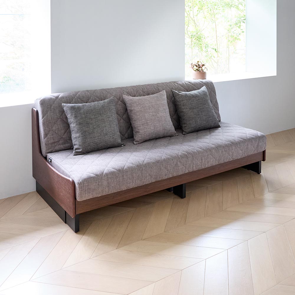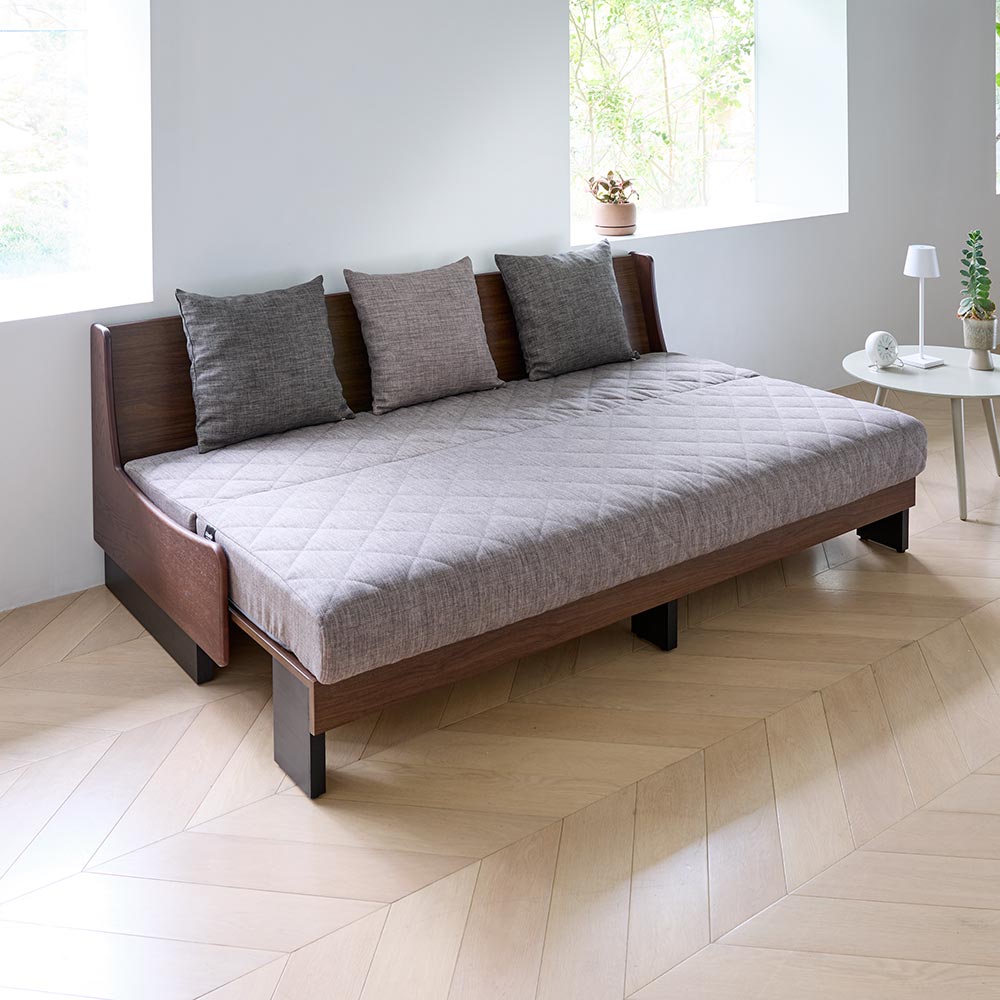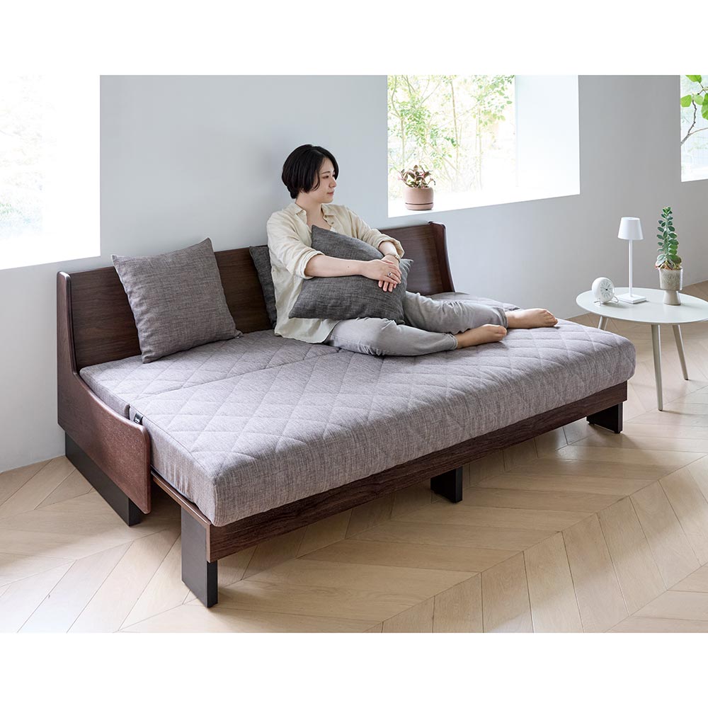 人気のソファベッドがリニューアル!ベッドとして使っても心地いい、高反発マットレスが自慢。座面をスライドするだけで、座る、寝る、くつろぐなど、多様な快適スタイルを叶えます。楽な姿勢で広々使える2WAY仕様のくつろぎソファベッドソファとしてもベッドとしても快適なリビングライフが叶う人気のソファベッドです。より使いやすくリニューアルしました。座面をスライドするだけで、ソファからベッドに早変わり!リビングでの多様なくつろぎのスタイルに対応できます。ソファの下はお掃除ロボットが通れますソファの下は13cmの高さになっています。お掃除ロボットが活躍できるようになったのもニューアルのポイント。嬉しいクッション付き!180cmサイズのソファベッドにはクッションが3つ付属しています。リラックスタイムがより快適に。(200サイズは4個付き)座面の中材には新素材「ライトウェーブ」を使用「ライトウェーブ」には快適さのための機能が凝縮されています。強くしなやかなポリエレン製で体を支える力に優れた素材です。程よい反発力でベッド時にも楽に寝返りがうてます。さらに、湿気を中に滞留させないため長時間の睡眠でもムレにくく、快適な睡眠環境が得られます。へたりにくいからソファとしてもベッドとしても長く愛用できます第三者機関においてJIS規格に基づき耐久性試験を実施。「ライトウェーブ」を半分の厚みまで連続80000回繰り返し圧縮し、厚さの低下を測定したところ、その復元率は93%以上!長期間の使用にも耐えうる素材であることが証明されました。カバーは取り外して洗え、清潔に保てます。通常ウレタン等は洗うことは難しいですが、カバーを取り外せる「ライトウェーブ」は、水での丸洗いが可能。優れた通気性で速乾性に優れ、常に衛生的に保つことができます。お部屋のインテリアや好みによって、お気に入りの組み合わせを見つけてくださいフレームはナチュラルとブラウンの2色、クッション部がブルーとグレーの2色で計4色の組み合わせをご用意いたしました。