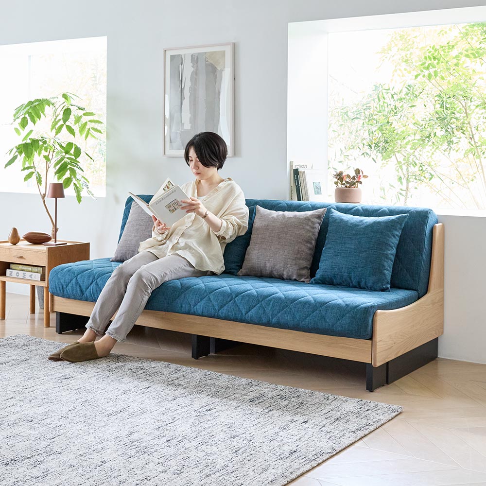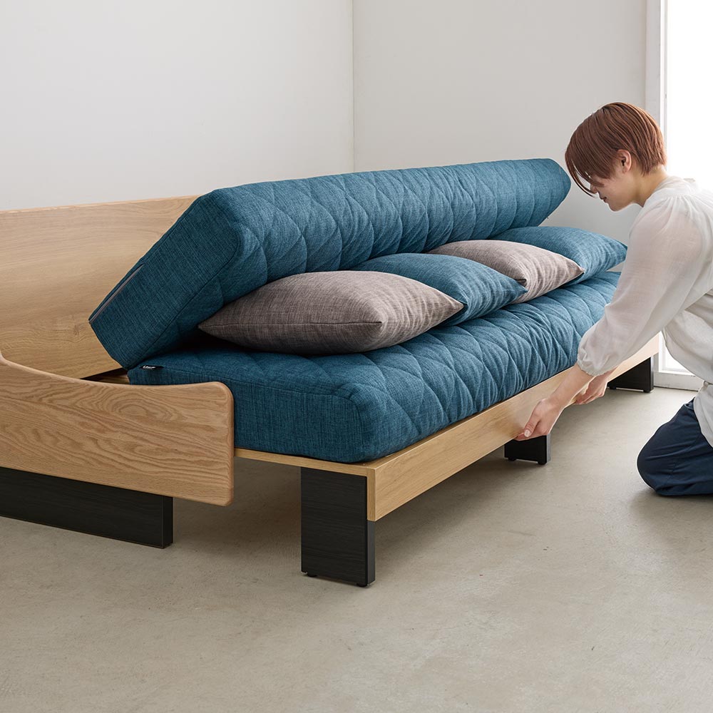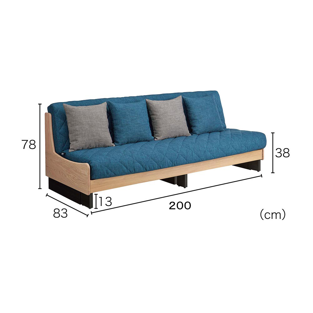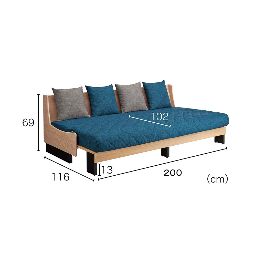 人気のソファベッドがリニューアル!ベッドとして使っても心地いい、高反発マットレスが自慢。座面をスライドするだけで、座る、寝る、くつろぐなど、多様な快適スタイルを叶えます。〜楽な姿勢で広々使える2WAY仕様のくつろぎソファベッドがリニューアル〜◎ソファとしてもベッドとしても快適なリビングライフが叶う人気のソファベッド。座面下が空いたことでお掃除ロボットにも対応! ◎座面をスライドするだけで、ソファからベッドに早変わり ◎リビングでの多様なくつろぎスタイルに対応致します◎クッション付きで、リラックスタイムをサポートします(200サイズは4個付き、180サイズは3個付きになります)〜快適さのためのこだわり【ライトウェーブ】〜座面の中材には新素材【ライトウェーブ】を使用。【ライトウェーブ】には快適さのための機能が凝縮されています・しっかり支える【ライトウェーブ】は強くしなやかなポリエレン製。体を支える力に優れた素材です。程よい反発力で、ベッド時にも楽に寝返りがうてます。・ムレにくい人は眠っている間、大量の汗をかきます。撥水性の高いポリエチレンでできている【ライトウェーブ】は湿気を中に滞留させないため長時間の睡眠でもムレにくく、快適な睡眠環境が得られます。・乾きやすい通常ウレタン等は洗うことは難しいですが、カバーを取り外せる【ライトウェーブは】水での丸洗いが可能。優れた通気性で速乾性に優れ、常に衛生的に保つことができます。・へたりにくい第三者機関においてJIS規格に基づき耐久性試験を実施。【ライトウェーブ】を半分の厚みまで連続80、000回繰り返し圧縮し、厚さの低下を測定したところ、その復元率は93%以上。長期間の使用にも耐えうる素材であることが証明されました。〜豊富なカラーバリエーションをご用意〜◎今回もフレームはナチュラルとブラウンの2色、クッション部がブルーとグレーの2色計4色の組み合わせをご用意いたしました。◎お部屋のインテリアや好みによって、お気に入りの組み合わせを見つけてください
