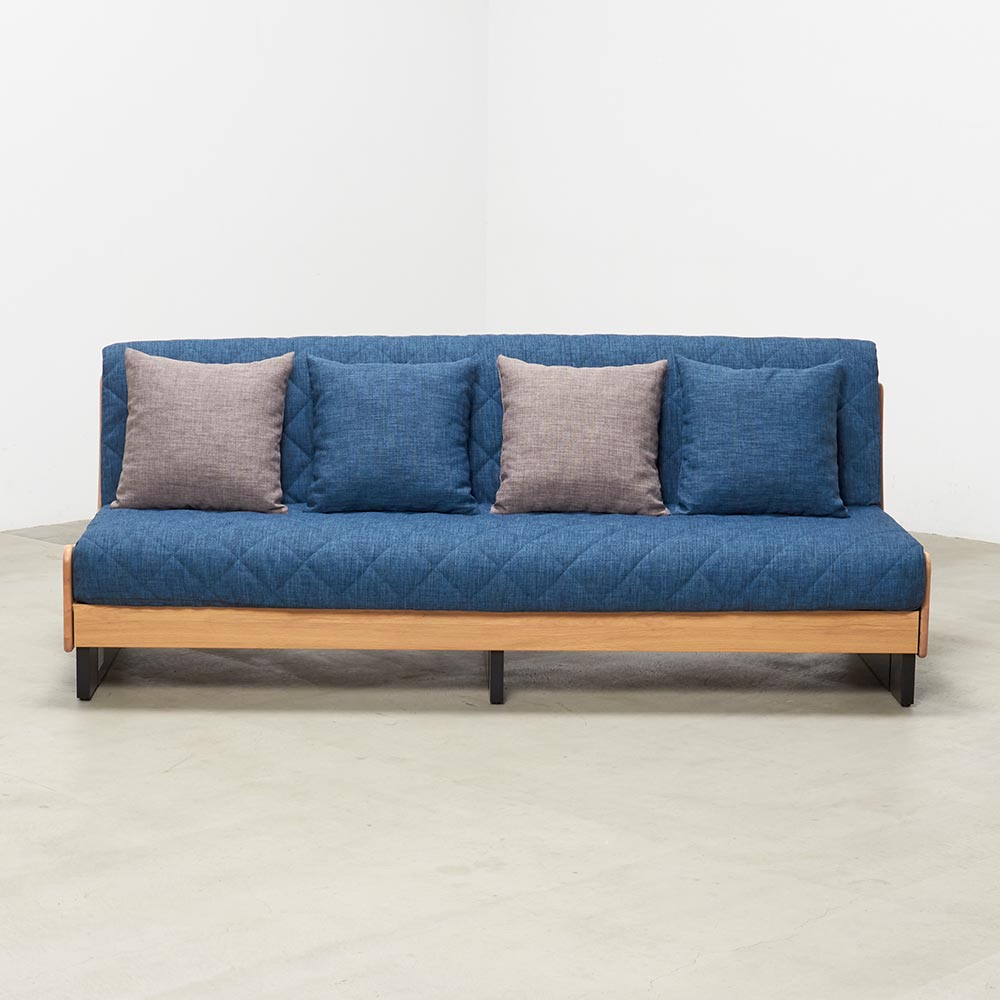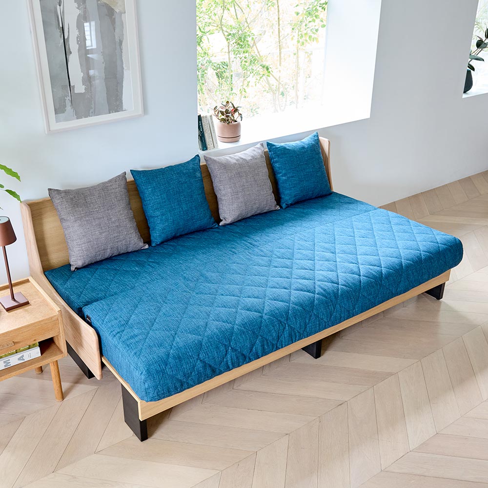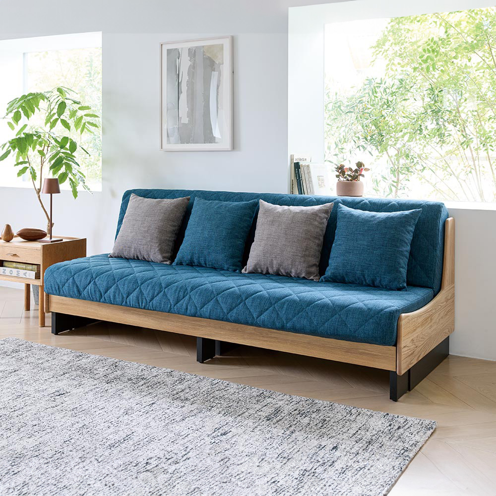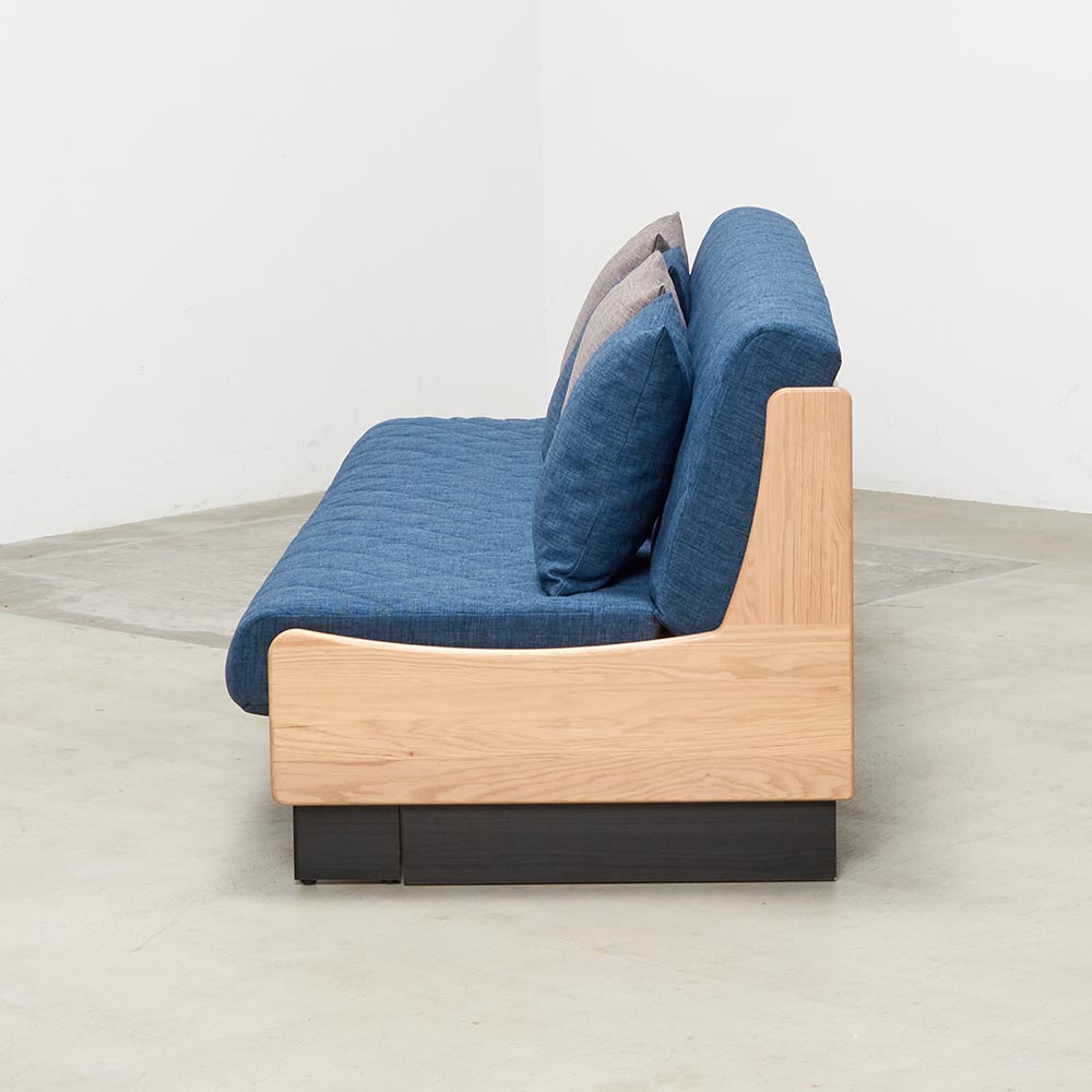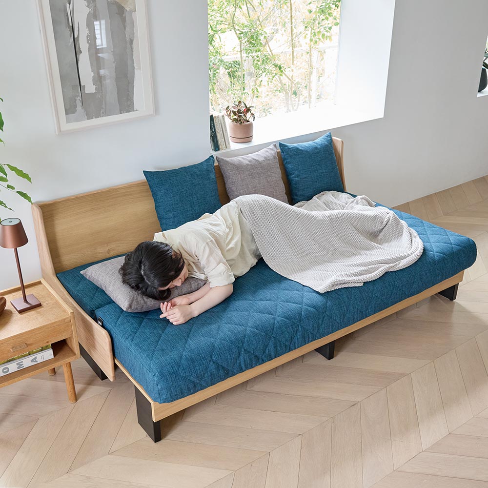 人気のソファベッドがリニューアル!ベッドとして使っても心地いい、高反発マットレスが自慢。座面をスライドするだけで、座る、寝る、くつろぐなど、多様な快適スタイルを叶えます。〜楽な姿勢で広々使える2WAY仕様のくつろぎソファベッドがリニューアル〜◎ソファとしてもベッドとしても快適なリビングライフが叶う人気のソファベッド。座面下が空いたことでお掃除ロボットにも対応! ◎座面をスライドするだけで、ソファからベッドに早変わり ◎リビングでの多様なくつろぎスタイルに対応致します◎クッション付きで、リラックスタイムをサポートします(200サイズは4個付き、180サイズは3個付きになります)〜快適さのためのこだわり【ライトウェーブ】〜座面の中材には新素材【ライトウェーブ】を使用。【ライトウェーブ】には快適さのための機能が凝縮されています・しっかり支える【ライトウェーブ】は強くしなやかなポリエレン製。体を支える力に優れた素材です。程よい反発力で、ベッド時にも楽に寝返りがうてます。・ムレにくい人は眠っている間、大量の汗をかきます。撥水性の高いポリエチレンでできている【ライトウェーブ】は湿気を中に滞留させないため長時間の睡眠でもムレにくく、快適な睡眠環境が得られます。・乾きやすい通常ウレタン等は洗うことは難しいですが、カバーを取り外せる【ライトウェーブは】水での丸洗いが可能。優れた通気性で速乾性に優れ、常に衛生的に保つことができます。・へたりにくい第三者機関においてJIS規格に基づき耐久性試験を実施。【ライトウェーブ】を半分の厚みまで連続80、000回繰り返し圧縮し、厚さの低下を測定したところ、その復元率は93%以上。長期間の使用にも耐えうる素材であることが証明されました。〜豊富なカラーバリエーションをご用意〜◎今回もフレームはナチュラルとブラウンの2色、クッション部がブルーとグレーの2色計4色の組み合わせをご用意いたしました。◎お部屋のインテリアや好みによって、お気に入りの組み合わせを見つけてください