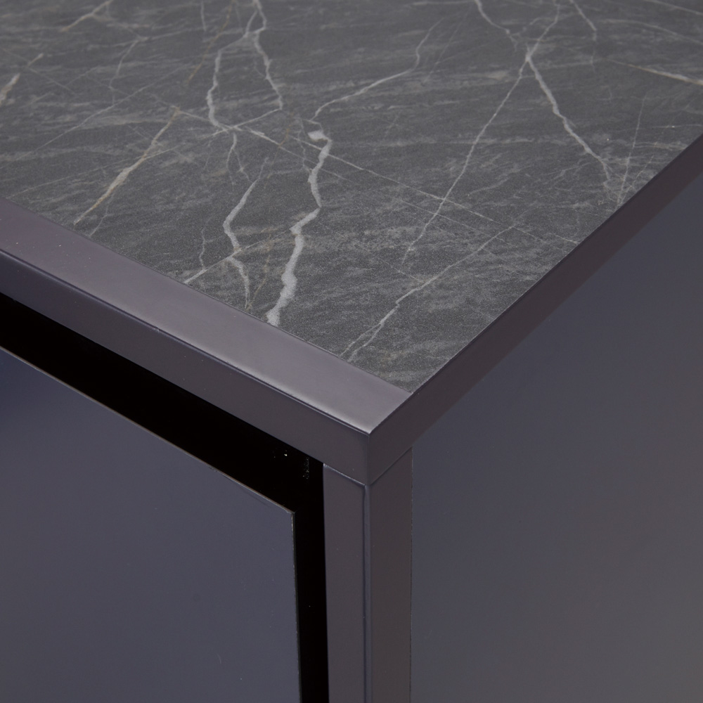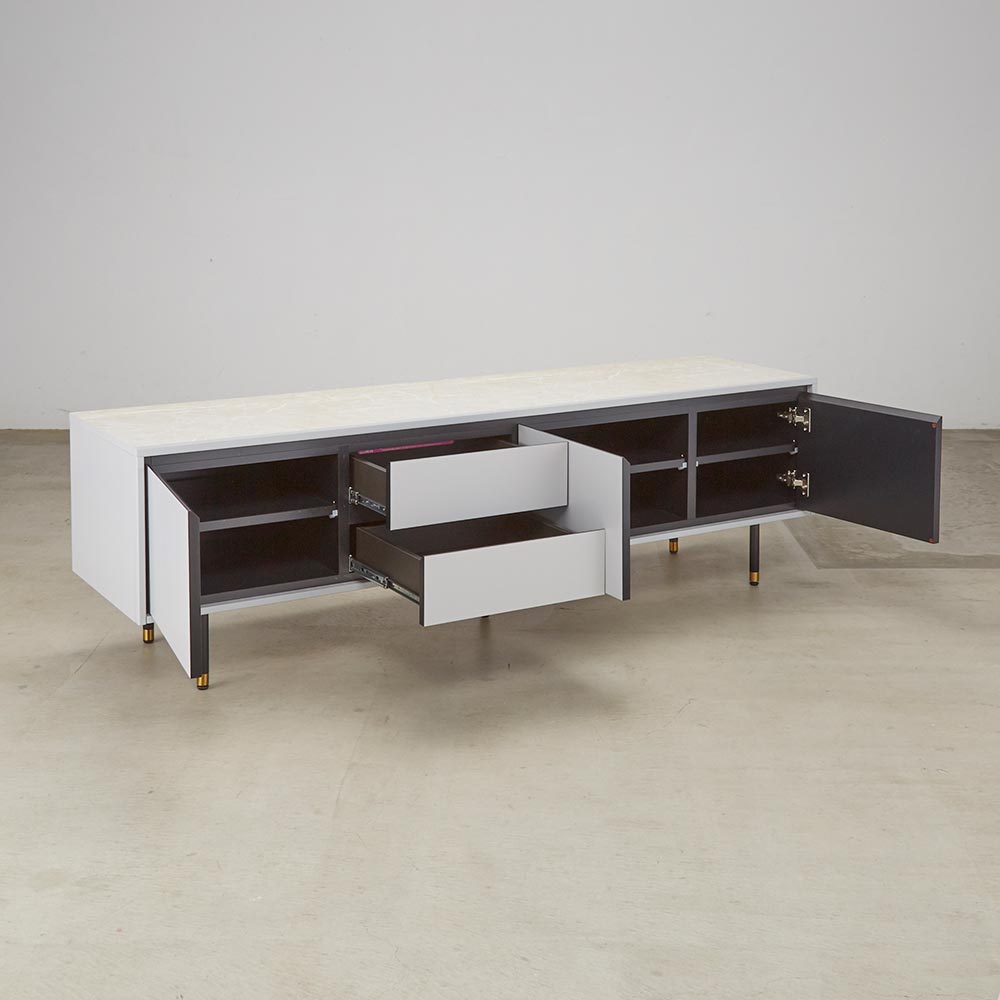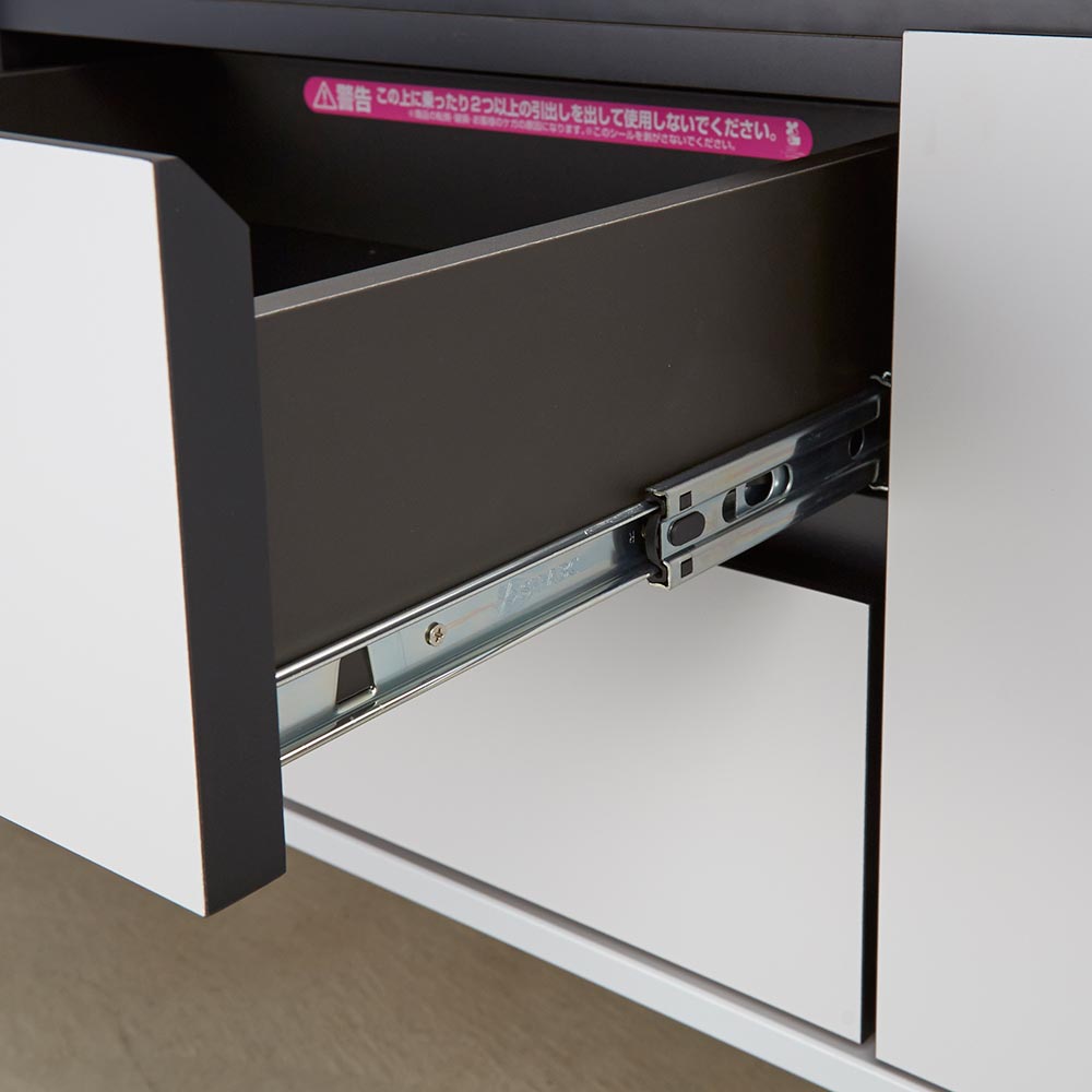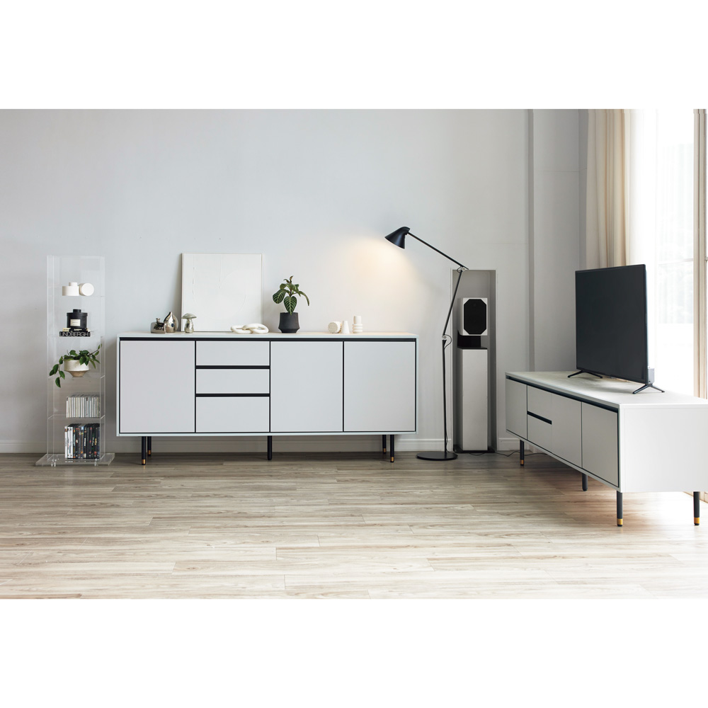 異素材コンビネーションに魅せられる、近代的デザインボード。リビングルームにプラスワン収納を考え抜かれたサイズ設計。リビング周りの収納物がうまく片付く。機能的な収納力ルーターをしまいやすく、裏面に配線が通せるようになっています。ソフトクロージングユニットを採用ソフトダンパーにより静かにしまる扉・引き出しモノクロを基調とした新しいデザイン深みのある色合いの本体に、人気の大理石調の天板とゴールドのアクセントの効いたブラックスチールの脚をあわせました。2種類の2トーンカラーネイビー:上部の天板はブラックの大理石調。前面はネイビーで高級感のある落ち着いたトーンの上質なモダンスタイル。ライトグレー:上部の天板はホワイトの大理石柄。前面はライトグレーでモノトーンな部屋に馴染みやすいシンプルモダンスタイル。ローボードのサイズは2サイズ180cm:おすすめのテレビサイズは65〜70型210cm:おすすめのテレビサイズは70型〜
