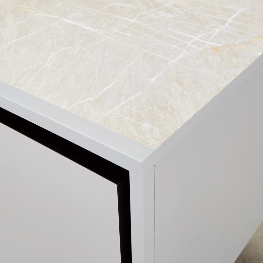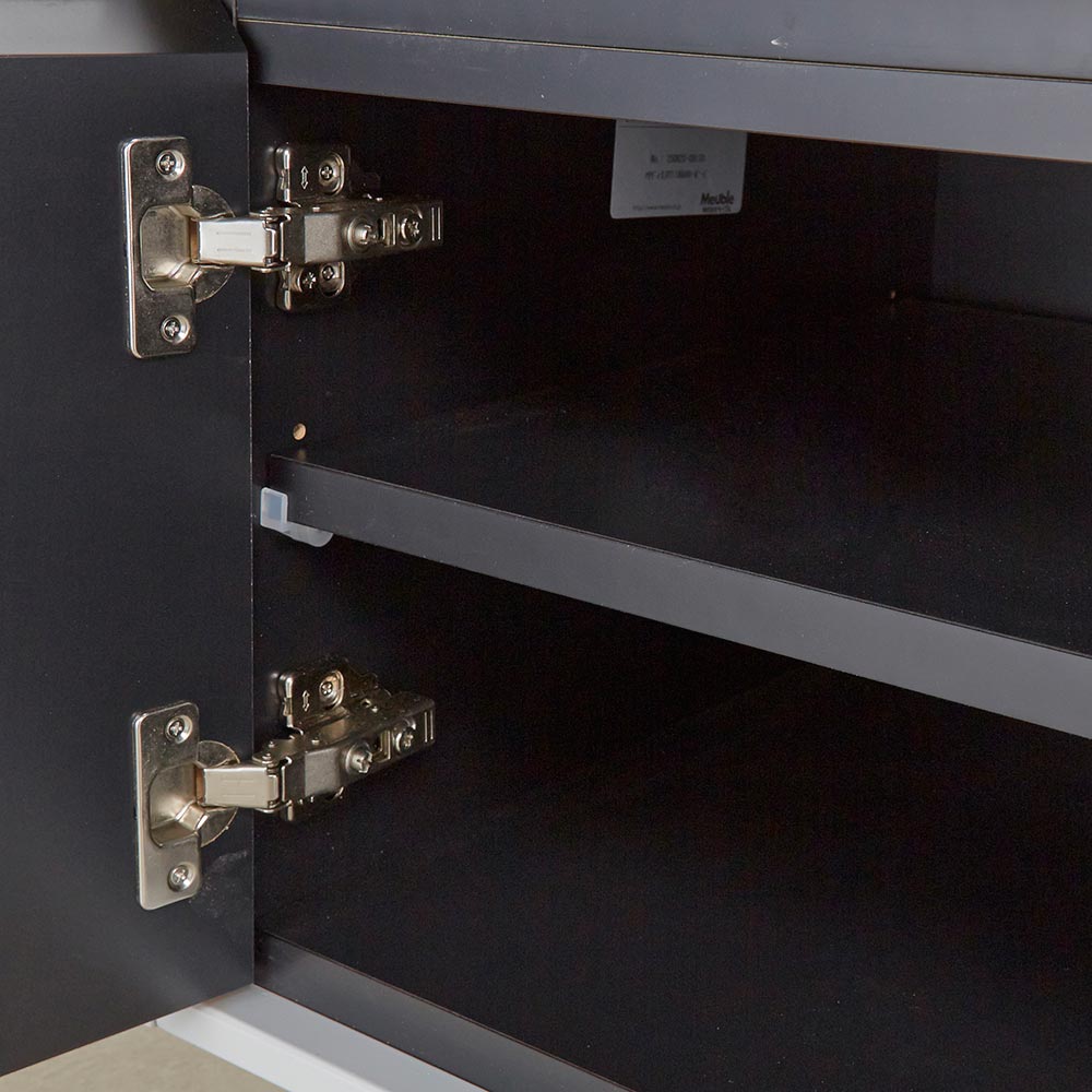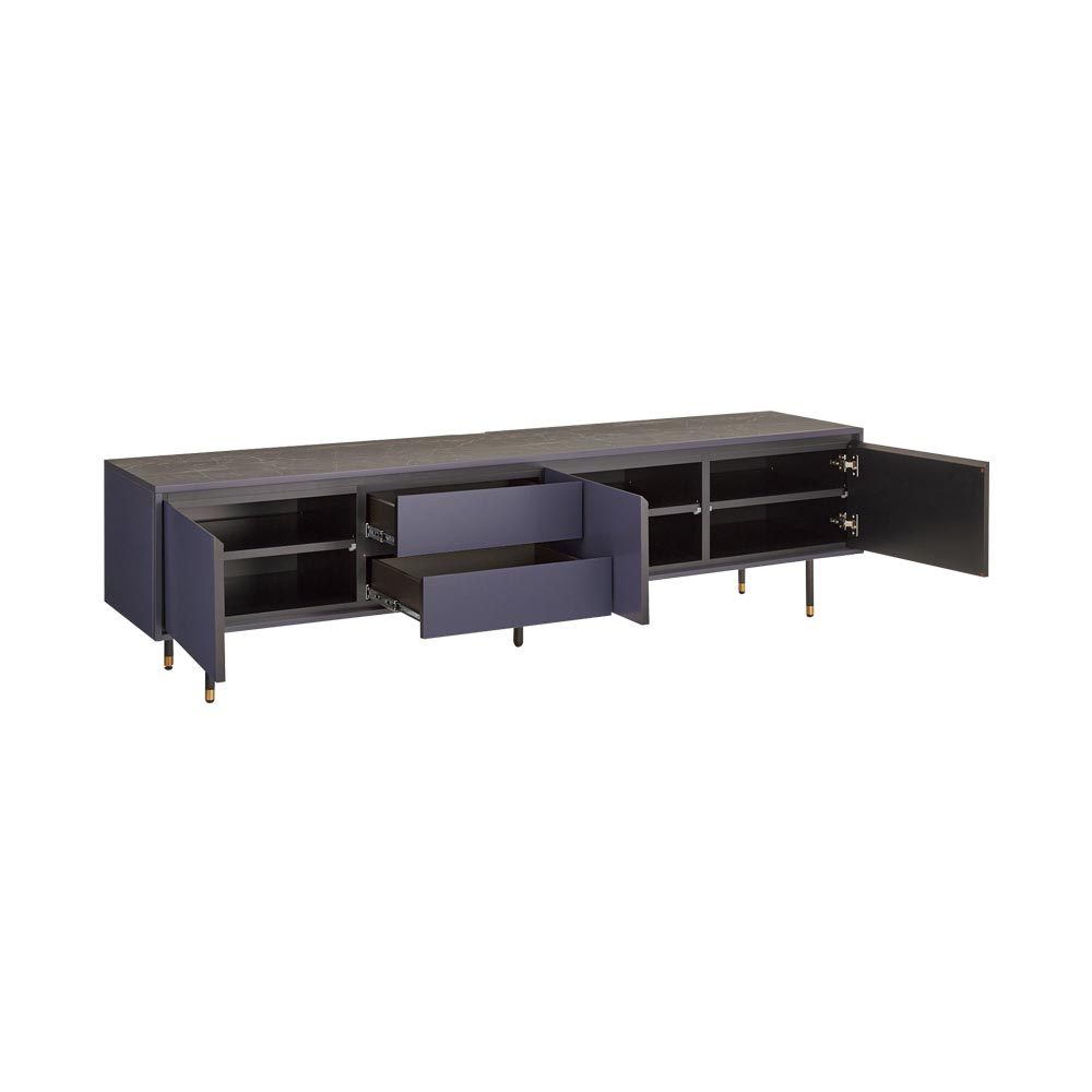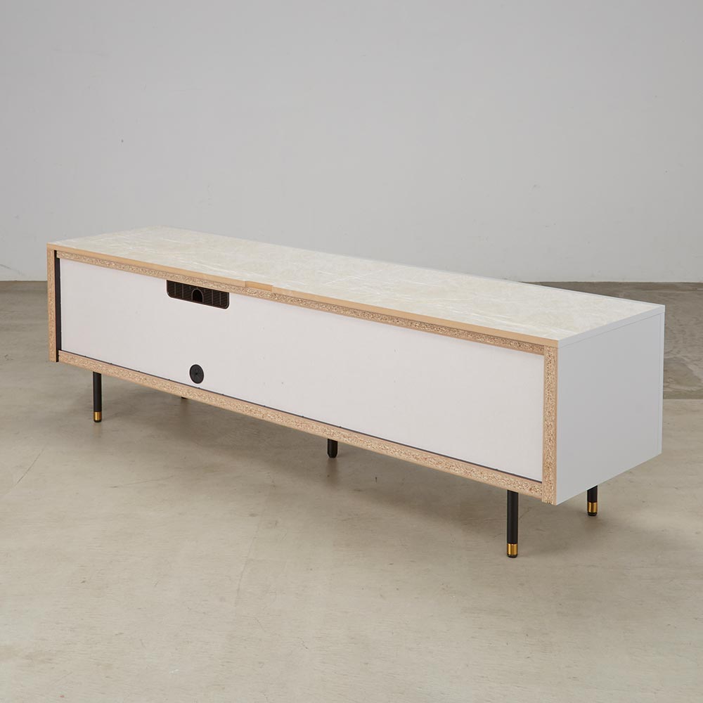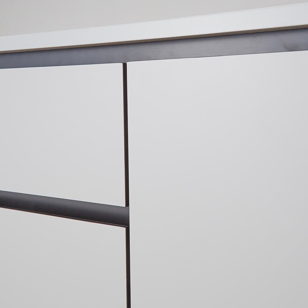 異素材コンビネーションに魅せられる、近代的デザインボード。リビングルームにプラスワン収納を考え抜かれたサイズ設計。リビング周りの収納物がうまく片付く。機能的な収納力ルーターをしまいやすく、裏面に配線が通せるようになっています。ソフトクロージングユニットを採用ソフトダンパーにより静かにしまる扉・引き出しモノクロを基調とした新しいデザイン深みのある色合いの本体に、人気の大理石調の天板とゴールドのアクセントの効いたブラックスチールの脚をあわせました。2種類の2トーンカラーネイビー:上部の天板はブラックの大理石調。前面はネイビーで高級感のある落ち着いたトーンの上質なモダンスタイル。ライトグレー:上部の天板はホワイトの大理石柄。前面はライトグレーでモノトーンな部屋に馴染みやすいシンプルモダンスタイル。ローボードのサイズは2サイズ180cm:おすすめのテレビサイズは65〜70型210cm:おすすめのテレビサイズは70型〜