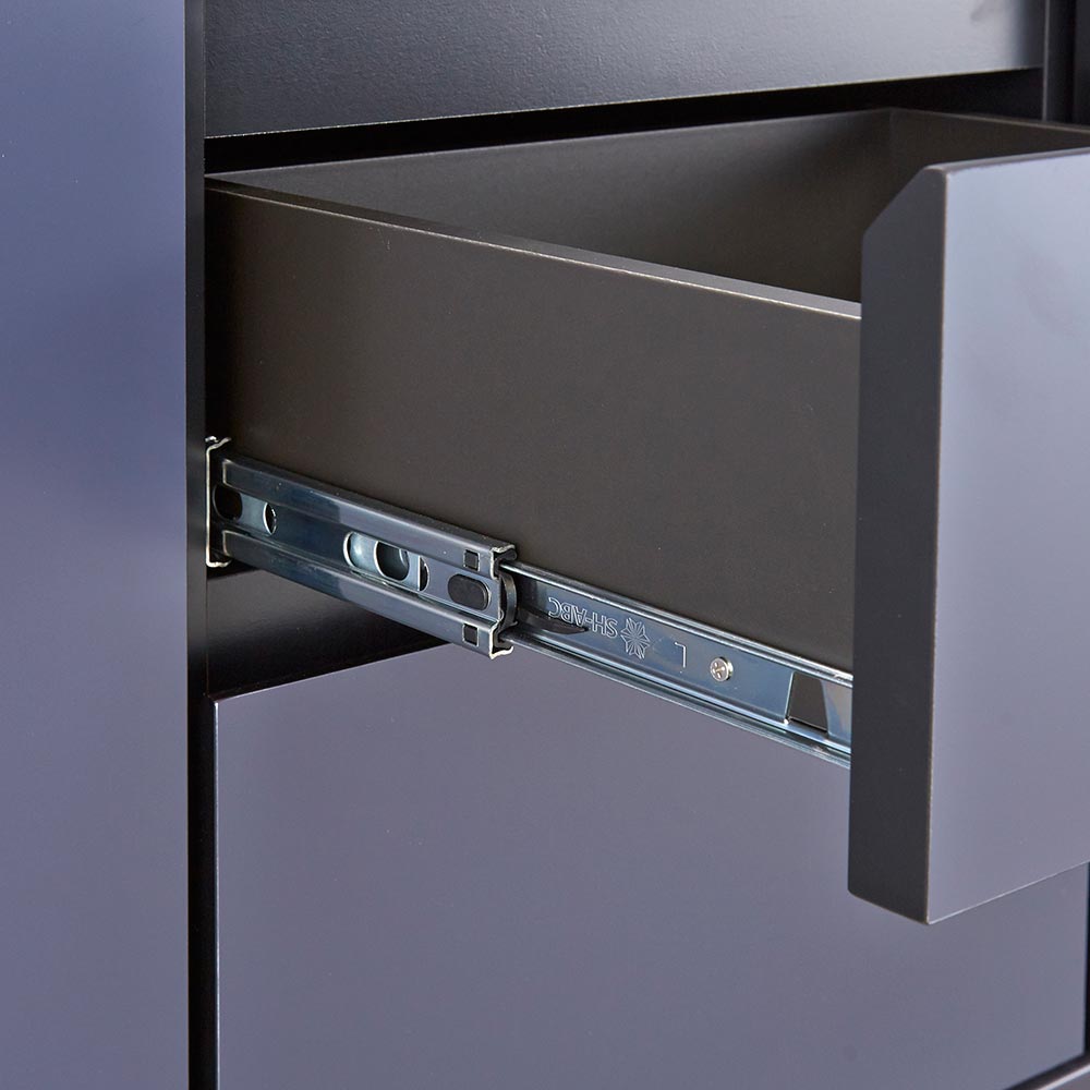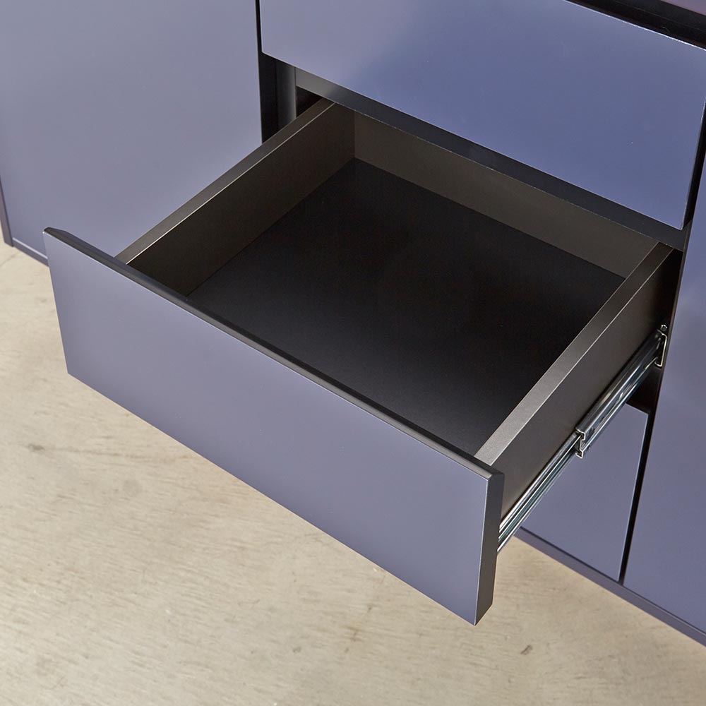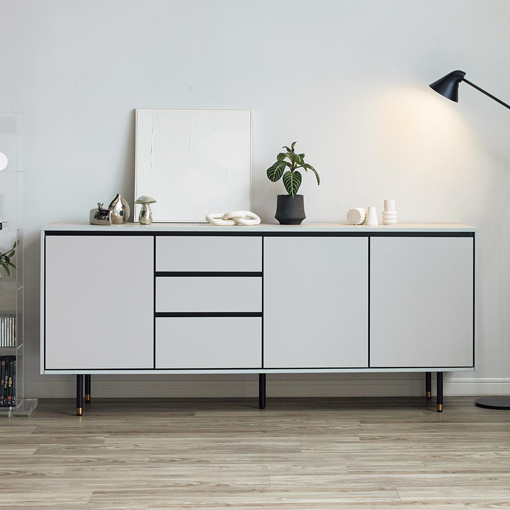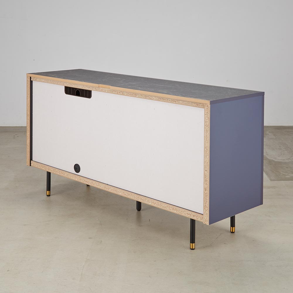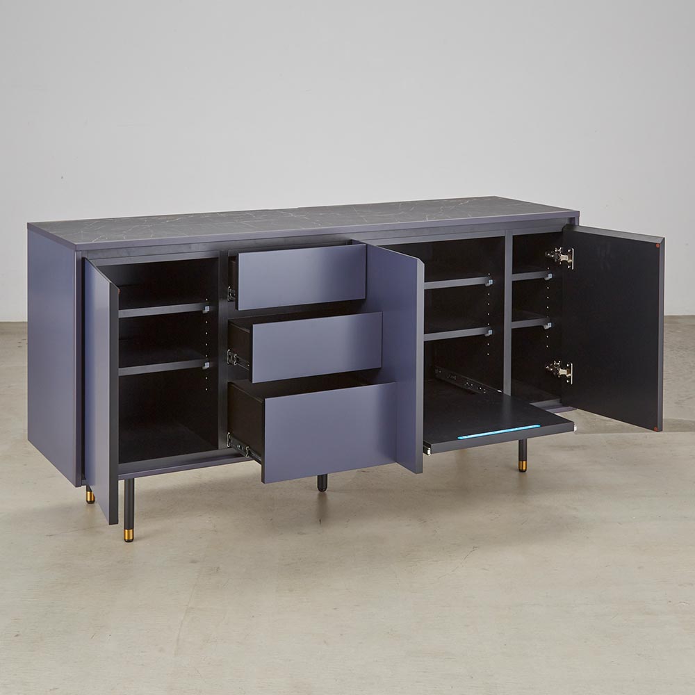 異素材コンビネーションに魅せられる、近代的デザインボード。リビングルームにプラスワン収納を考え抜かれたサイズ設計。リビング周りの収納物がうまく片付く。機能的な収納力ルーターをしまいやすく、裏面に配線が通せるようになっています。ソフトクロージングユニットを採用ソフトダンパーにより静かにしまる扉・引き出しモノクロを基調とした新しいデザイン深みのある色合いの本体に、人気の大理石調の天板とゴールドのアクセントの効いたブラックスチールの脚をあわせました。2種類の2トーンカラーネイビー:上部の天板はブラックの大理石調。前面はネイビーで高級感のある落ち着いたトーンの上質なモダンスタイル。ライトグレー:上部の天板はホワイトの大理石柄。前面はライトグレーでモノトーンな部屋に馴染みやすいシンプルモダンスタイル。サイドボードのサイズは2サイズ150cm:おすすめのテレビサイズは49〜60型180cm:おすすめのテレビサイズは65〜70型