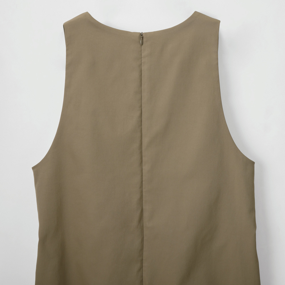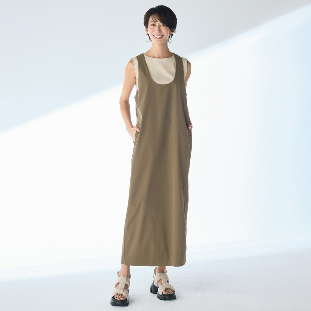 進化アイテムで、長く暑い夏も美しく。ジリジリと灼ける陽射しに降り注ぐ紫外線、高温多湿の日本の夏がやってきます。過酷な条件下でも涼しい顔でお洒落を楽しみながら、イージーケアでスタイルアップを叶える小技が光る「多機能アイテム」をご紹介。快適な素材をスマートに取り入れて、暑い夏も美しく過ごしましょう!リラクシーな着心地ながら、モードにスタイルアップ!ご紹介の度に大好評、着るだけでほんのり涼しいジャンパースカートに、新色カーキが加わりました。素材は接触冷感に加え、UVカット、吸水速乾性も備えた仕立て映えのするチノ風生地。軽量でシワになりにくく、上品な微光沢がリッチでいて着心地は伸びやかです。着用するとコクーン風に落ちるストレートシルエットは、長めの丈感が大人っぽさも。肩の収まりがよく、すっきり見える深Uネック、足さばきのよいバックスリットなど、着心地も丁寧に計算された自信作です。[接触冷感|UVカット|吸水速乾]