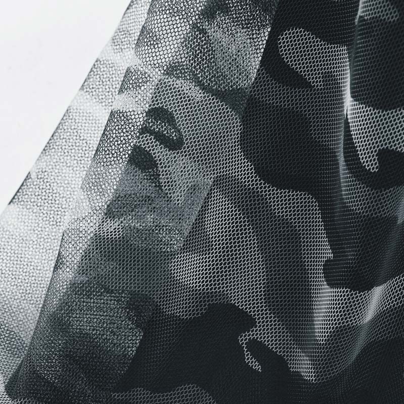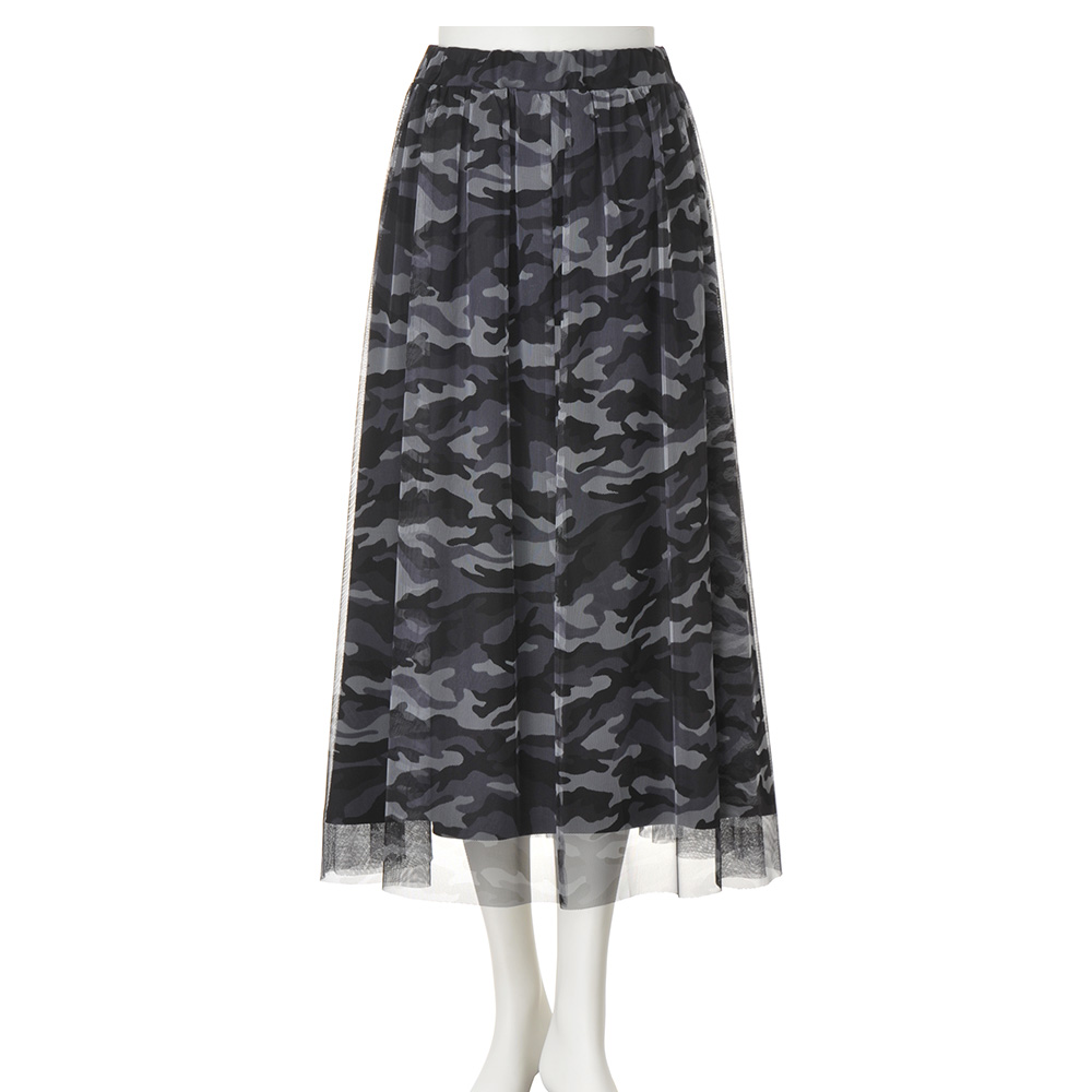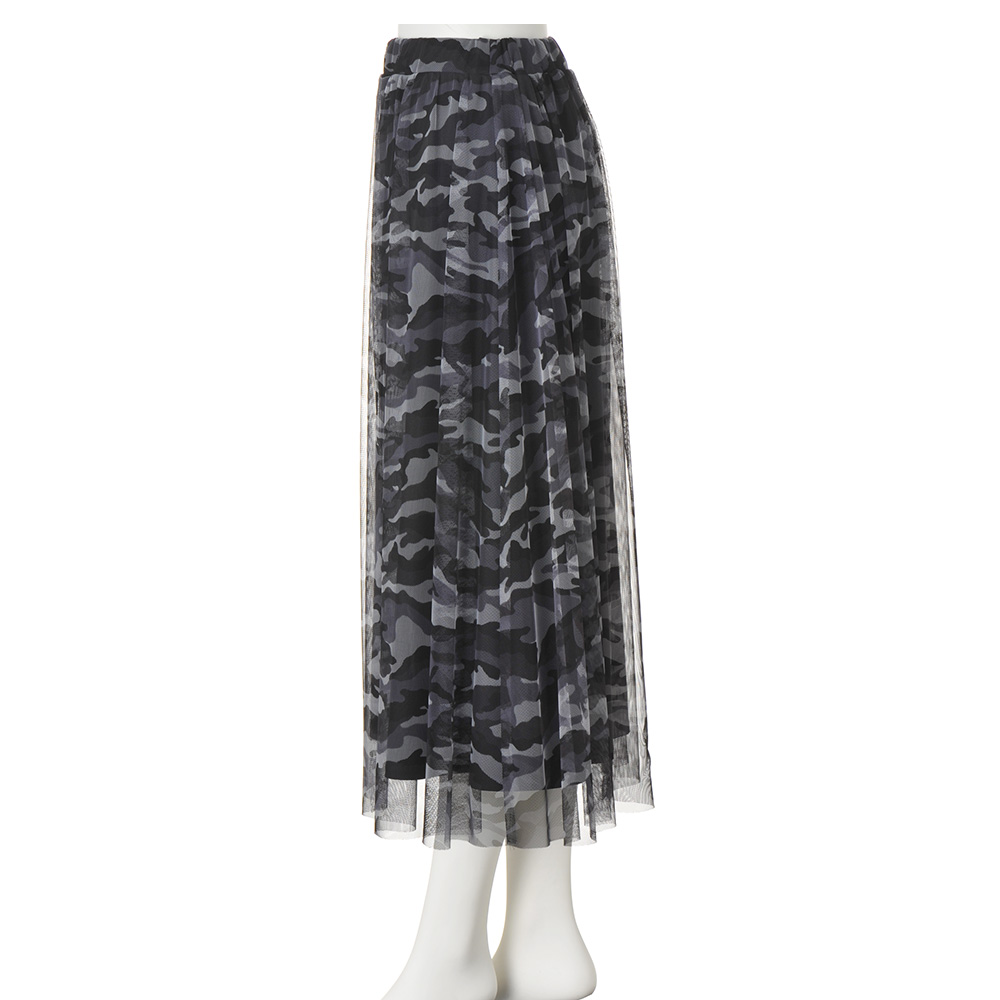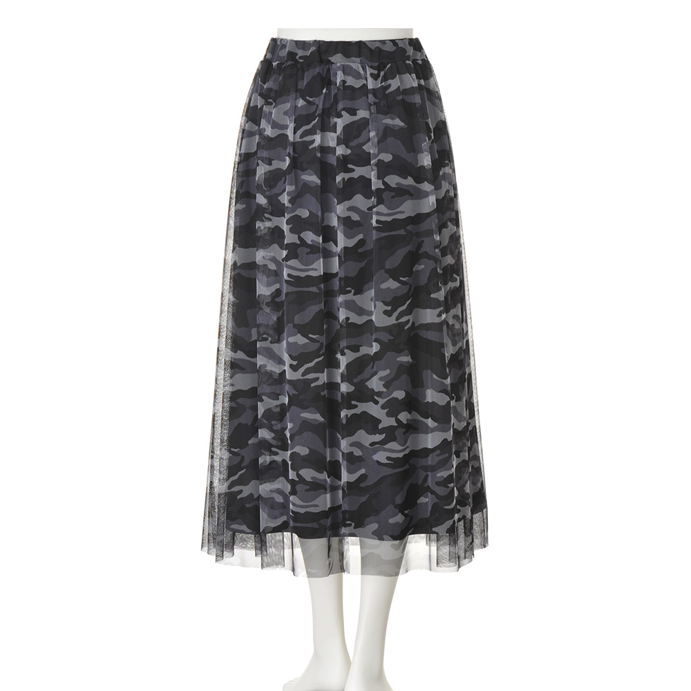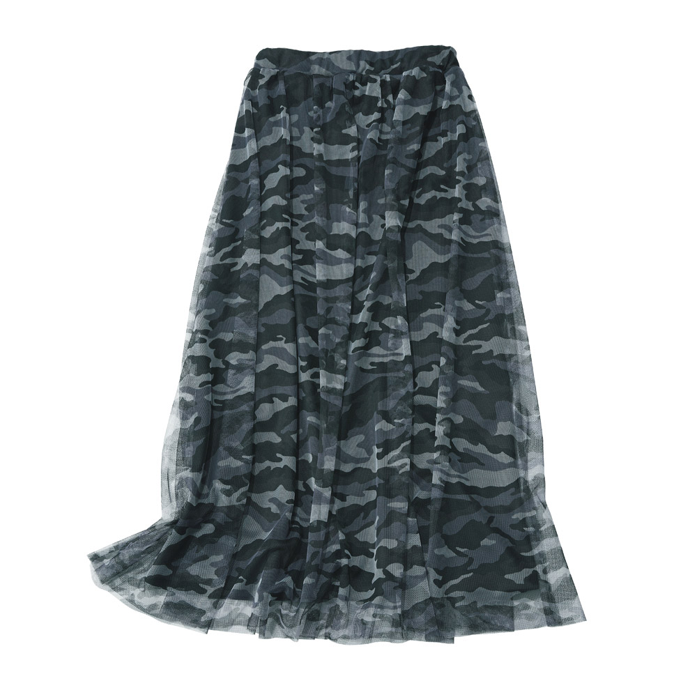 伸縮性のある柔らかなチュール。一見ハードな迷彩柄も、この素材、この色なら取り入れやすい!