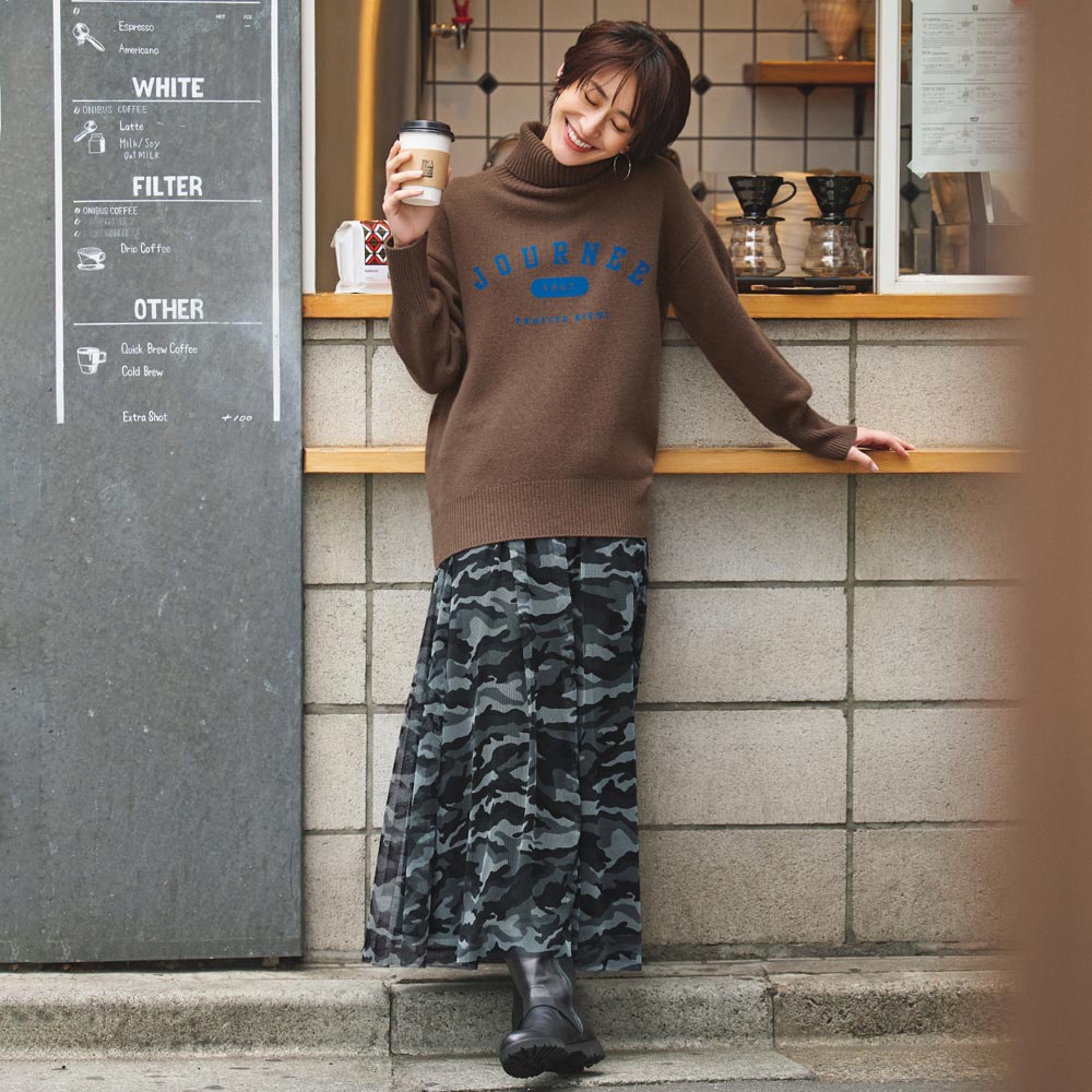 日常のお洒落に今どきのテイストをON街で着るのが似合う大人のヘルシーカジュアル毎日のスタイリングに欠かせない、程よくカジュアルで、どこかスポーティな旬の服。着映えはもちろん、親近感や好感度も手に入る、冬のマストハブをご用意しました。着映えのカギを握るのは、上品な遊び心のスパイス甘さのある素材とデザインを引き締めるのは、ぴりっと辛口の迷彩プリント。地厚なトリコットジャージーの上に、迷彩柄チュールを重ねた存在感のあるスカートは、広がりすぎないギャザー分量も計算尽く。ゆるトップスを合わせても、バランスよく仕上がります。ゴムウエストで着心地はラクラク。