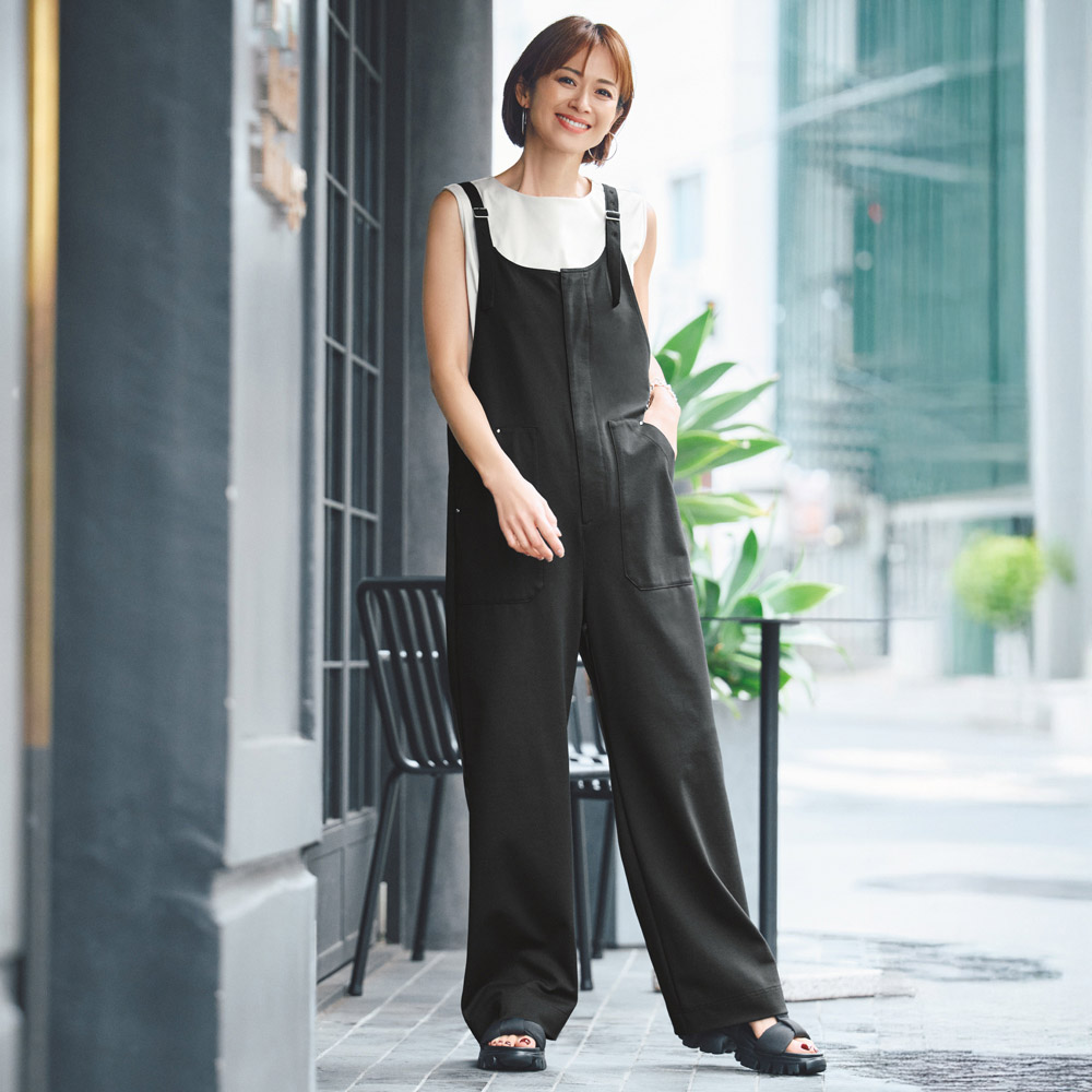 爽やかな笑顔はじけるホリデースタイル大切な人や友人とのショートトリップ、ショッピングやカフェなどの気軽なお出かけ…。夏の休日のワンシーンを彩るきれいめなカジュアルアイテムを、コーディネートでお見せします。力の抜けたお洒落感が、カフェにお似合い。シンプルトップスに合わせるだけで洒落見えする、接触冷感機能のあるきれいめポンチ素材で仕立てた大人のオーバーオールです。伸びやかで落ち感もある素材だから、ストンとしたワイドシルエットがすっきり美脚を演出。レングスは足元にワンクッションできるやや長めの丈感に拘りました。長さ調節できる女性らしい細幅のショルダーストラップ、トイレで困らないフロントファスナー開きなど、もうオーバーオールに躊躇する理由はありません。≫POINTリベットをさりげなく配したベイカー風ポケットと腰高見えするヒップポケットが、縦長シルエットを間延びさせないポイントに。