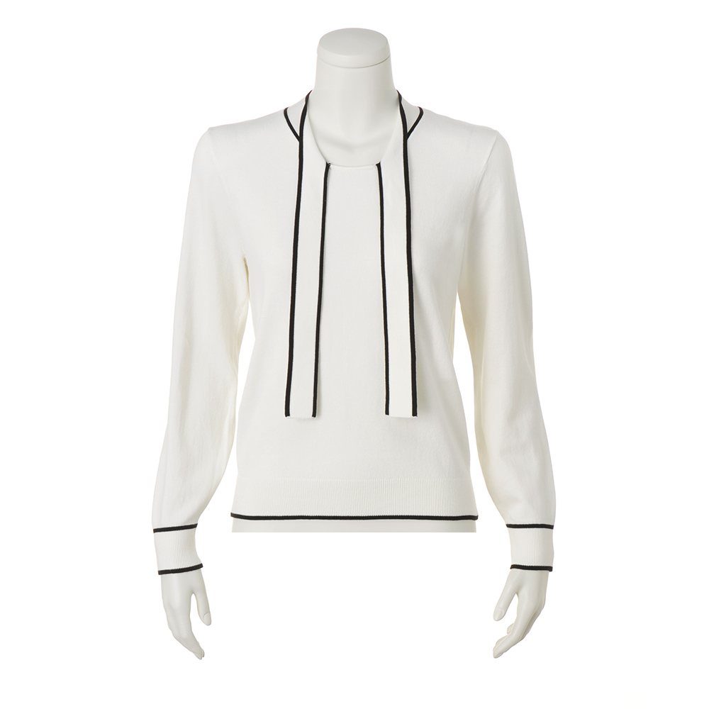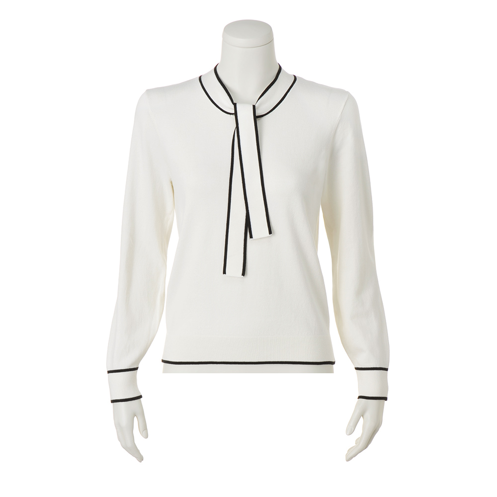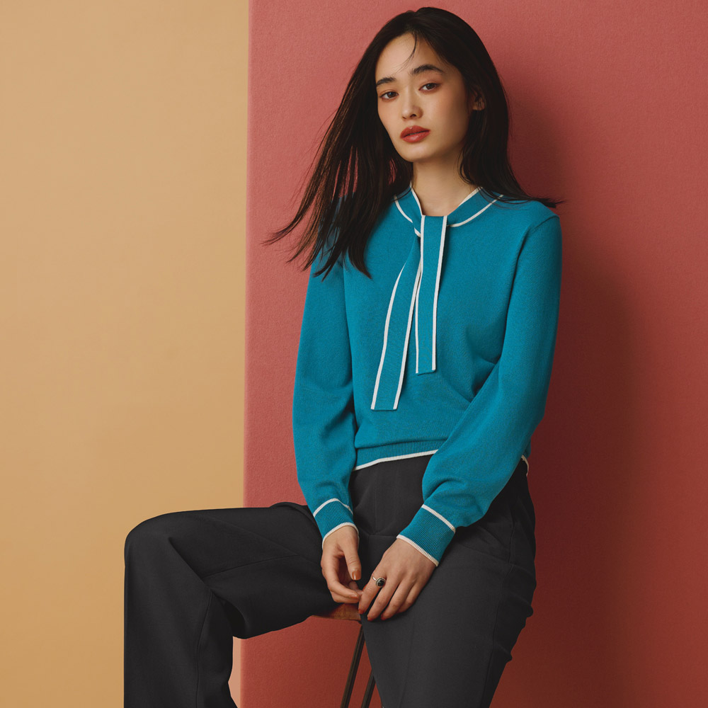 NEW FEELING素材やシルエットにとことんこだわった、気の利いたアイテムをピックアップ。一点投入するだけで今っぽく仕上がるその手腕で、“自分らしさ”をアップデート。FUNCTION KNIT /多機能ニット[ UVカット | 帯電防止|ウォッシャブル|抗ピリング]伸びやかな着心地のニットは、UVカット&静電気と毛玉を防止する多機能素材。レーヨン混ならではの光沢感となめらかな落ち感のハイゲージが、大人っぽくきれいめな印象を後押ししてくれます。おうちの洗濯機で気軽に洗えるから、デイリーに着られるところも高ポイント。人気のボウタイシリーズが、今年も再登場しました。毎年人気の理由は、さらりと気軽に使える素材感と一着でサマになる着映え力。アクセントに入れた配色ライン使いも華やかさを後押ししてくれます。単品使いはもちろん、ジャケットのインナーとしてもおすすめです。