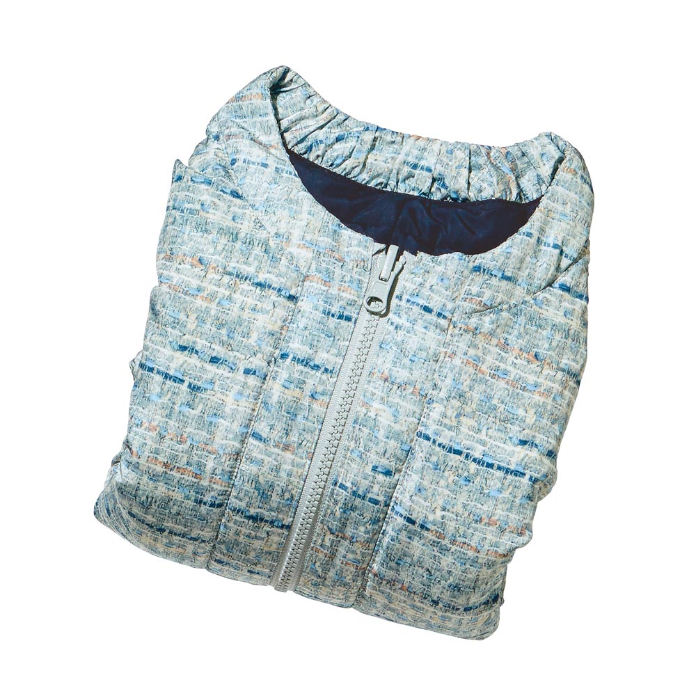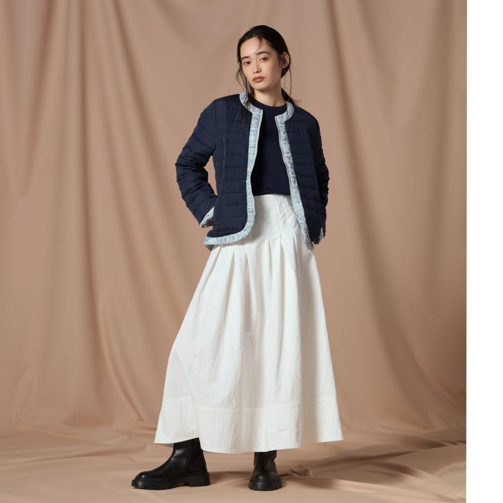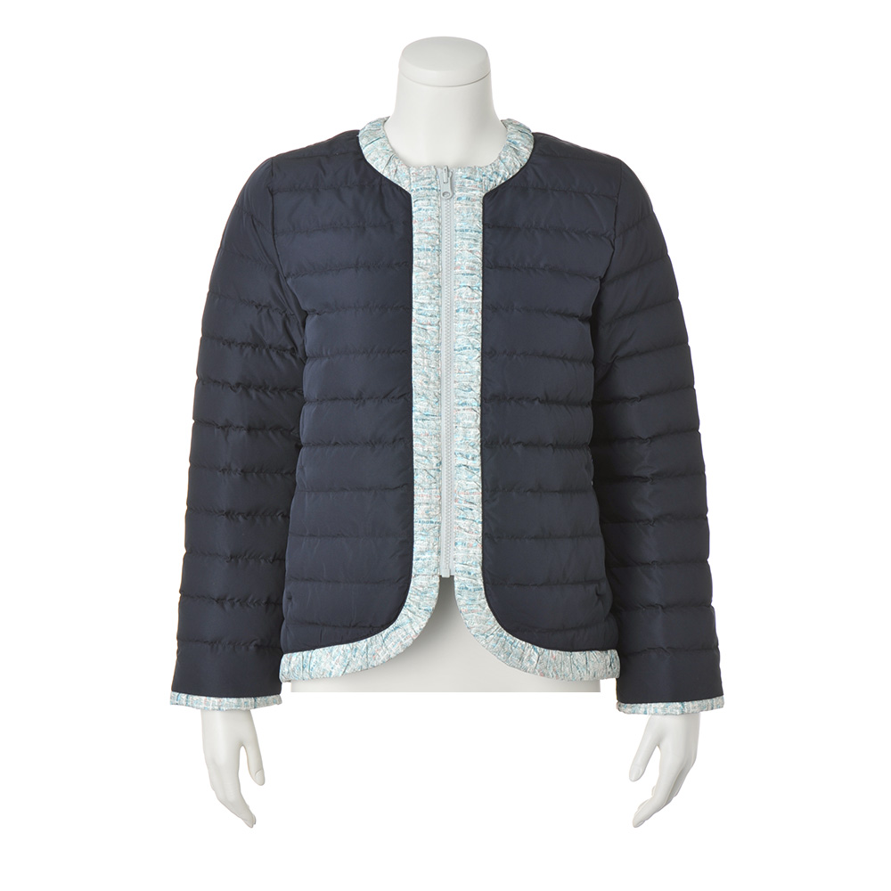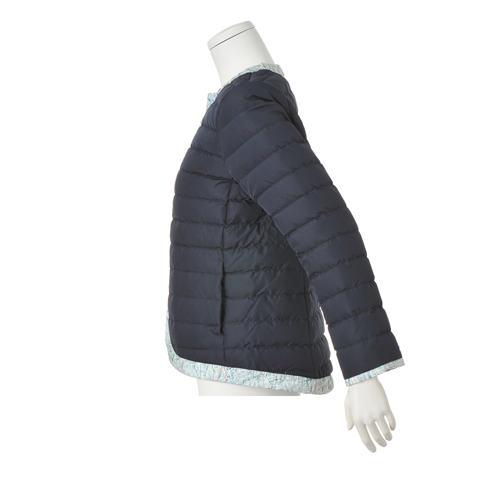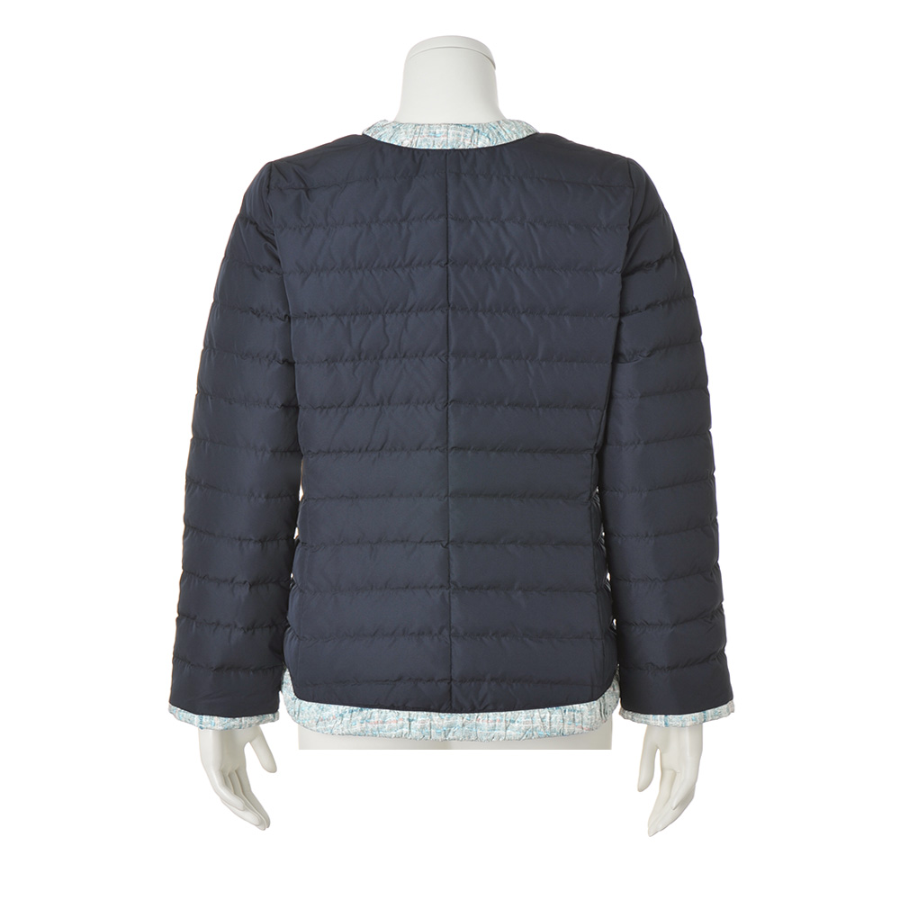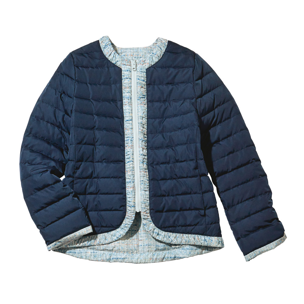 ICONIC OUTERこの冬の着こなしを格上げする、主役級アウター。機能性としゃれ感、どちらも欲張れる逸品をお届けします。ふたつの表情、どちらも本命無地と柄、気分で選べる一着二役ダウンジャケットその日の気分やシーンに合わせて、一着で2つの表情を楽しめる「リバーシブルダウンジャケット」。毎シーズン大好評のシリーズから、今年も待望のニューフェイスが登場しました。着心地のよさ、美シルエット、デザイン性の高さにこだわり、冬の着こなしの幅をぐっと広げてくれるアイテムとして活躍してくれるはずです。今年の新作では、片面に端正なネイビーの無地を、もう片面にはライトブルー系のファンシーツイードの転写プリントをあしらい、ベーシックなシンプルスタイルと華やかなエレガントスタイル、どちらにも対応できる一着に仕上げました。ネイビーの無地面には、襟ぐり・前立て・裾・袖口に、柄面のプリント生地のトリミングをほどこすことでさりげない遊び心をプラスして、印象的な着こなしが叶うデザインに。さらに、ギャザーを寄せたディテールや横段のキルティングステッチが、シンプルな無地ながらもニュアンスが増して、クラス感のある表情を引き立てます。一方、柄面は、あえてつるんとしたステッチレス仕立てに。艶やかな表情が、エレガントで気品のある装いにぴったりです。デザインは、ボディラインに沿うよう、立体的なパネル構造で仕立てることで、すっきりとしたシルエット設計に。さらに前端裾には、やわらかなカーブで丈感に変化をつけることで、フェミニンな表情に。カジュアルにも、きれいめにも対応でき、着こなしの幅が広がる便利な一着です。≫ 雨の日やお出かけにも頼れる嬉しい機能つき両面それぞれにポケットを備え、さらに、はっ水加工により水滴をしっかりと弾くので、天候がゆらぎやすい季節の変わり目や、雨の日のお出かけにも安心です。また、付属のポーチにくるっと丸めて入れれば、コンパクトに持ち運べるのも嬉しいポイント。旅行や観劇、ショッピングなど、荷物がかさばるシーンにも重宝するはず。細部にまで気を配った実用性に優れたディテールに加え、程よい厚みと軽やかな着心地を両立しました。気温が変化しやすい季節の変わり目や、寒さの厳しい真冬のインナーダウンにも、ロングシーズンで活躍。オン・オフ問わず頼れるアウターです。