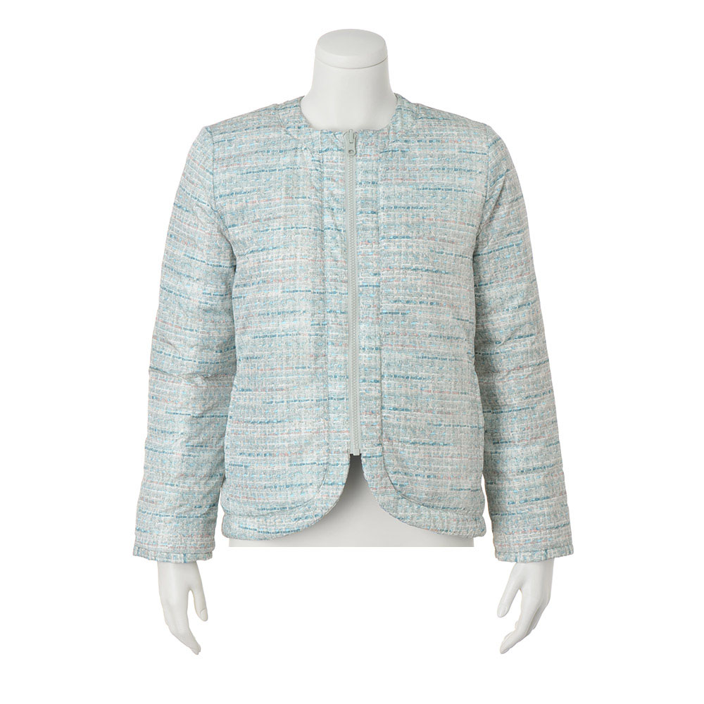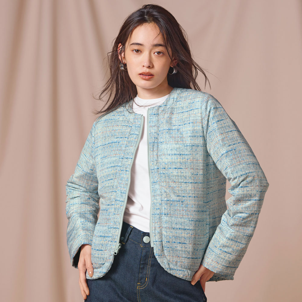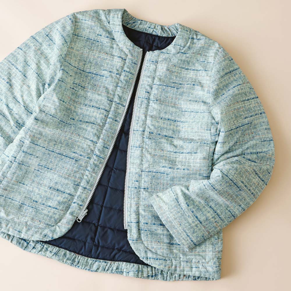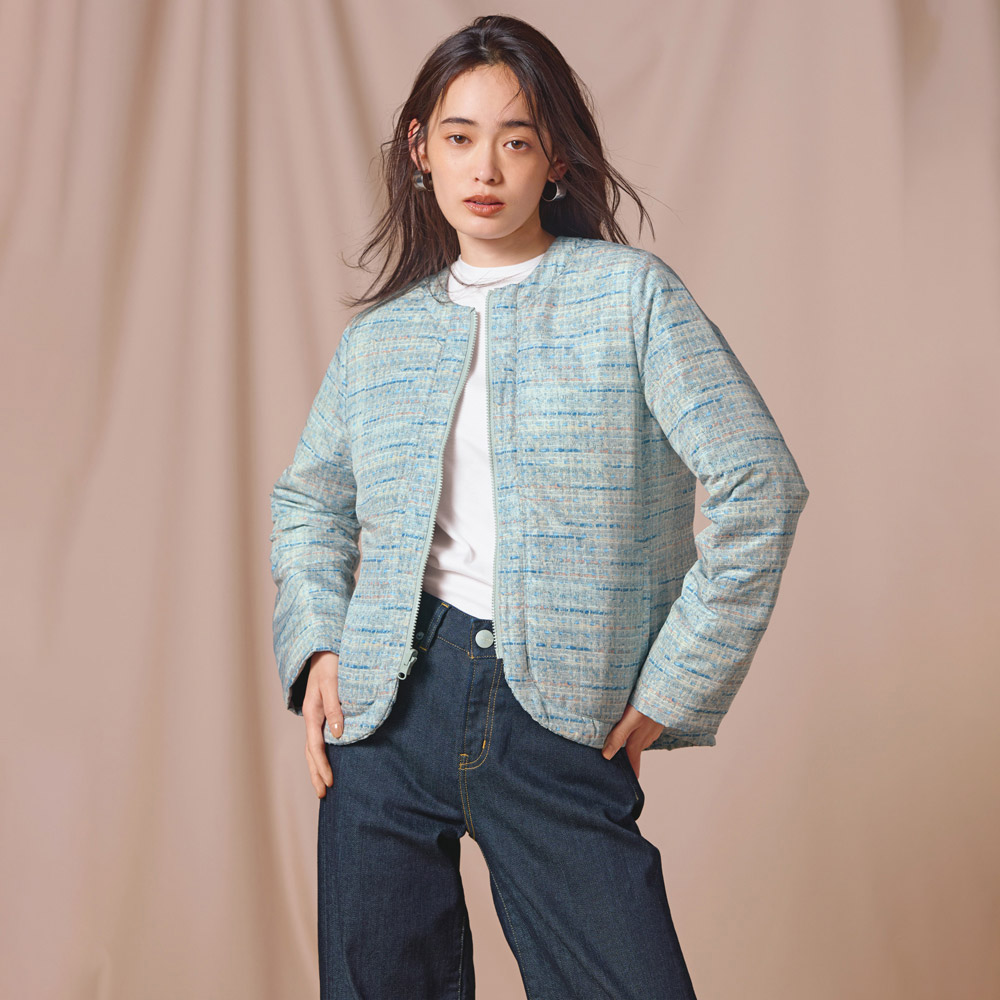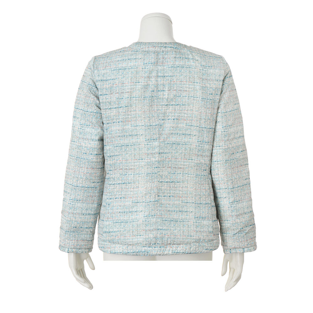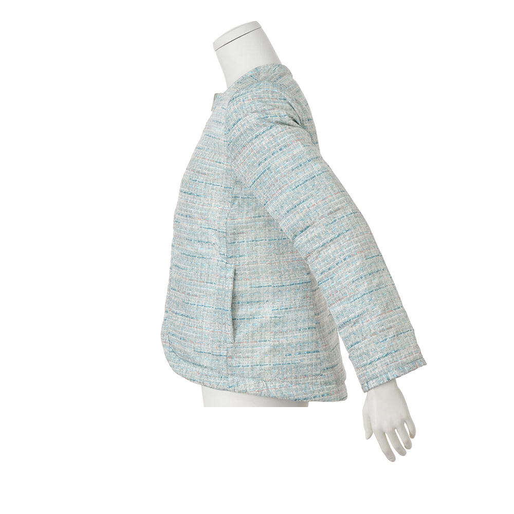 ICONIC OUTERこの冬の着こなしを格上げする、主役級アウター。機能性としゃれ感、どちらも欲張れる逸品をお届けします。ふたつの表情、どちらも本命無地と柄、気分で選べる一着二役ダウンジャケットその日の気分やシーンに合わせて、一着で2つの表情を楽しめる「リバーシブルダウンジャケット」。毎シーズン大好評のシリーズから、今年も待望のニューフェイスが登場しました。着心地のよさ、美シルエット、デザイン性の高さにこだわり、冬の着こなしの幅をぐっと広げてくれるアイテムとして活躍してくれるはずです。今年の新作では、片面に端正なネイビーの無地を、もう片面にはライトブルー系のファンシーツイードの転写プリントをあしらい、ベーシックなシンプルスタイルと華やかなエレガントスタイル、どちらにも対応できる一着に仕上げました。ネイビーの無地面には、襟ぐり・前立て・裾・袖口に、柄面のプリント生地のトリミングをほどこすことでさりげない遊び心をプラスして、印象的な着こなしが叶うデザインに。さらに、ギャザーを寄せたディテールや横段のキルティングステッチが、シンプルな無地ながらもニュアンスが増して、クラス感のある表情を引き立てます。一方、柄面は、あえてつるんとしたステッチレス仕立てに。艶やかな表情が、エレガントで気品のある装いにぴったりです。デザインは、ボディラインに沿うよう、立体的なパネル構造で仕立てることで、すっきりとしたシルエット設計に。さらに前端裾には、やわらかなカーブで丈感に変化をつけることで、フェミニンな表情に。カジュアルにも、きれいめにも対応でき、着こなしの幅が広がる便利な一着です。≫ 雨の日やお出かけにも頼れる嬉しい機能つき両面それぞれにポケットを備え、さらに、はっ水加工により水滴をしっかりと弾くので、天候がゆらぎやすい季節の変わり目や、雨の日のお出かけにも安心です。また、付属のポーチにくるっと丸めて入れれば、コンパクトに持ち運べるのも嬉しいポイント。旅行や観劇、ショッピングなど、荷物がかさばるシーンにも重宝するはず。細部にまで気を配った実用性に優れたディテールに加え、程よい厚みと軽やかな着心地を両立しました。気温が変化しやすい季節の変わり目や、寒さの厳しい真冬のインナーダウンにも、ロングシーズンで活躍。オン・オフ問わず頼れるアウターです。