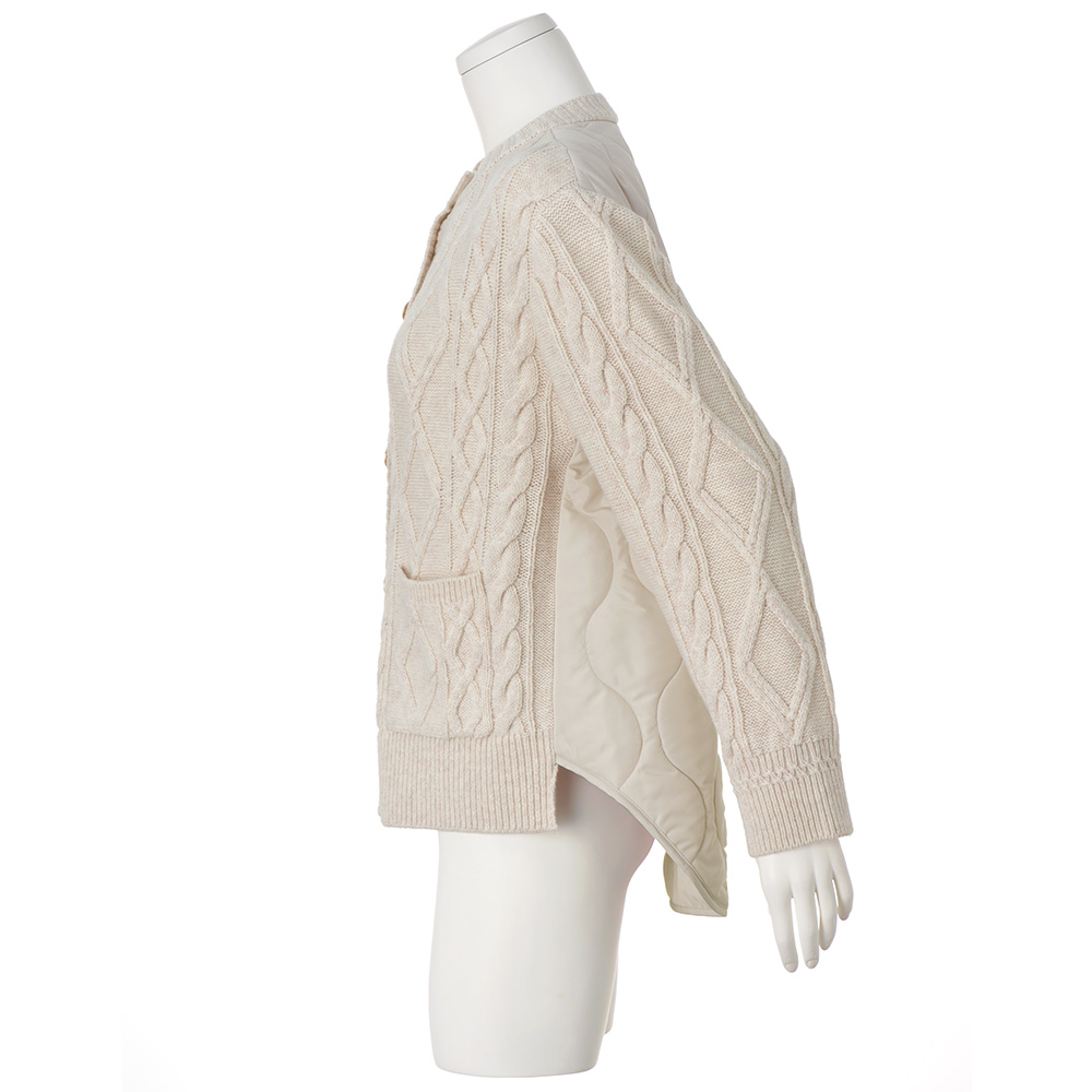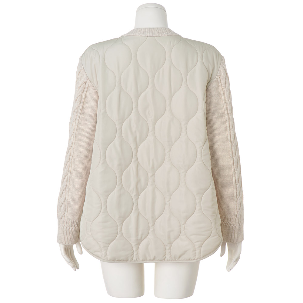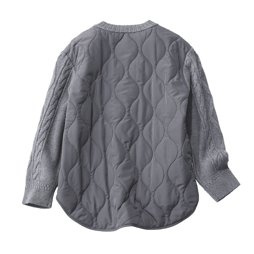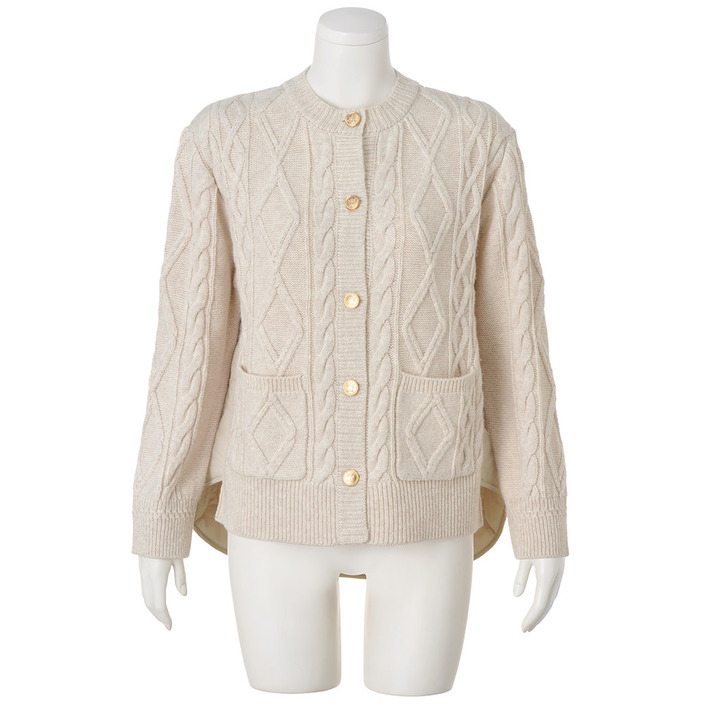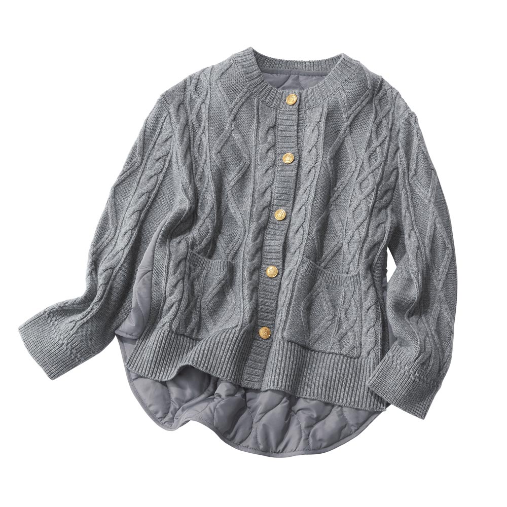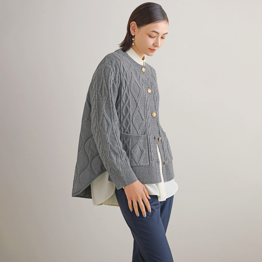 あたたかくてすっきり見え!一着で映える便利なコーディガン前身頃はケーブル編みの立体感が特徴的なウール混ニットで、後ろ身頃はタフタ生地の中わたキルティングを組み合わせた一着。中わたは薄いシートを使っているため、ゴワつかずにすっきり。アウターの下にも着られて、羽織りものとしても大活躍します。後ろ裾はフィッシュテールデザインで体型カバーも◎。
