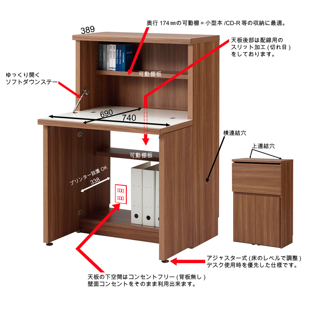 デスク下段の棚は背板がないので、壁のコンセントが使えます。
