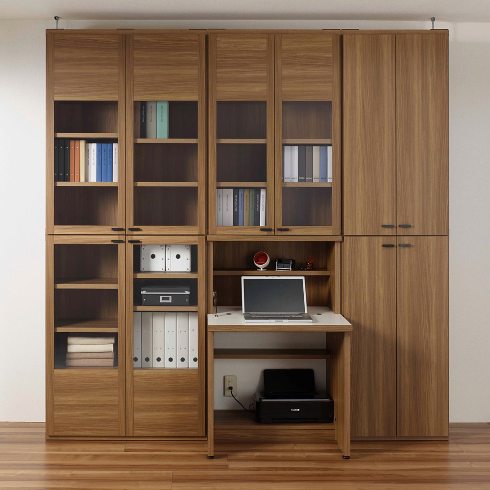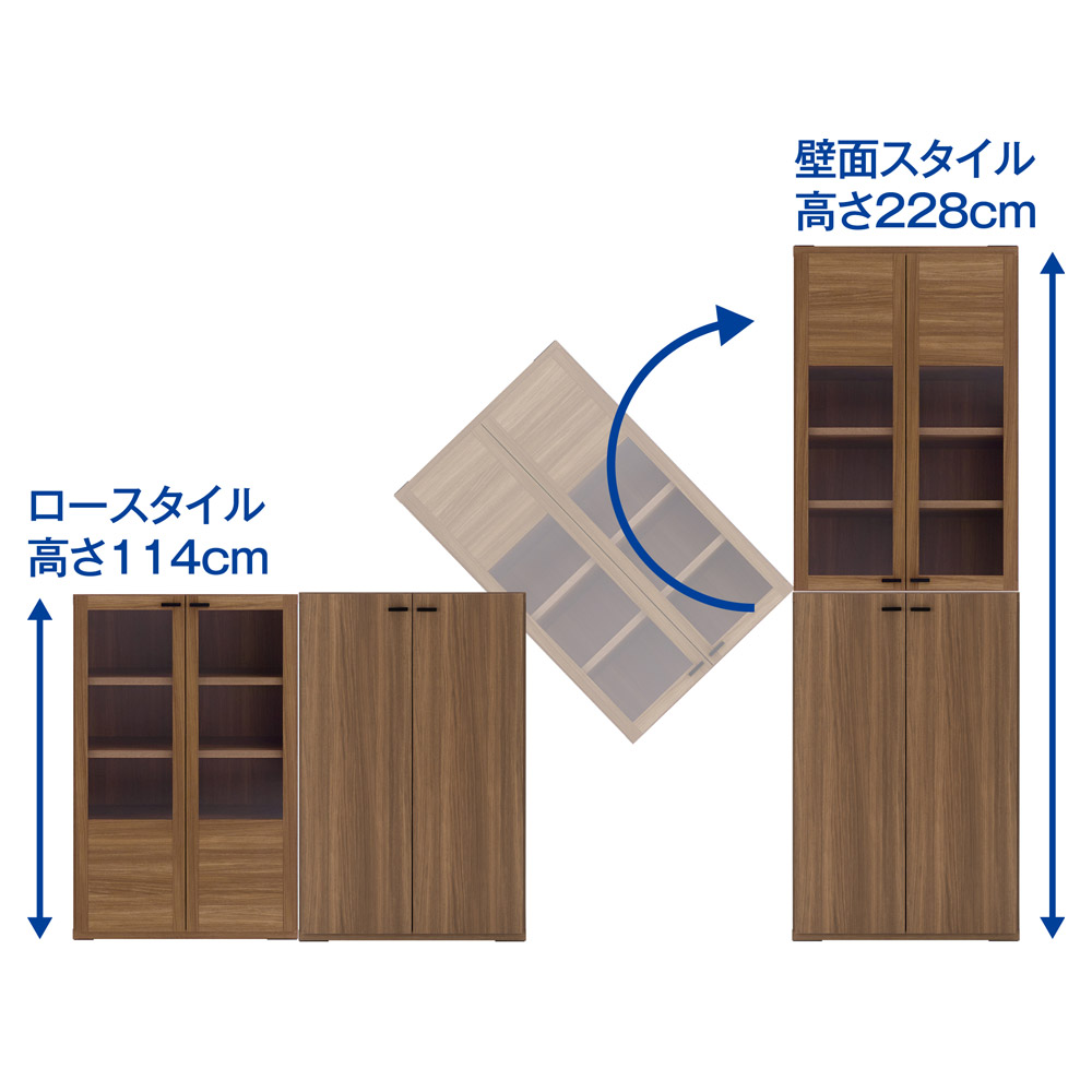 本商品は「≪ガラス扉 幅60cm×2台≫重厚感のあるがっちり本棚 ガラス扉上下セット高さ228cm+天井突っ張り金具」です。リビングや書斎に、重厚感がありつつも見た目がすっきりとしたモダンな本棚。 届いたその日、あっという間に本格的な書斎が実現できる扉付きの書棚です。上下に重ねた高さは228cm。付属の天井突っ張り金具は高さ236〜246cmの天井に対応。 自分好みに簡単にカスタマイズできる、幅と扉とカラーのバリエーションをご用意しました。大切な本や収納物を日焼けやほこり汚れから守る扉付きの本棚◆収納物が見やすく、飾り棚としても使えるガラス扉の本棚。 60cm・74.5cm・90cm。3種類の幅が選べる扉付きブックシェルフです。 重ねた高さは228cmです。◆シンプルで無駄のないデザイン。ウォルナット柄のブラウンと、優しい木目のホワイト。 インテリアに合わせやすい2色です。◆完成品でお届けしますので、リビングルーム、ベッドルームに、本格的な書斎が簡単に実現できます。こだわりの設計、安心品質の国産家具◆可動棚は3cmピッチで高さ調節可能です。◆内寸35cmのゆとりある奥行きで、ファイルボックスや大きい書籍も収納できます。◆棚板は厚み2.5cmの丈夫な仕様です。◆ホルムアルデヒド放散量の少ないF☆☆☆☆素材を使用しています。◆壁にぴったり設置できる幅木よけ仕様です(1cm×10cm)。 コードを通すこともできます。◆壁面に固定できるI字金具も付属しています。 天井高さが天井突っ張り金具対応範囲外の場合にご使用ください。