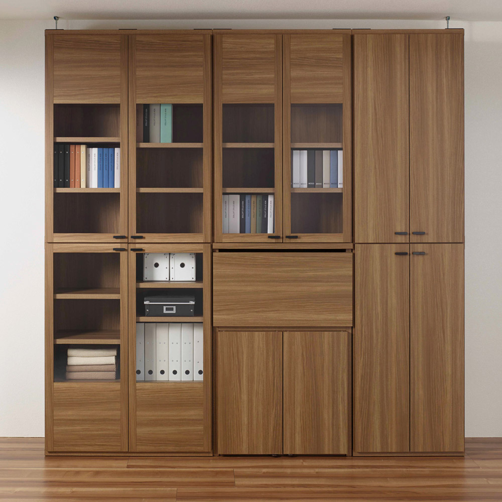 左側がガラス扉幅90cm本棚セット。シリーズ商品とのコーディネート例です(ア)ブラウン