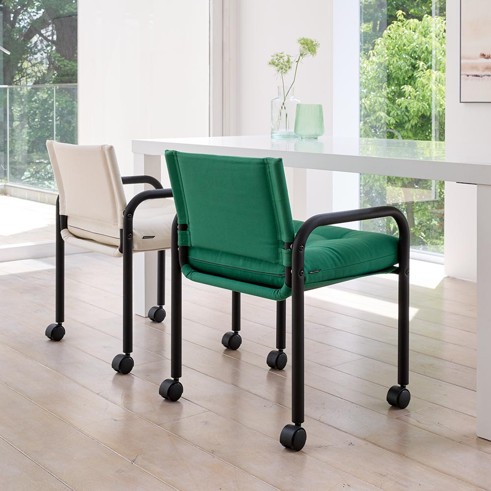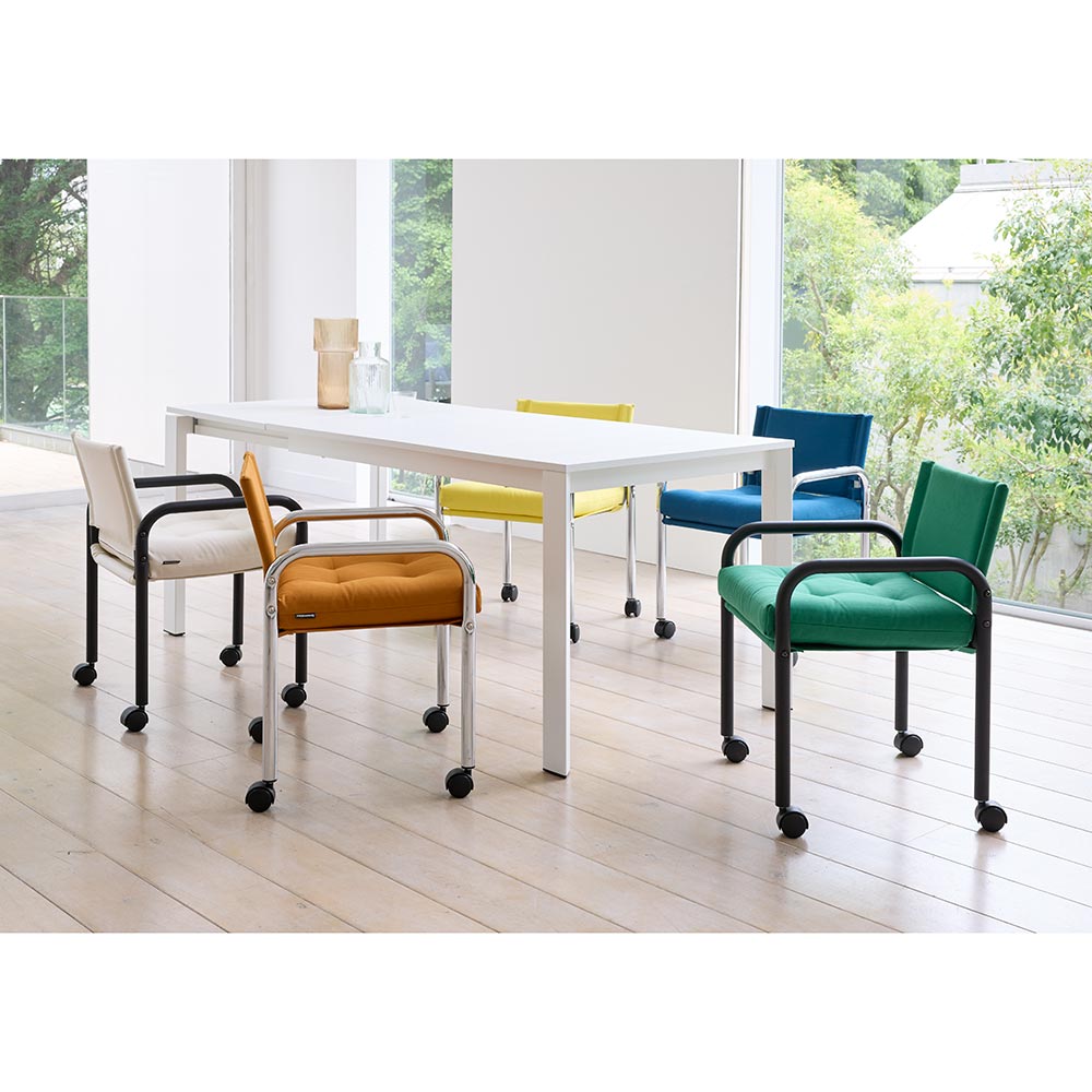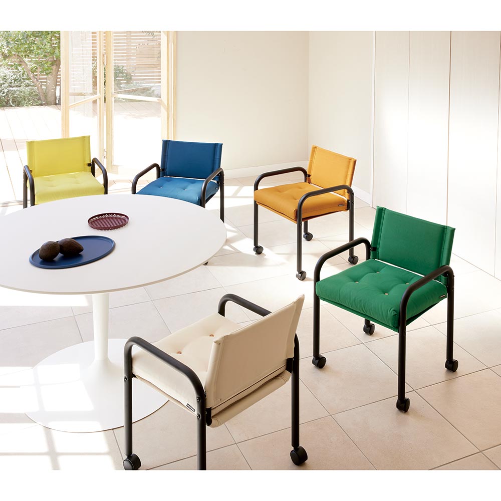 楽しく自由に大切にずっと使える”ちょうど良い”椅子スウェーデン生まれの北欧ブランド・イノベーターの定番アイテム、愛称は「キャプテンチェア」時代を超えて愛される機能的なシンプルデザイン。ヨットをイメージして「キャプテン(船長)」と名付けられました。しっかりした座り心地とキャスター付き。ダイニングからデスクそばまで多彩に活躍。しっかりした金属のボディに、ふっくらした座面、ぴんと張った布で背中を支える背もたれなど、他のチェアには見られない独特な形。食卓椅子としては勿論、キャスター付きの動かしやすさ、肘・背もたれのフィット感などデスクチェア・オフィスチェアとしても重宝。ブランド:innovator/イノベーター1969年、次々にモノを人々が競い合うように買っていた時代にイノベーターは誕生。当時、木のフレームにスプリングを使用した重い椅子やソファが一般的で、スチールとクッションのみで構成されるデザインは斬新。座り心地がよく機能的、既成概念にとらわれない発想が共感を呼び、イノベーターのモノ作りの精神は世界中で支持されたのです。北欧の暮らしの文化を表現するインテリアブランド「いい家具に出会ったら長くつき合う」「壊れたら修理してまた共に暮らす」。北欧ではずいぶん昔からエシカルな考えを暮らしに取り入れてきました。イノベーターはその北欧文化を反映させ、家具と長く付き合っていくために交換用パーツを用意しています。実際、家族の思い出とともにある家具をずっと使い続けたいと、10年、20年と愛用された方からの修理の依頼も少なくありません。長く大切に物を使う北欧文化。専用の替えカバーを・替えクッションをご用意大切に物を使い、次世代につなげていく文化が根強く残る北欧のスタイルを継承し、アフターサービスにも対応。交換用カバーやパーツが購入可能だから、長期間使用して傷んだり汚れても、まだまだ使い続けることができます。北欧の意思を受け継ぎ再現する日本製の技術力現在、日本で販売されるイノベーターの家具は全て日本国内で生産されています。製作に当たるのは高度な技術が求められる業務用家具を長年作り続けている工場。ブランド設立当時から長く愛され続けているスウェーデンデザインを保ったまま、より強度と耐久性を高められるよう綿密に設計。カバーの縫製から組み上げまで、一点一点熟練の職人によって作られています。