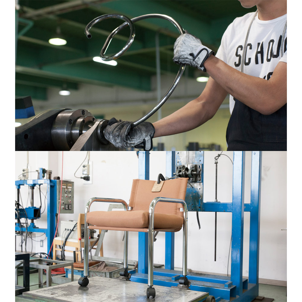 特殊な機械を使い曲げられたスチールパイプとカバーを組み合わせて仕上げます。工場内にある検査ルームでは、強度試験や安全性など細かいチェックが行われています。