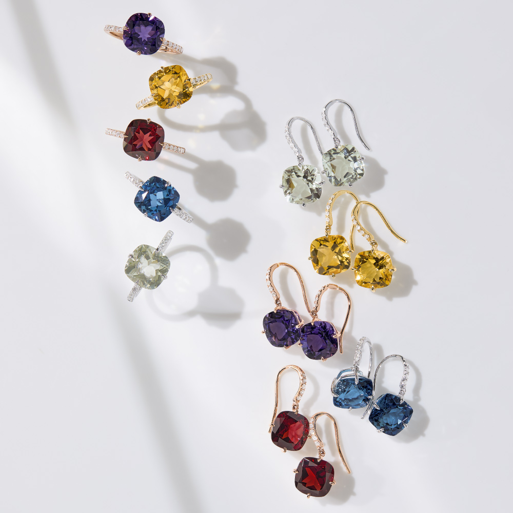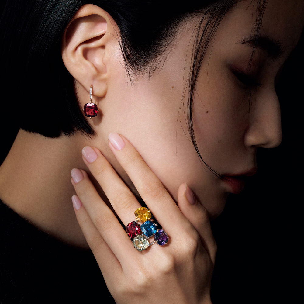 ブリリアントな華やぎ色をクールなスクエアフォルムでスタイリッシュに纏う奥深い煌めきと甘すぎないシェイプが魅力のクッションカット。大粒石の輝きを主役に、それぞれ地金の色も吟味し、極小の4本爪で繊細にセットしました。アームのダイヤラインが、綺麗な色をより鮮烈に印象付けます。リングを重ねたり、ピアス(商品番号:J00302)とセットにしたり、美しい色と輝きの調和を心ゆくまで。