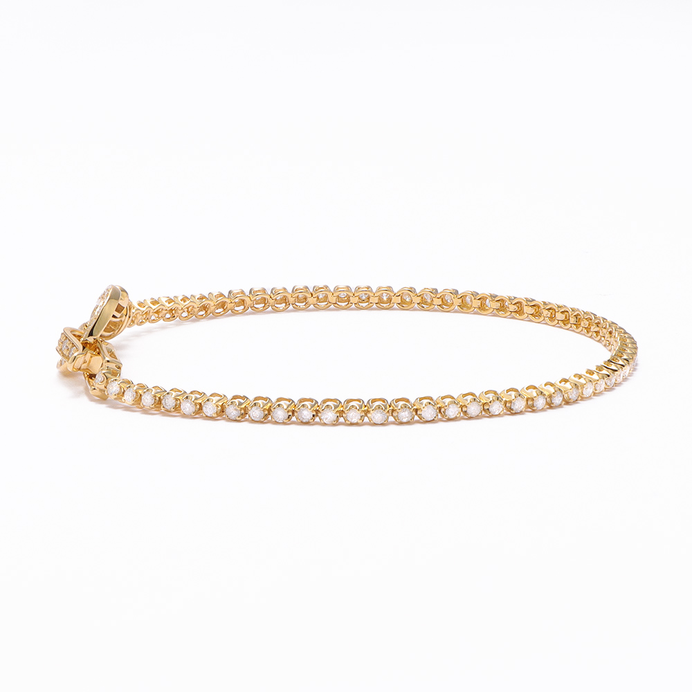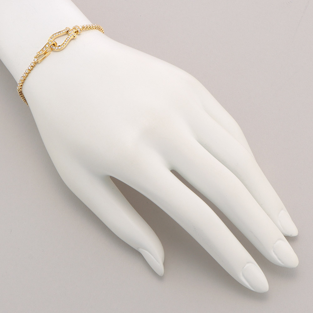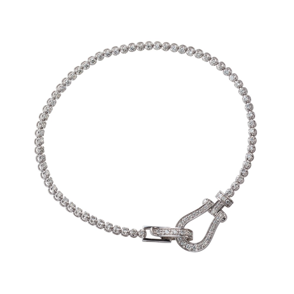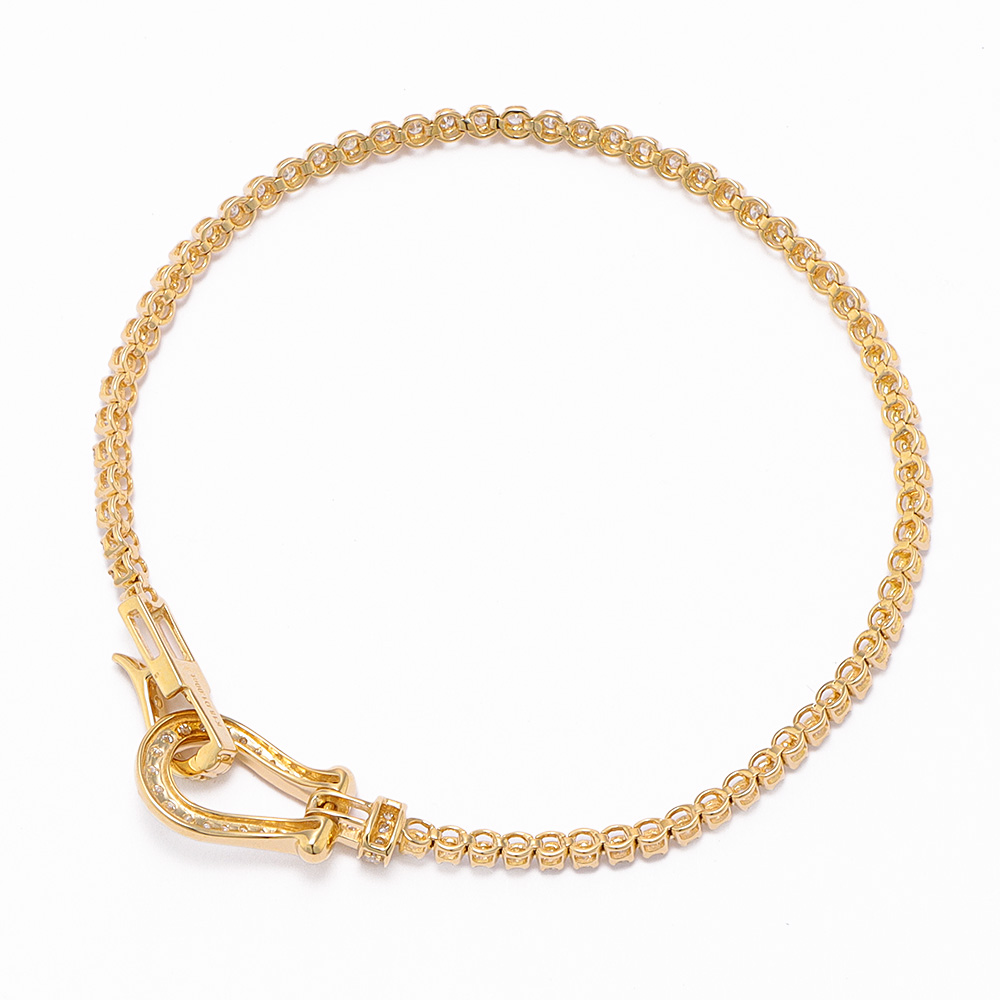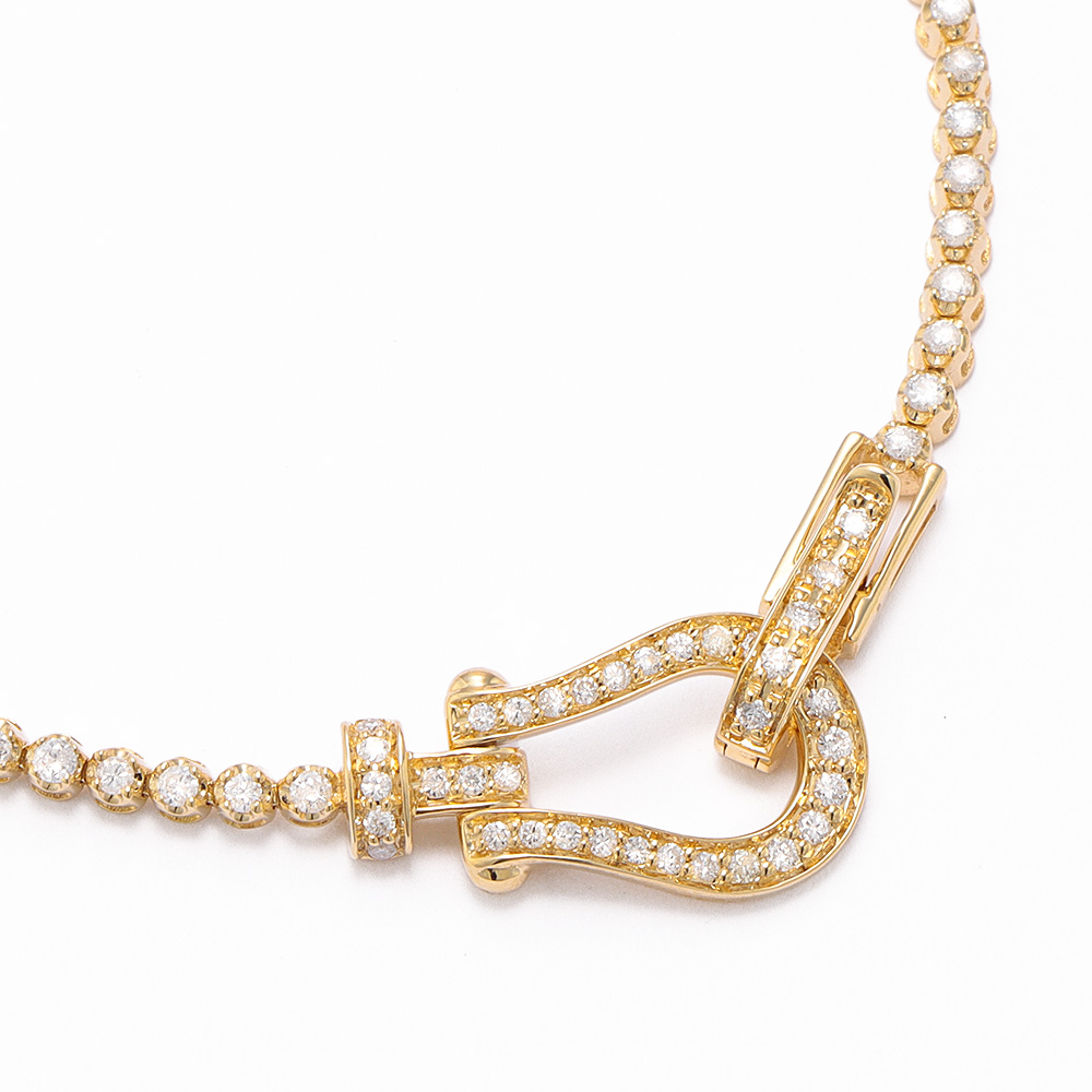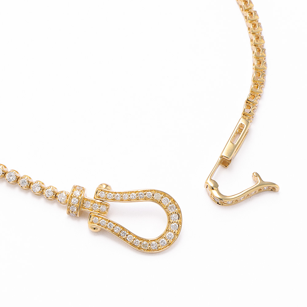 ラッキーモチーフ「ホースシュー」を象ったテニスブレスレット。ダイヤを贅沢に使ったラグジュアリーな輝きで、リュクス&マチュアなコーディネートに。