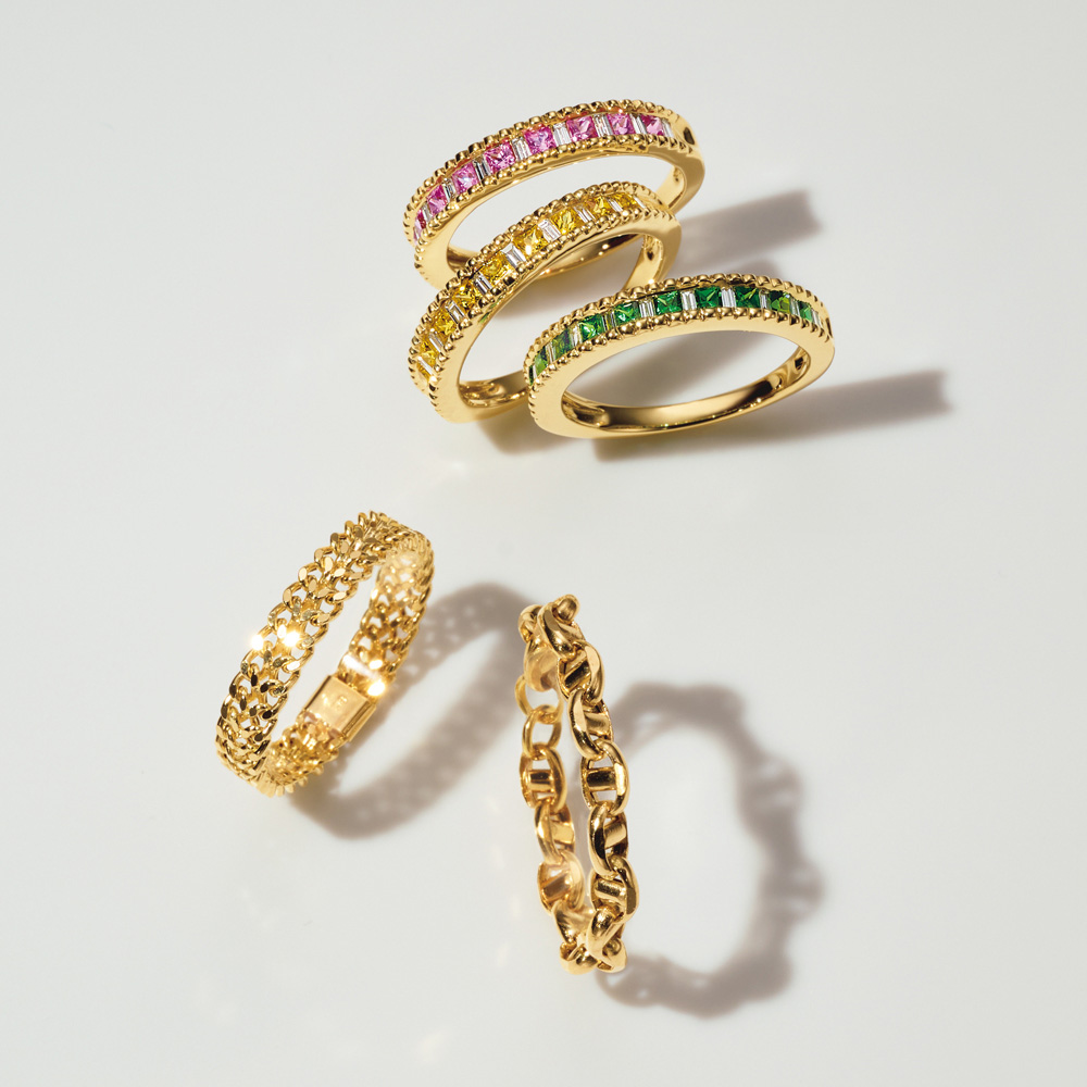 (中指上から)(ア)ピンクサファイア (ウ)グリーンガーネット (イ)イエローサファイア コーディネート例 /色石と指にしなやかにフィットするチェーンリングを横に並べたレイヤードが新鮮。
