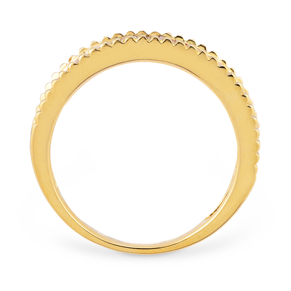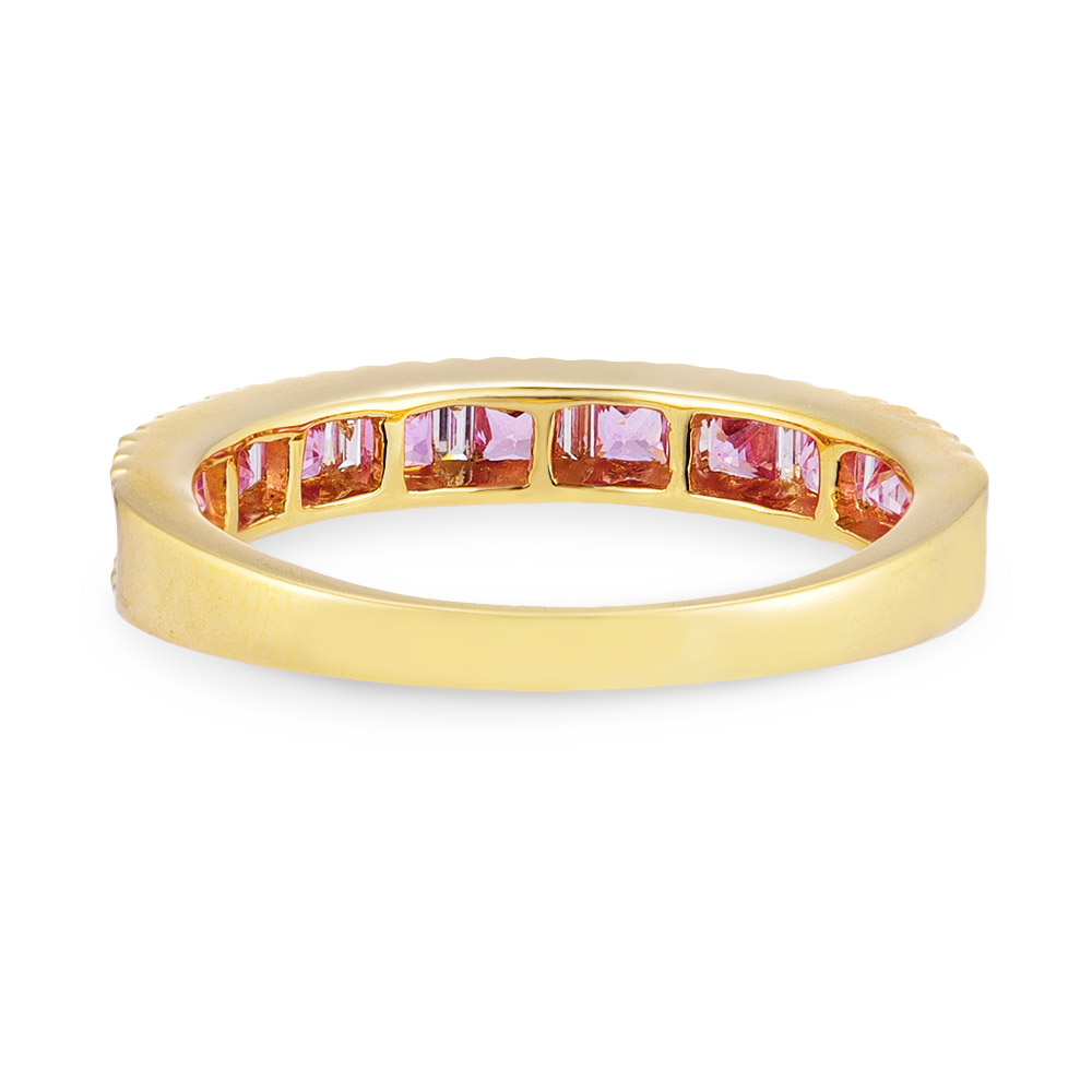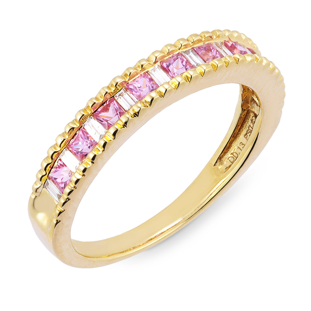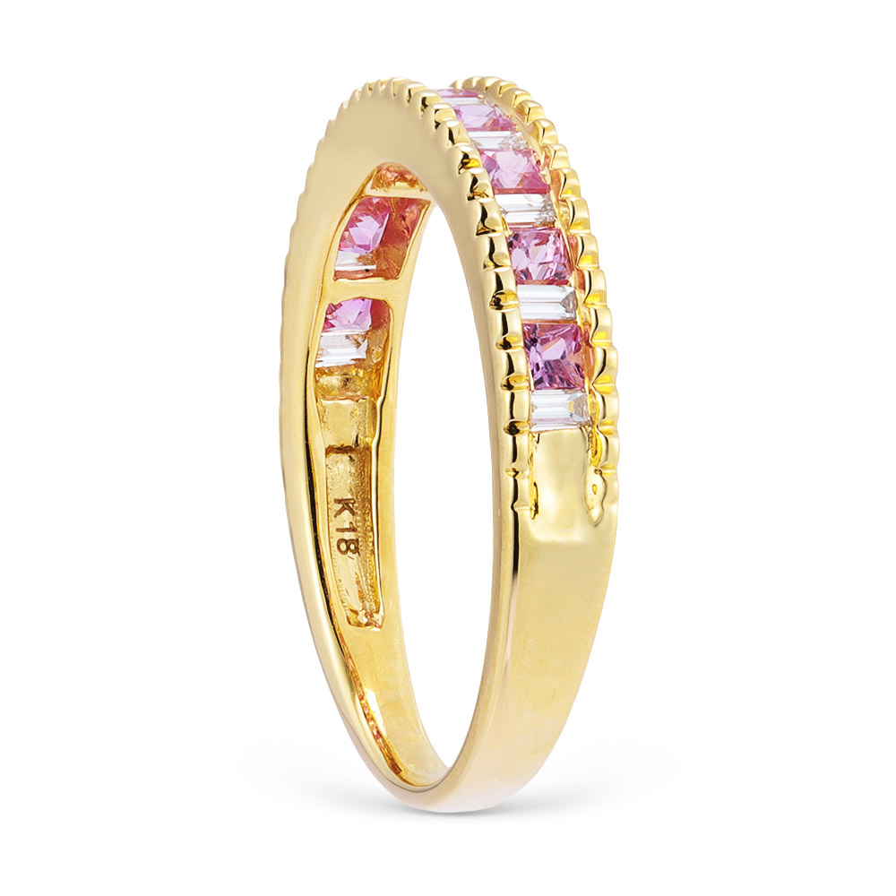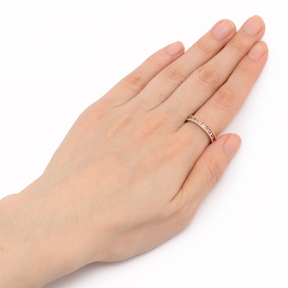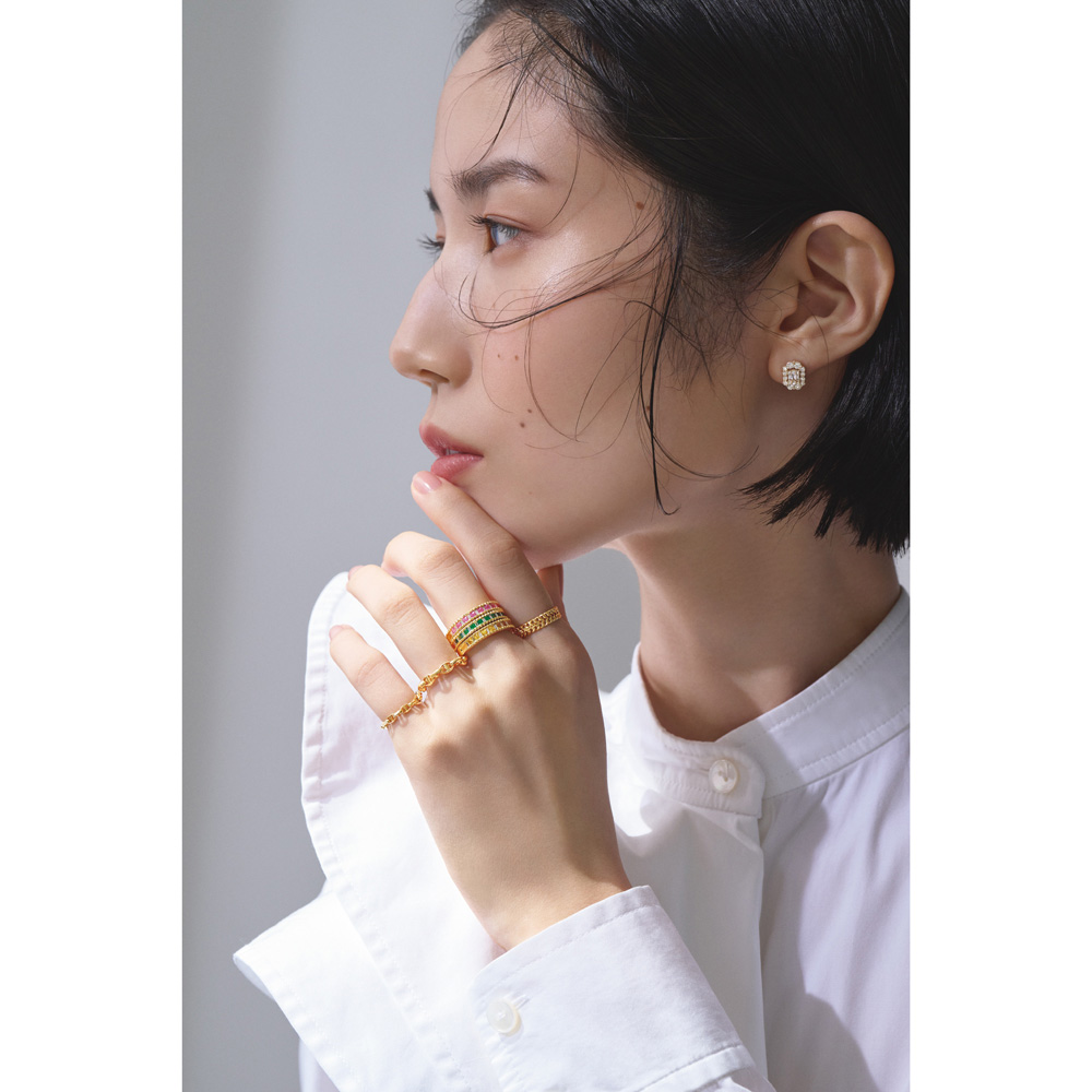 装いに旬を吹き込むジュエリー・トレンド洗練されたムードのカギとなる旬のジュエリーと、洒落て見えるアレンジ法で装いをアップデート。プリンセスカットの色石とバゲットダイヤが交互に並ぶエタニティリング。