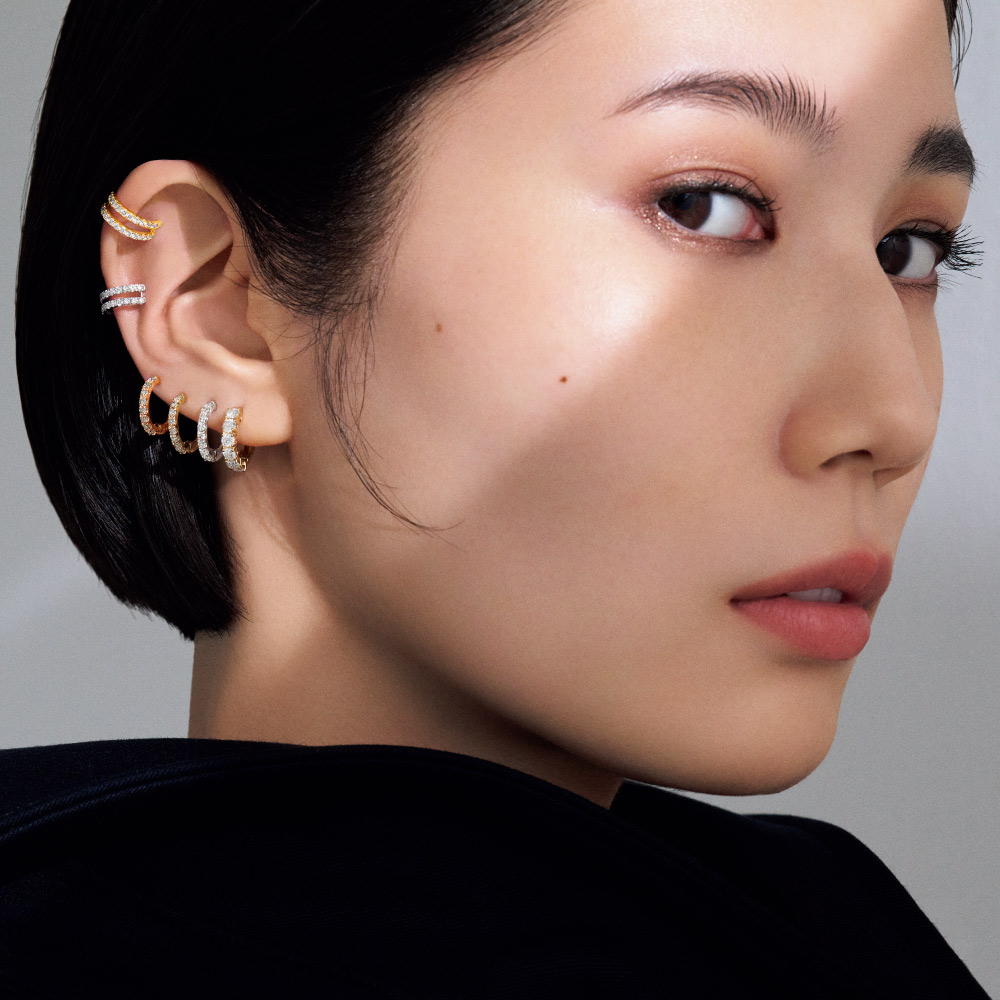 コーディネート例 /耳元に重ねたダイヤモンドラインの瞬きが華やかに表情を照らして