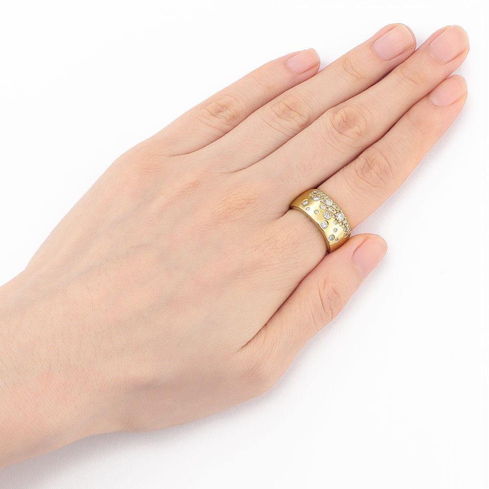自信と誇りに満ちたステートメントな輝きを地金をたっぷり使ったリングにダイヤをセット。輝きが雪のように降り積もる躍動感ある意匠が、手指をほっそりと見せます。