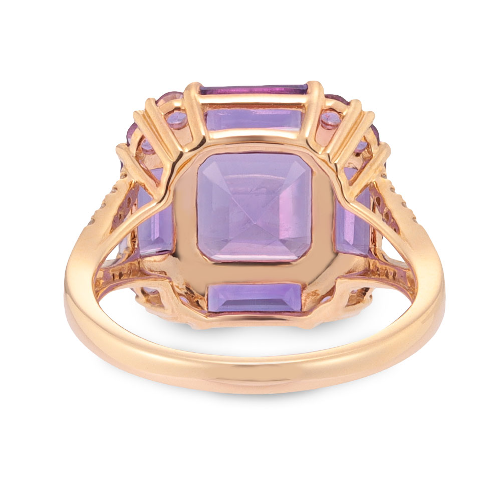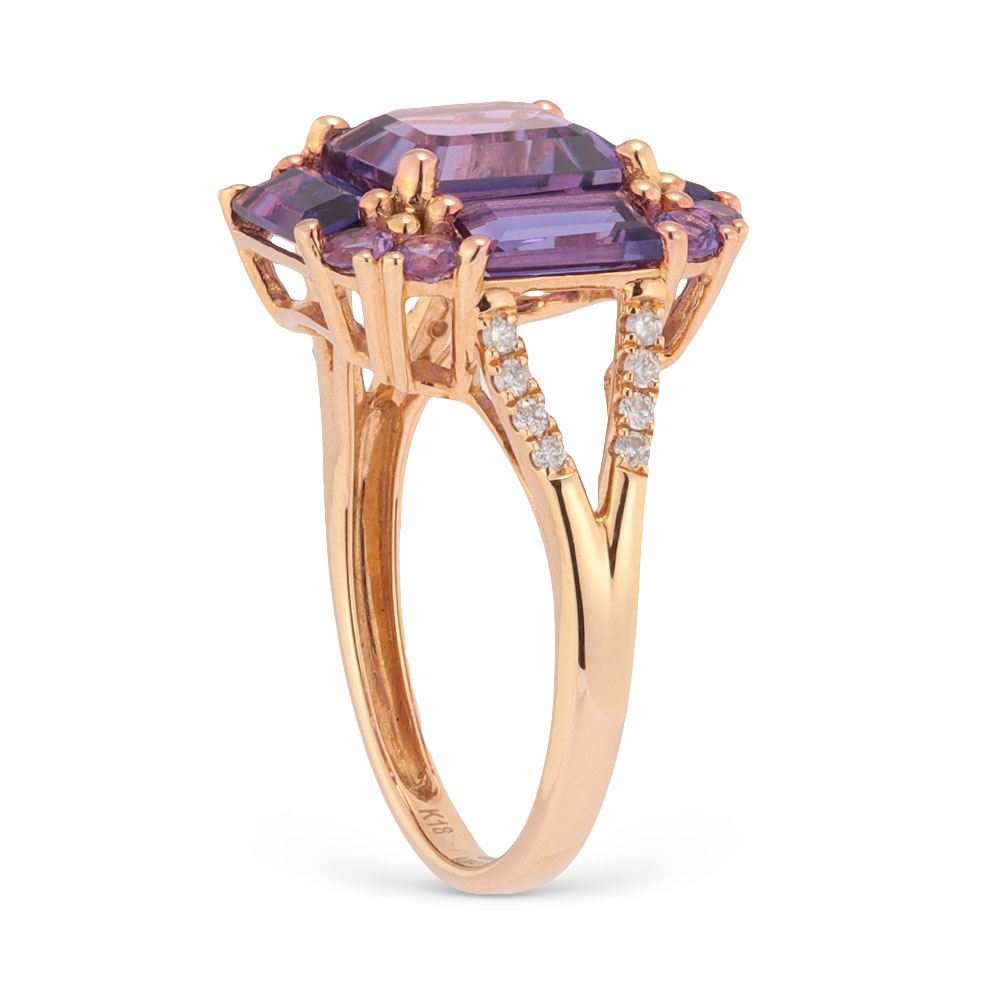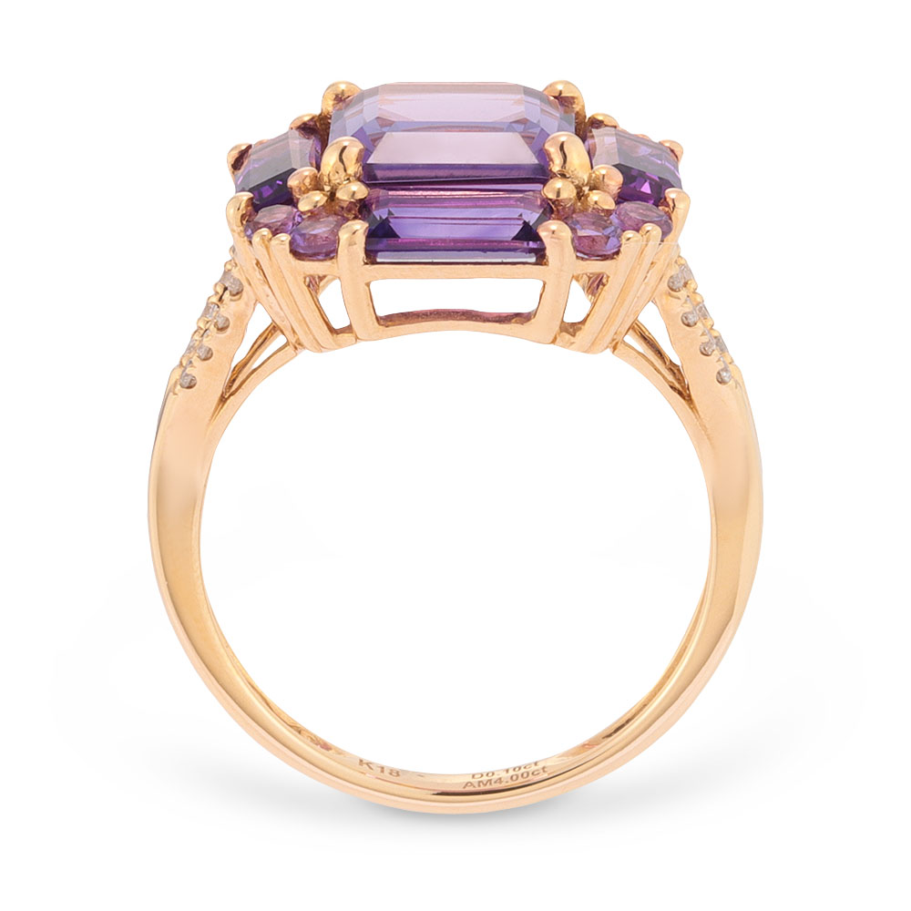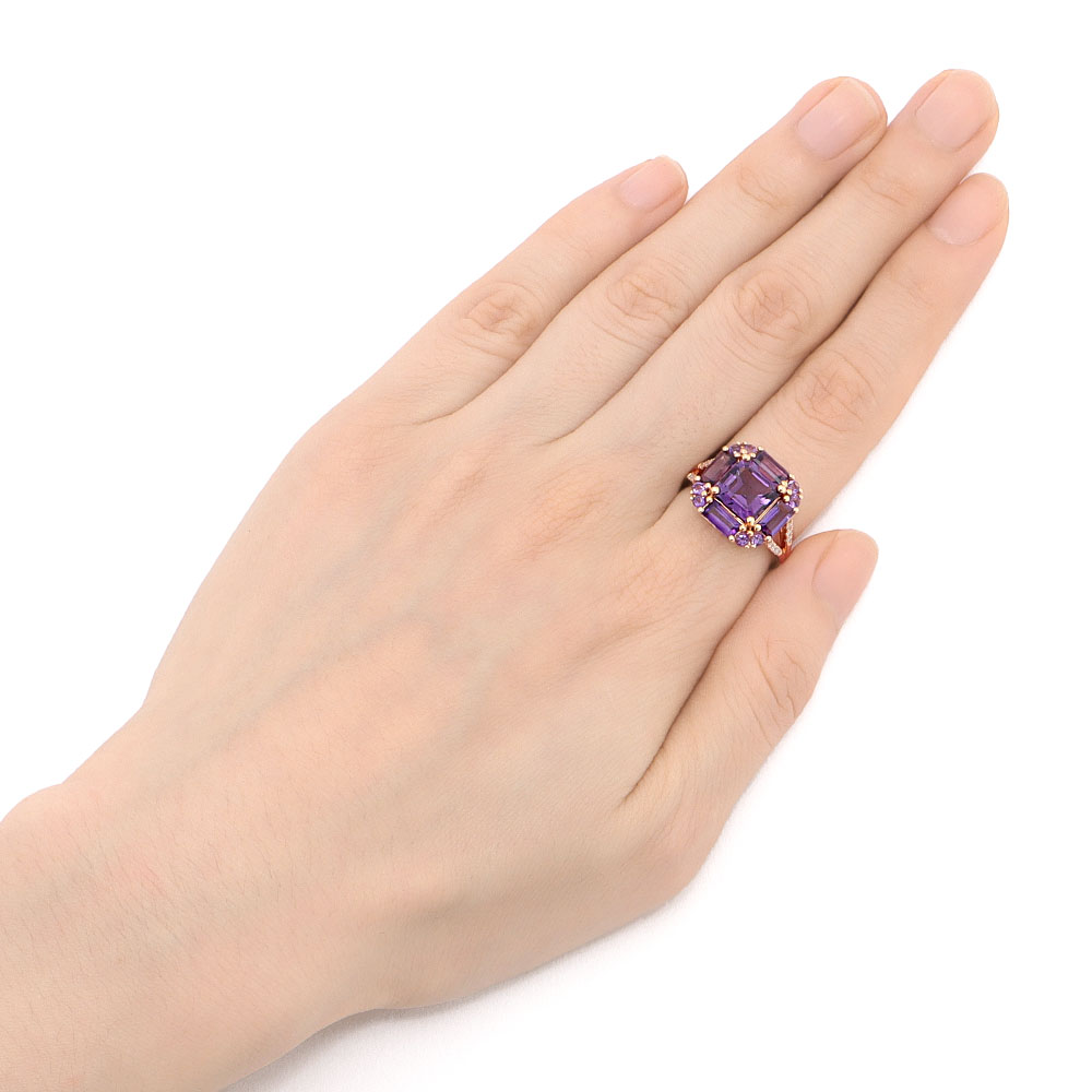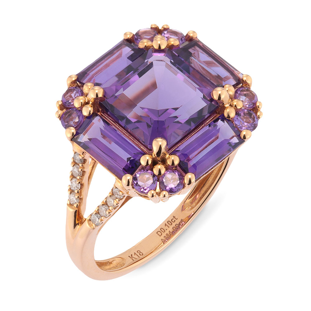 EXPRESS YOUR FEELINGS個性を彩る色石の演出感性に導かれるように纏うカラーストーンジュエリーは、アイデンティティを瑞々しく表現してくれるアイテムです。デザイン×配色で遊んだコーディネート例と共にご注目を。様々なカットのアメシストで大きなクッション形に。リングアームに配したダイヤがフォルムの美しさを印象的に演出します。