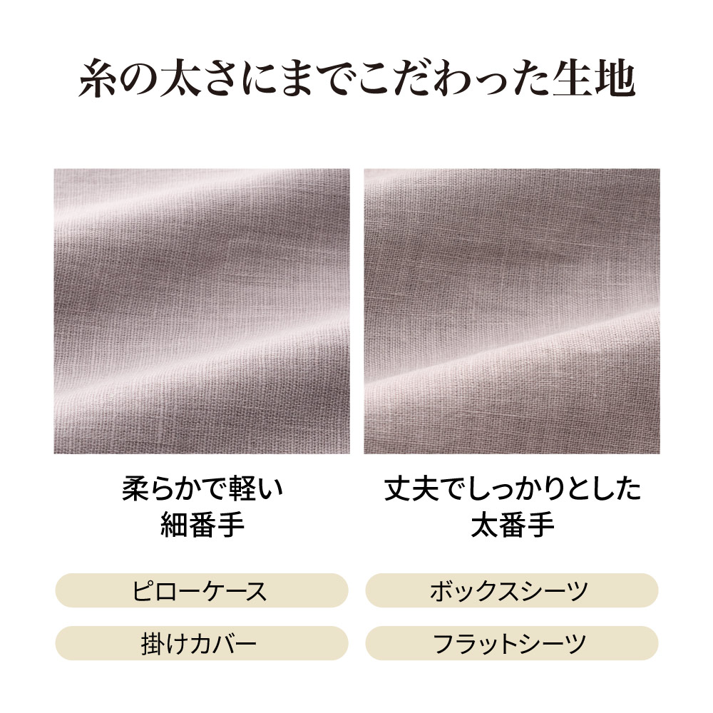 とびきりやさしい肌ざわりと美しい佇まいのリネン100%カバーリング。やわらかさと耐久性を両立したボックスシーツは、干しやすくたたみやすい形状にもこだわりました。なめらかさと美しさで、一年中眠り心地を底上げ。(イ)グレイッシュパープル とびきりやさしい肌ざわりと美しい佇まいのリネン100%カバーリング。やわらかさと耐久性を両立したボックスシーツは、干しやすくたたみやすい形状にもこだわりました。ピローケースと掛けカバーは軽さとやわらかさを出すため細番手の糸、ボックス&マルチシーツはやや太番手の糸で耐久性をアップするなど、アイテムごとに糸の番手を変えるこだわりぶり。国内工場独自の仕上げ技術により、柔軟剤を使わずソフトでなめらかな風合いに仕上げています。さらに使い込むほどやわらかく味わい深い表情に。マチが30cmと広く、厚みのあるマットレスにも対応。全周ではなく四隅にだけゴムを入れることで、広げたときクシャクシャにならず、干しやすくたたみやすいこだわりの形状です。同色で揃えても、異なる色を組み合わせても素敵なニュアンスカラー