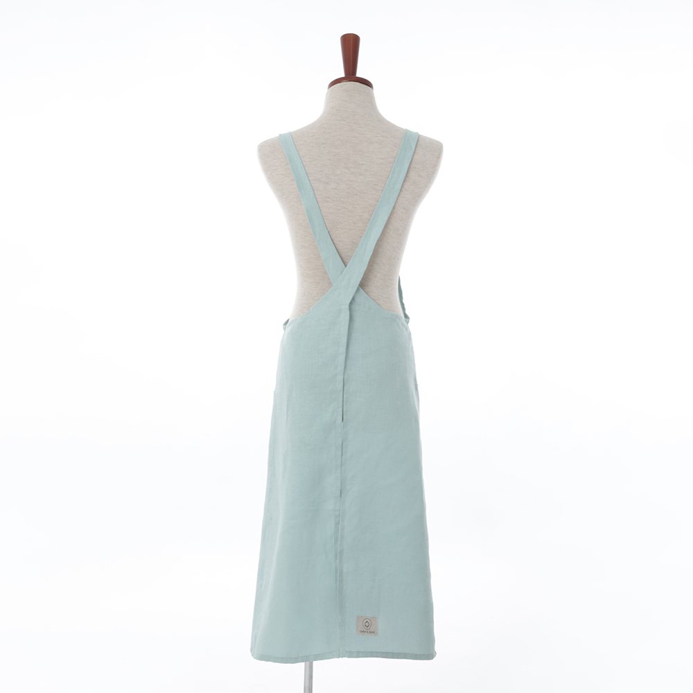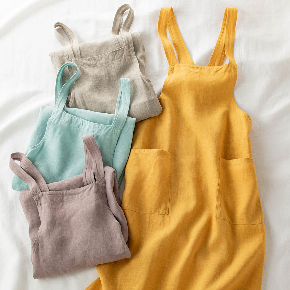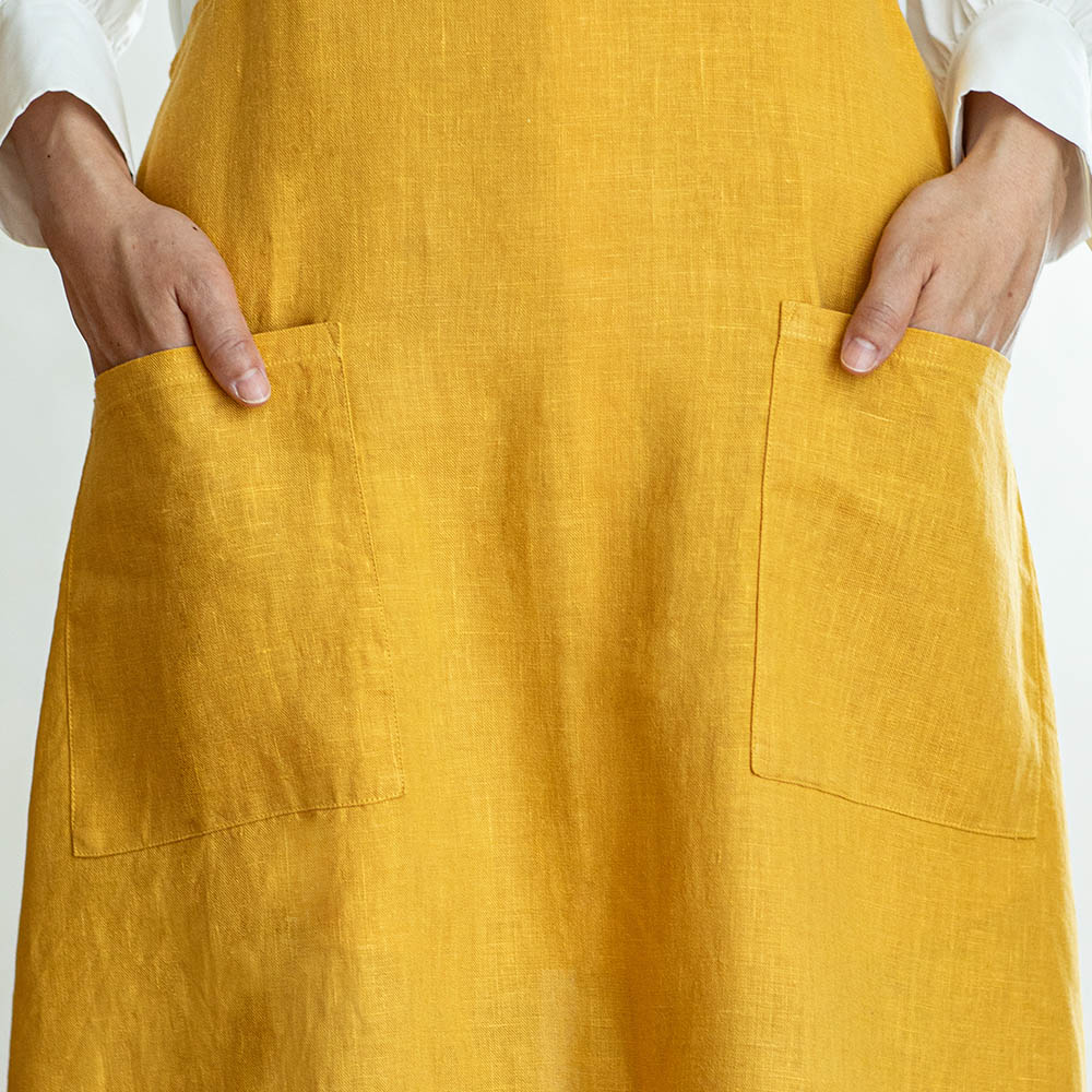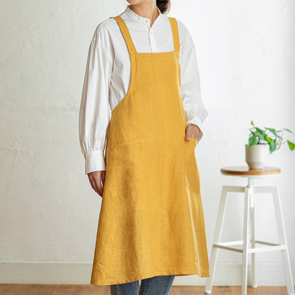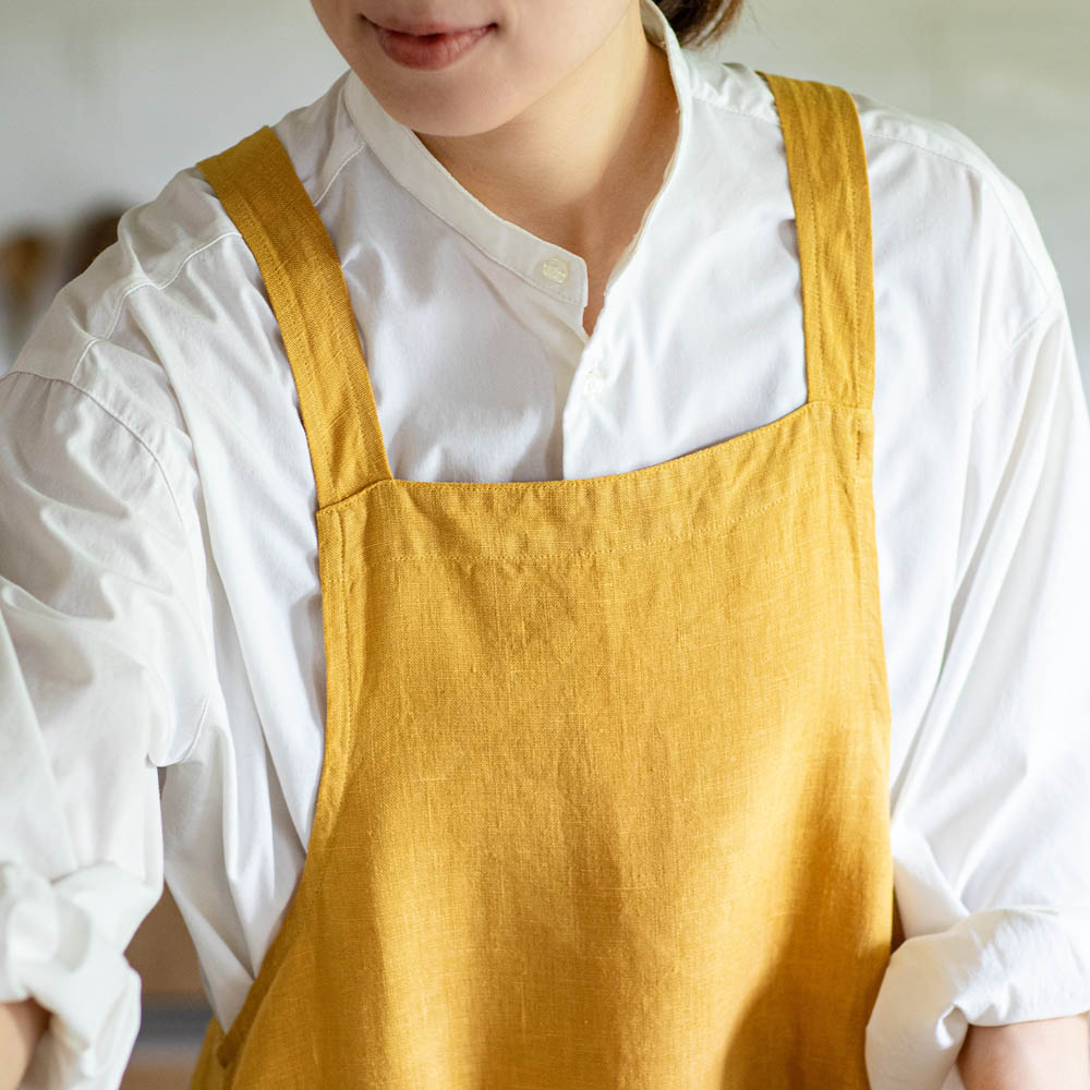 リネンはエプロンにぴったりの素材。特有の光沢感も美しく、使うほど柔らかい風合いに変化するのも魅力です。