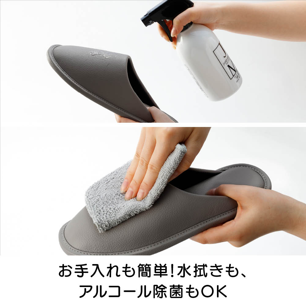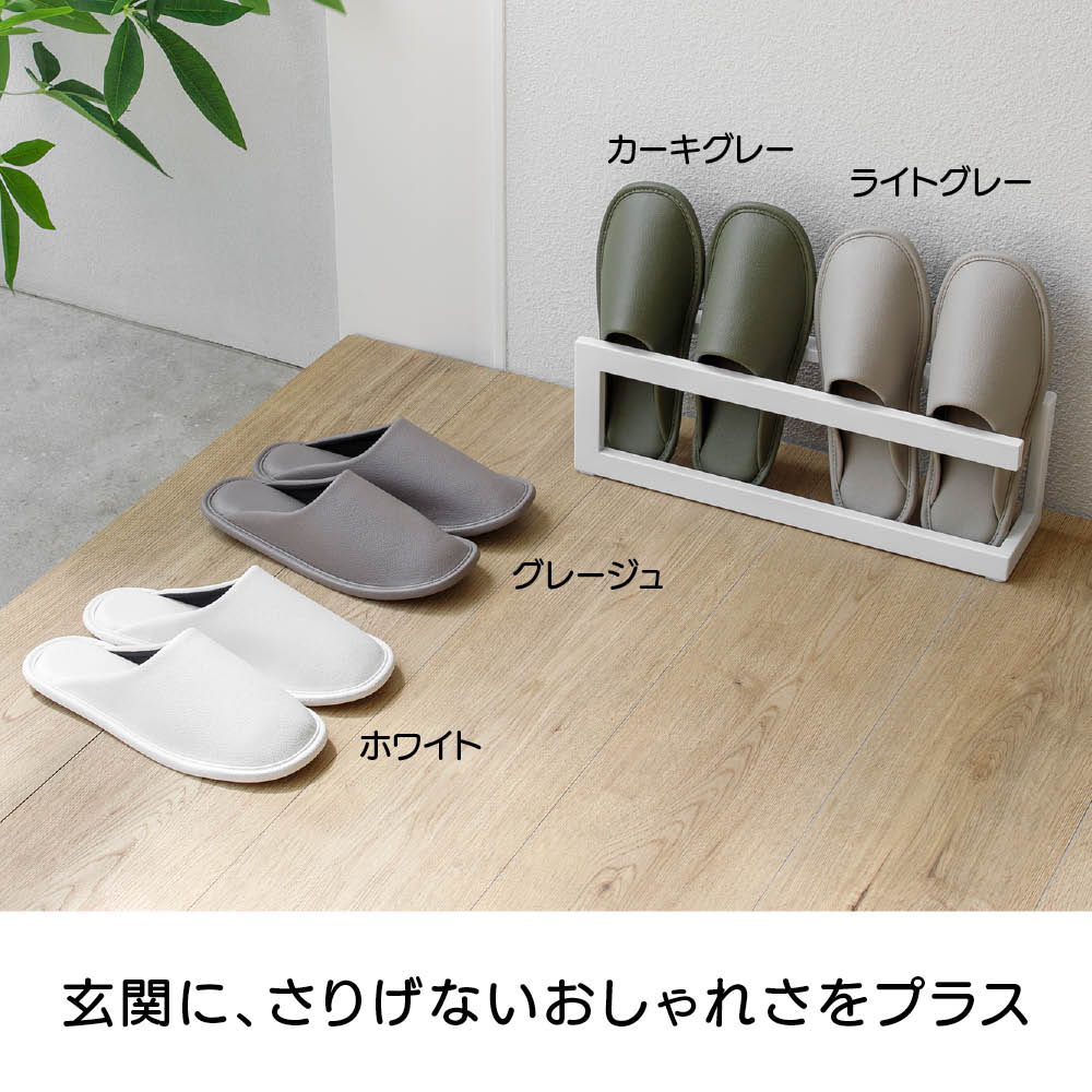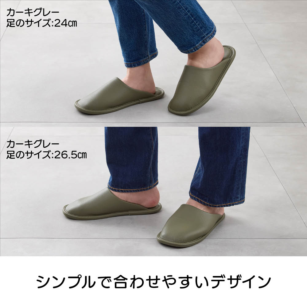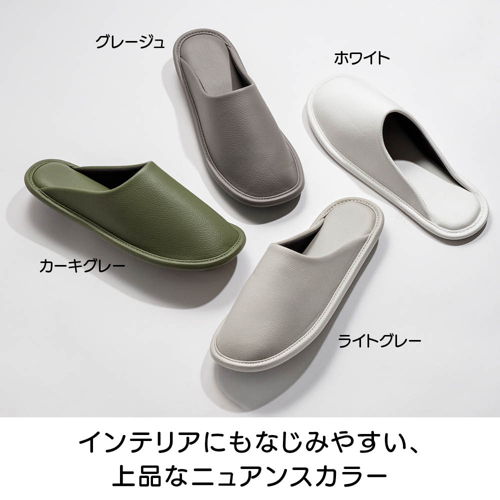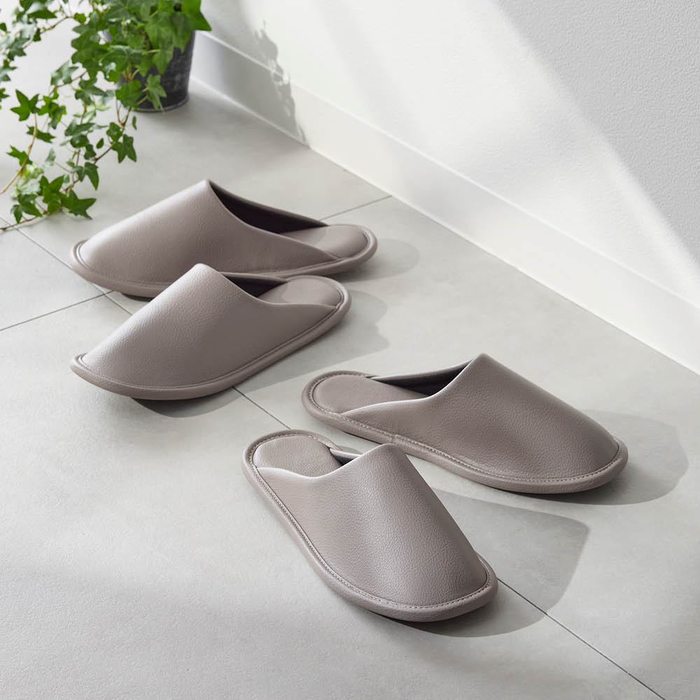 玄関に入った瞬間「センスいい」と思わせるゲストスリッパ。シンプルで洗練されたデザインと、上品なレザー調の風合いが魅力の2足セット。4色の落ちついたカラーバリエーションから、お好きな同色をお選びいただけます。空間に馴染むワントーンが、さりげない品の良さを添えます。ふかふかなクッション性で、足元から心地よいくつろぎを。清潔にお使いいただける抗菌素材。水拭きはもちろん、アルコールや消毒スプレー(次亜塩素酸対応)でサッと拭けるので、いつでもキレイなスリッパでお客様をお迎えできます。シンプルで合わせやすいデザインワンサイズ展開(23〜26.5cm)。洗練された印象の一足です。お手入れも簡単!水拭きも、アルコール除菌もOK合皮素材でお手入れ簡単。水拭きはもちろん、アルコールや次亜塩素酸スプレーにも対応しているので、清潔にお使いいただけます。