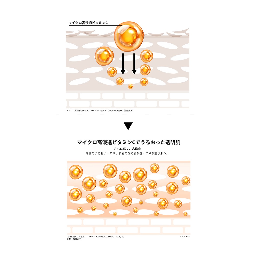 新しくなったVCシリーズ、化粧水はマストバイ!!お得な大容量のお申込みは2025年12月31日まで!100兆個*1 以上の、マイクロ高浸透*2 ビタミンC(APPS)*3 が肌のすみずみ*2 まで届く。 変化を感じ始めた肌に、素早く浸透*2。くすみ*4、キメの乱れ、毛穴*5、乾燥に。先端美容皮膚科学発想で、もっともっと、つや肌へ。【マイクロ高浸透*2 のビタミンC (APPS)*3】美容皮膚科学の現場で使用される成分を、さらに*6 届く高浸透*2。史上最高濃度*7 配合。【ナイアシンアミド*8・ヒアルロン酸*9・浸透*2 コラーゲン*10 配合】濃密なとろみ感で、うるおいを届ける。使用方法洗顔後、適量(500円硬貨大)を手に取り、お顔の中心から外側へ向かってやさしくなじませます。 その後、保湿のためにVC100エマルジョンEXをご使用いただくことをおすすめします。*1 一回の使用量あたり(概算値)*2 角層まで*3 パルミチン酸アスコルビルリン酸3Na(整肌成分)*4 乾燥によりくすんでみえること*5 乾燥による毛穴の目立つ肌*6 「シーラボ VエッセンスローションEX R」比*7 シーラボ Vエッセンスローション史上最高濃度の高浸透ビタミンC配合(スペシャルを除く)*8 整肌成分*9 ヒアルロン酸Na(保湿成分)*10 加水分解コラーゲン(保湿成分)