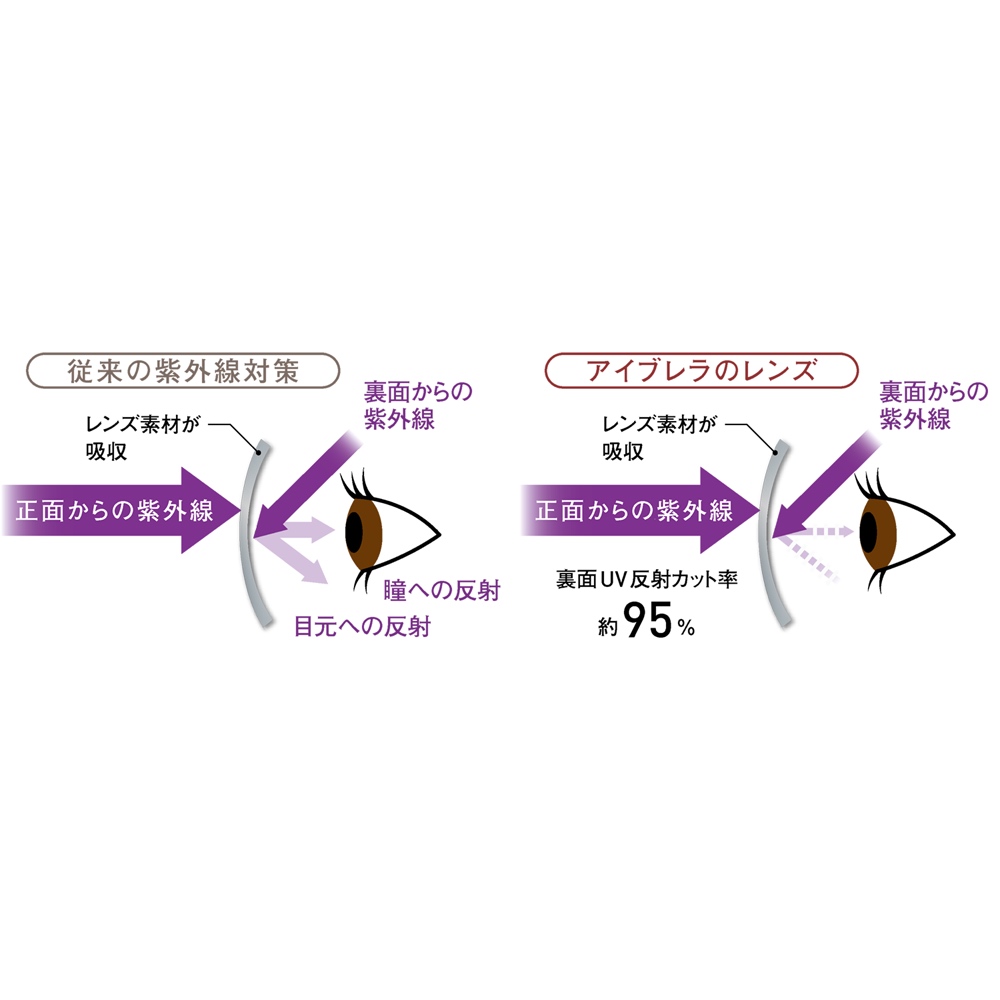 アイブレラのレンズは、特殊加工により可視光線の「ブルー光線のみをカット」するので、まぶしさを押さえ、視界をくっきり。