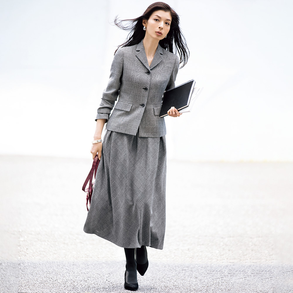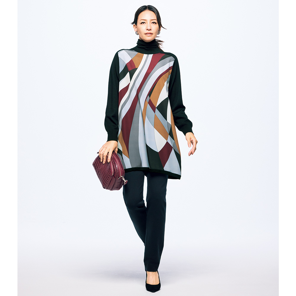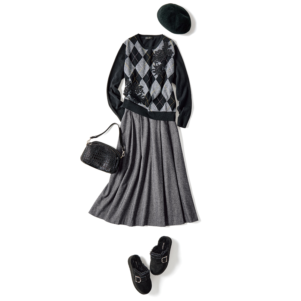 コーディネート例 /レース使いのアーガイルニットとフレアースカート、ムートンサンダル…個性豊かなアイテムをモノトーンで統一。上品さと遊び心が調和したエレガントスタイルに。