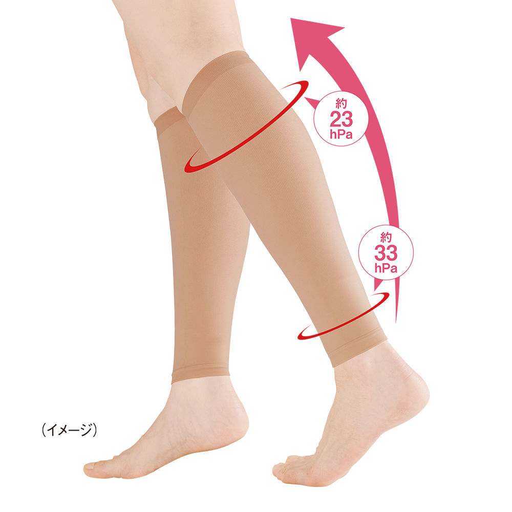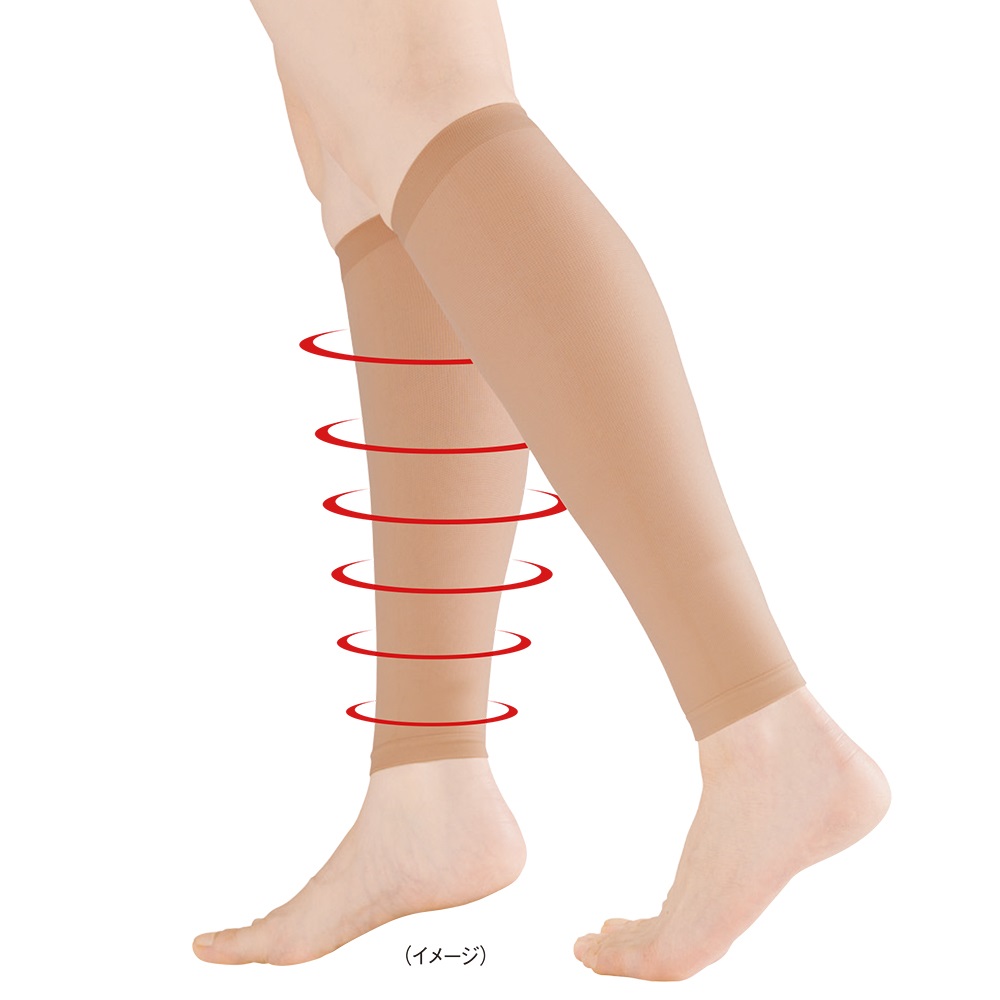アウターに響きにくい極薄着圧。こっそり血行促進・むくみ軽減。パンパンになったむくみ足にお悩みの方に。日常使いしやすい薄型サポーターを使用してみては?少し厚手のストッキングのような生地なのにしっかりとした着圧で、足首からふくらはぎに向かって段階的に圧力を加えてくれる医療機器サポーター。だから血行を促進してむくみを軽減。薄手でピタッとフィットするので、上からズボンや靴下も履きやすい。(着圧素材のレギンス・ソックスとの重ね履きはお避け下さい。)むくみが気になる季節に1枚履くだけのケアを。●むくみの軽減・予防●血行促進