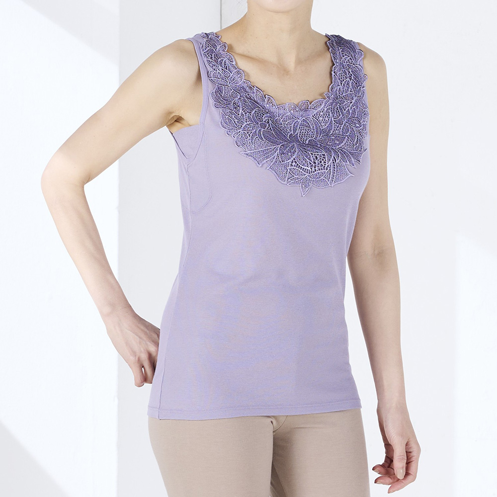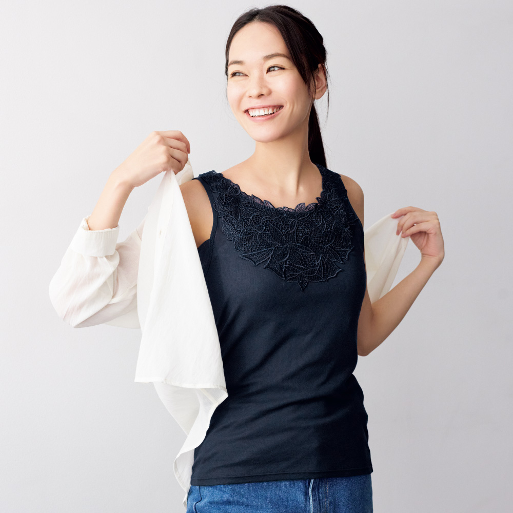 汗が気になるシャツのインナーとして大活躍。暑い季節のあらゆるお悩みを解消してくれる、機能的な綿混素材を使用したタンクトップ。脇下には汗取りパッド付きで、毎日のおしゃれを強力にサポート。ネックレスをイメージした刺繍レースが、アクセサリーいらずで胸元を上品に演出してくれるので見せインナーとしても重宝します。≫嬉しい3つの機能・吸水速乾・抗菌防臭・汗臭の消臭