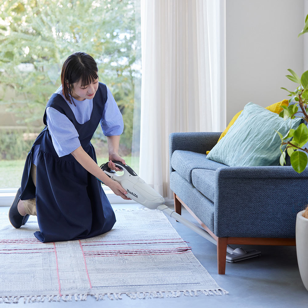 立ったりかがんだりの動作でもじゃまにならない丈感です。