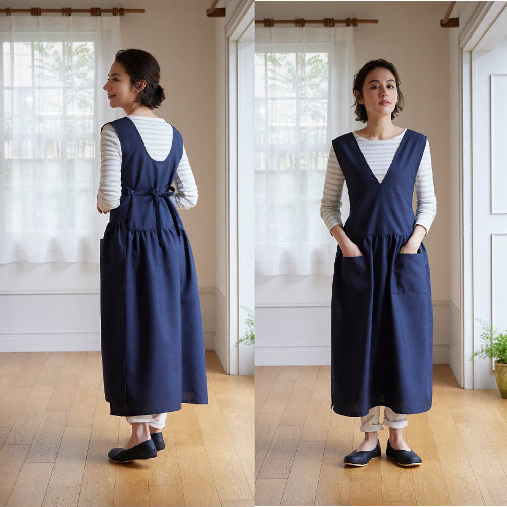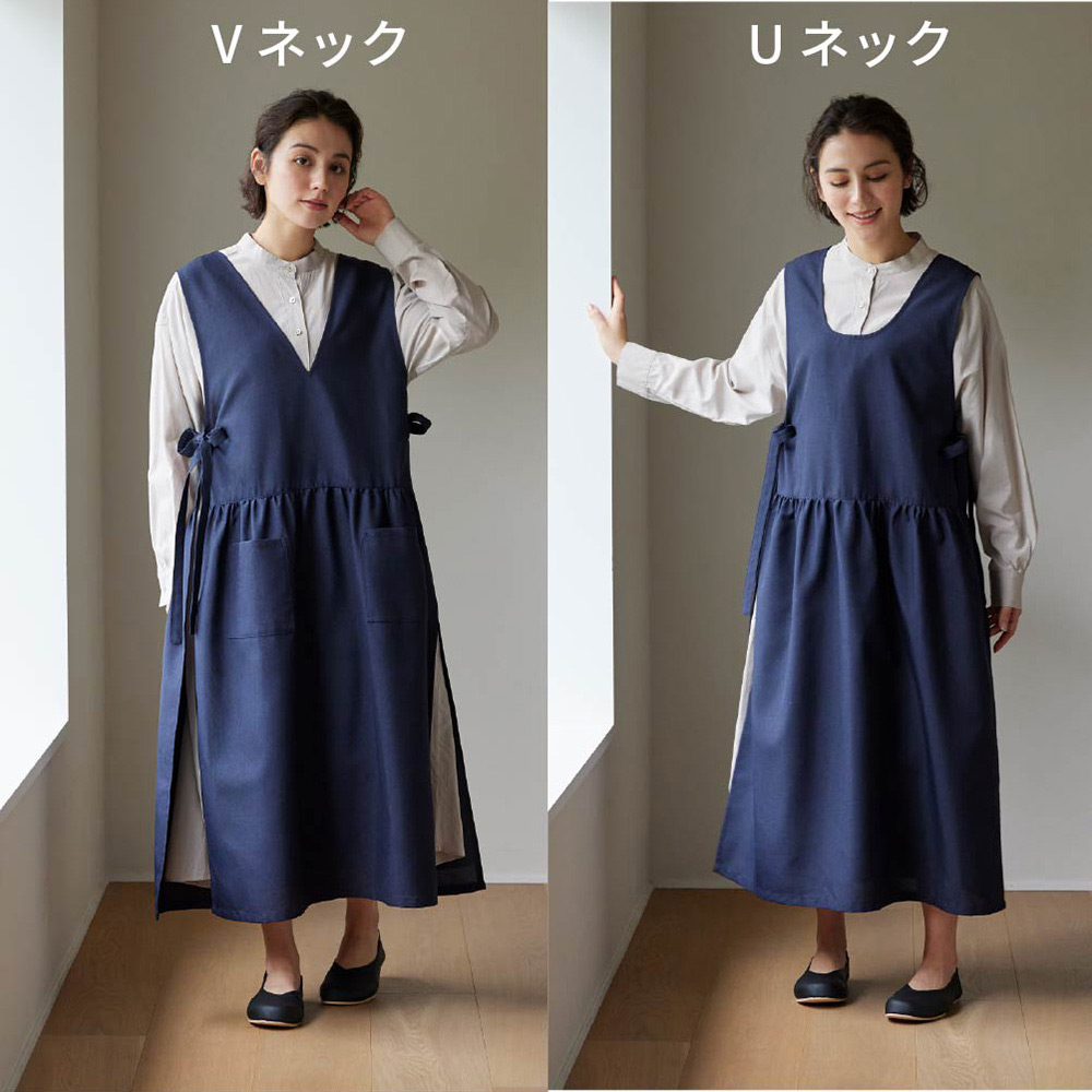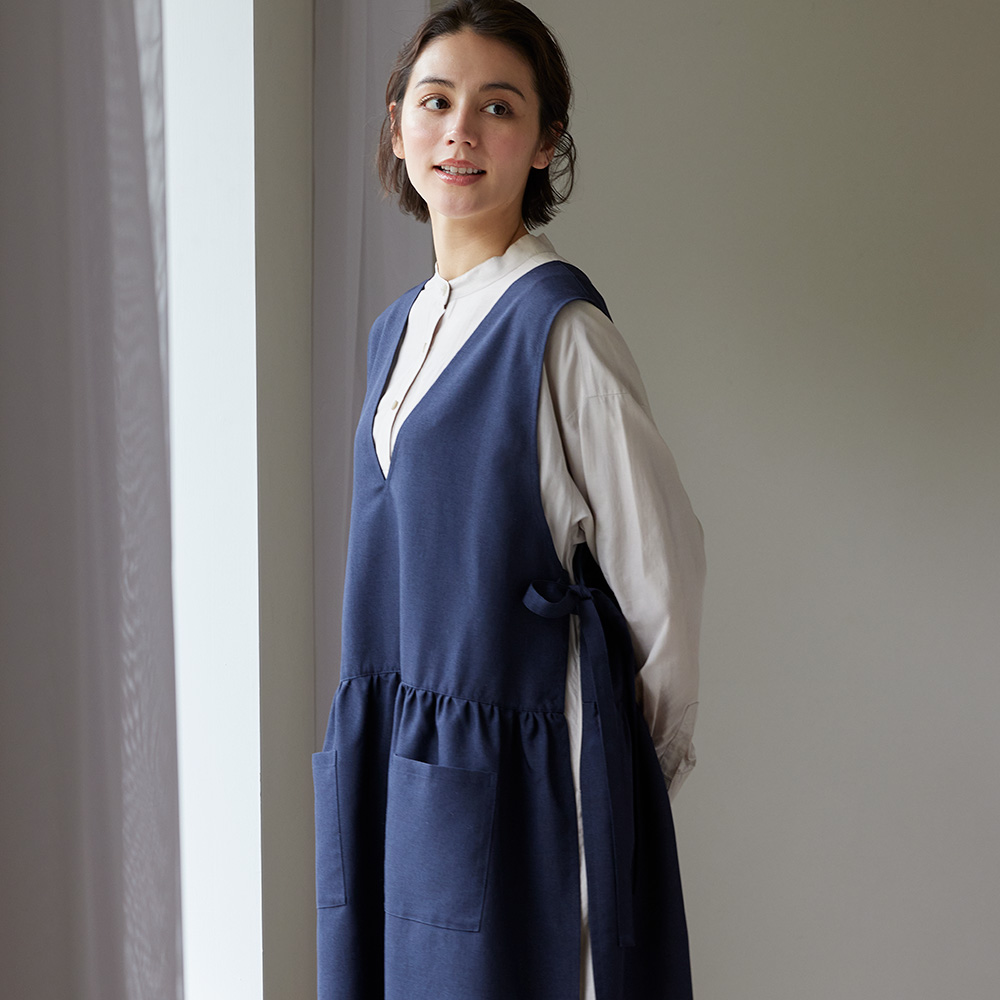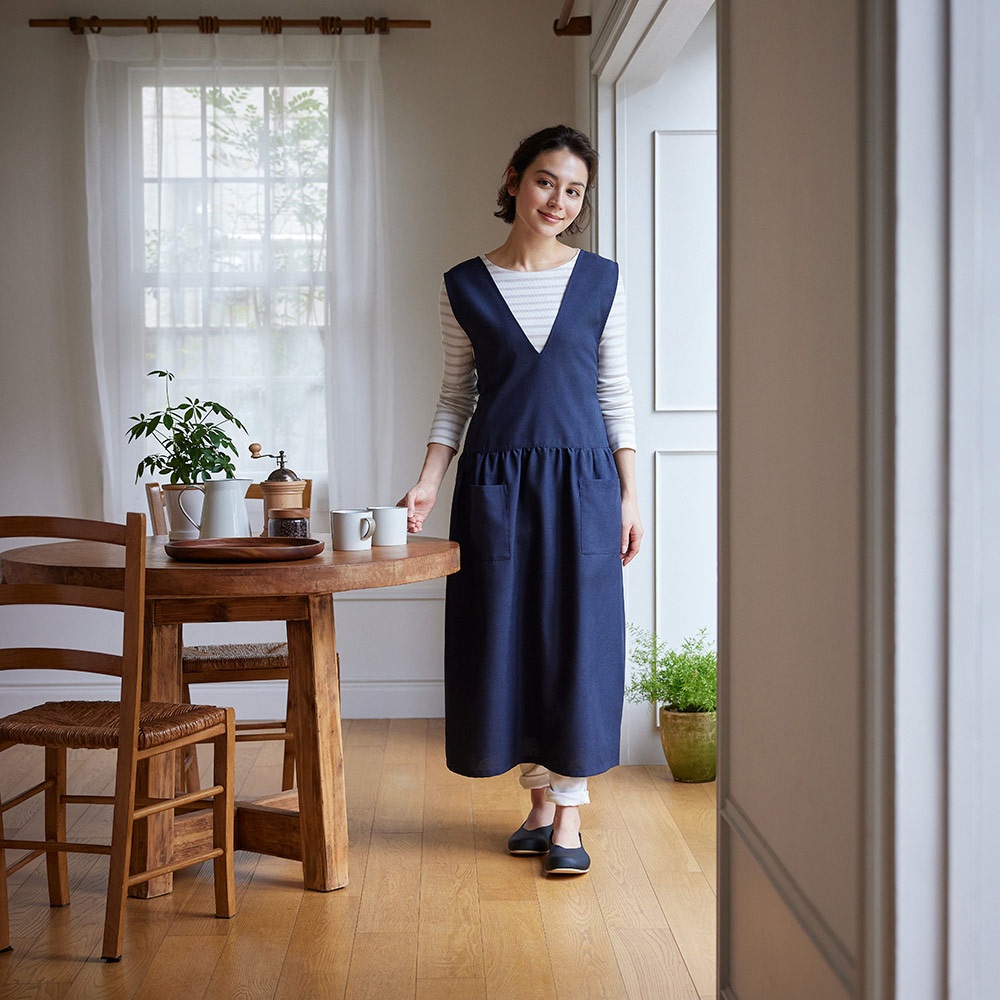 汚れにくく、シワになりにくい。外にも気軽に着て行けるエプロンお求め安くなりました。前回販売価格8990円(税込)⇒今回販売価格7990円(税込)※前回販売価格とは「DINOS STORY vol7.」での掲載価格です。時短のため、家事の時にエプロンを使わないという、暮らしコーディネーターの瀧本さん。もし自分が着るなら、着たまま外出できて、シワになりにくく洗濯も簡単なもの。そんな瀧本さんの理想を詰め込みで作った、誰でも気楽におしゃれに着られる1着です。まるでジャンパースカート。大人心をくすぐるシックな2WAY。ウエストで切り替えてギャザーをたっぷり寄せることで、動きやすさと女性らしさを両立。胸元が出すぎないVネックと、やさしい印象のUネックのリバーシブル仕様。普段着として愛用したくなるほど、おしゃれでかわいいデザインです。いつもの服の上からストンとかぶるだけ。前身頃と後ろ身頃をサイドリボンで結ぶ仕様なので、頭を通すだけでさっと着られます。下に着る服や体型も選びません。リボンをバックで結べば、タイトなフォルムも楽しめます。エプロンなのにワンピース風にも見えて、ちょっと外へ出る時にもいい感じ。前と後ろをぐるっと変えれば、VネックからUネックへチェンジ。ポケットも見えなくなってさらにシンプル。その日の服装や気分、目的でお好きに着回してください。エプロンの表面に、はっ水・はつ油加工を施しました。水や油が跳ねてもしっかり弾いてくれるので、サッとひと拭きすれば落とせます。だから洗濯もラクラク。放っておいてもシワにならないので、キレイに畳んだり、アイロンをかけたりする必要もなし。Vネック側には大きめのポケット付きスマホを入れたり、出かける時には財布や鍵も入れたりととても便利。買い忘れた物があっても思い立ったら、すぐ手ぶらで買いに行けます。スカート部分には足さばきをよくするための裏地を付けました。下に着ている洋服との摩擦を緩和してくれるので、歩いたりしゃがんだりの動作がスムーズにできます。さらに帯電防止加工も施しているので、冬場のストレスになるイヤな静電気も軽減。お家でも外でも気軽に着られる!着る世代を問わないシンプルなデザイン。色は汚れの目立たないネイビーは印象も上品で、合わせる洋服や季節を選びません。買い物やお迎えなどに着たまま出かけても、このエプロンなら恥ずかしくありません。サイドリボンは着脱可能。身頃の両サイドに付いているリボンは、ボタンで取り外すことができます。リボンが不要な時は、もたつかないように外しておいても。「このエプロンは洋服感覚で着られて、手入れの手間がかかりません。どんな体型の人にも似合って、その日の気分によって着方も変えられます。さらに家の中だけでなく、ワンマイルにも着たまま楽しく出かけられるのが魅力。シワになりにくいからアイロンいらずで家事もラク! 防災士の視点からも、着たまま逃げられて汚れにくく、下に何を着ていてもお洒落に見えるのは利点。そんな時こそ「気分が上がる」のは大切ですから」。