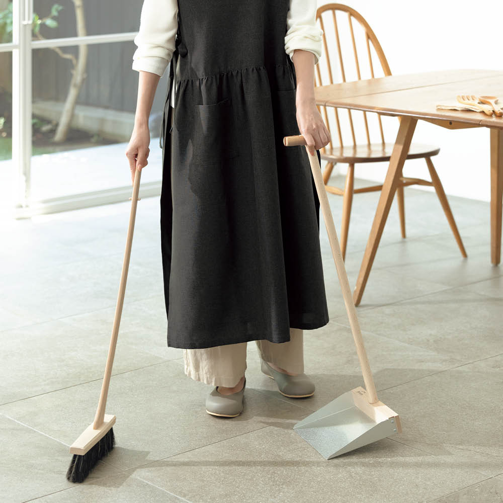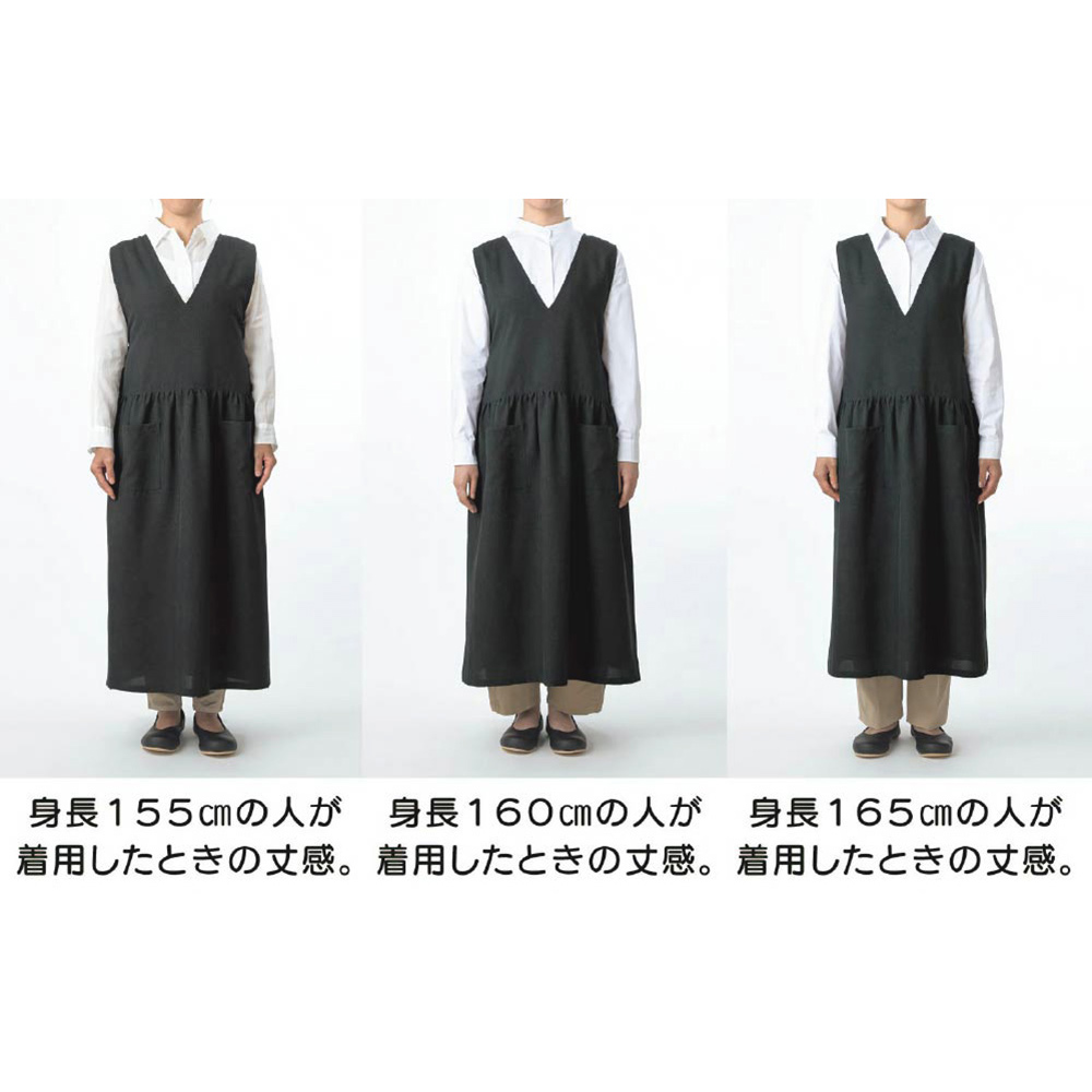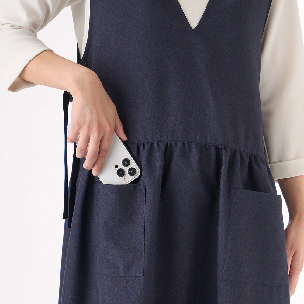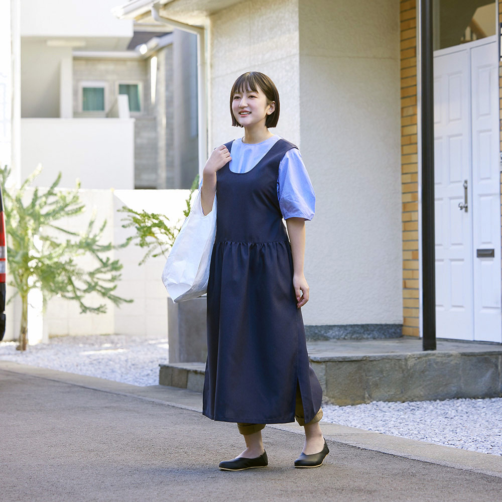 汚れにくく、シワになりにくい。外にも気軽に着て行けるエプロンお求め安くなりました。前回販売価格8990円(税込)⇒今回販売価格7990円(税込)※前回販売価格とは「DINOS STORY vol7.」での掲載価格です。時短のため、家事の時にエプロンを使わないという、暮らしコーディネーターの瀧本さん。もし自分が着るなら、着たまま外出できて、シワになりにくく洗濯も簡単なもの。そんな瀧本さんの理想を詰め込みで作った、誰でも気楽におしゃれに着られる1着です。まるでジャンパースカート。大人心をくすぐるシックな2WAY。ウエストで切り替えてギャザーをたっぷり寄せることで、動きやすさと女性らしさを両立。胸元が出すぎないVネックと、やさしい印象のUネックのリバーシブル仕様。普段着として愛用したくなるほど、おしゃれでかわいいデザインです。いつもの服の上からストンとかぶるだけ。前身頃と後ろ身頃をサイドリボンで結ぶ仕様なので、頭を通すだけでさっと着られます。下に着る服や体型も選びません。リボンをバックで結べば、タイトなフォルムも楽しめます。エプロンなのにワンピース風にも見えて、ちょっと外へ出る時にもいい感じ。前と後ろをぐるっと変えれば、VネックからUネックへチェンジ。ポケットも見えなくなってさらにシンプル。その日の服装や気分、目的でお好きに着回してください。エプロンの表面に、はっ水・はつ油加工を施しました。水や油が跳ねてもしっかり弾いてくれるので、サッとひと拭きすれば落とせます。だから洗濯もラクラク。放っておいてもシワにならないので、キレイに畳んだり、アイロンをかけたりする必要もなし。Vネック側には大きめのポケット付きスマホを入れたり、出かける時には財布や鍵も入れたりととても便利。買い忘れた物があっても思い立ったら、すぐ手ぶらで買いに行けます。スカート部分には足さばきをよくするための裏地を付けました。下に着ている洋服との摩擦を緩和してくれるので、歩いたりしゃがんだりの動作がスムーズにできます。さらに帯電防止加工も施しているので、冬場のストレスになるイヤな静電気も軽減。お家でも外でも気軽に着られる!着る世代を問わないシンプルなデザイン。色は汚れの目立たないネイビーは印象も上品で、合わせる洋服や季節を選びません。買い物やお迎えなどに着たまま出かけても、このエプロンなら恥ずかしくありません。サイドリボンは着脱可能。身頃の両サイドに付いているリボンは、ボタンで取り外すことができます。リボンが不要な時は、もたつかないように外しておいても。「このエプロンは洋服感覚で着られて、手入れの手間がかかりません。どんな体型の人にも似合って、その日の気分によって着方も変えられます。さらに家の中だけでなく、ワンマイルにも着たまま楽しく出かけられるのが魅力。シワになりにくいからアイロンいらずで家事もラク! 防災士の視点からも、着たまま逃げられて汚れにくく、下に何を着ていてもお洒落に見えるのは利点。そんな時こそ「気分が上がる」のは大切ですから」。
