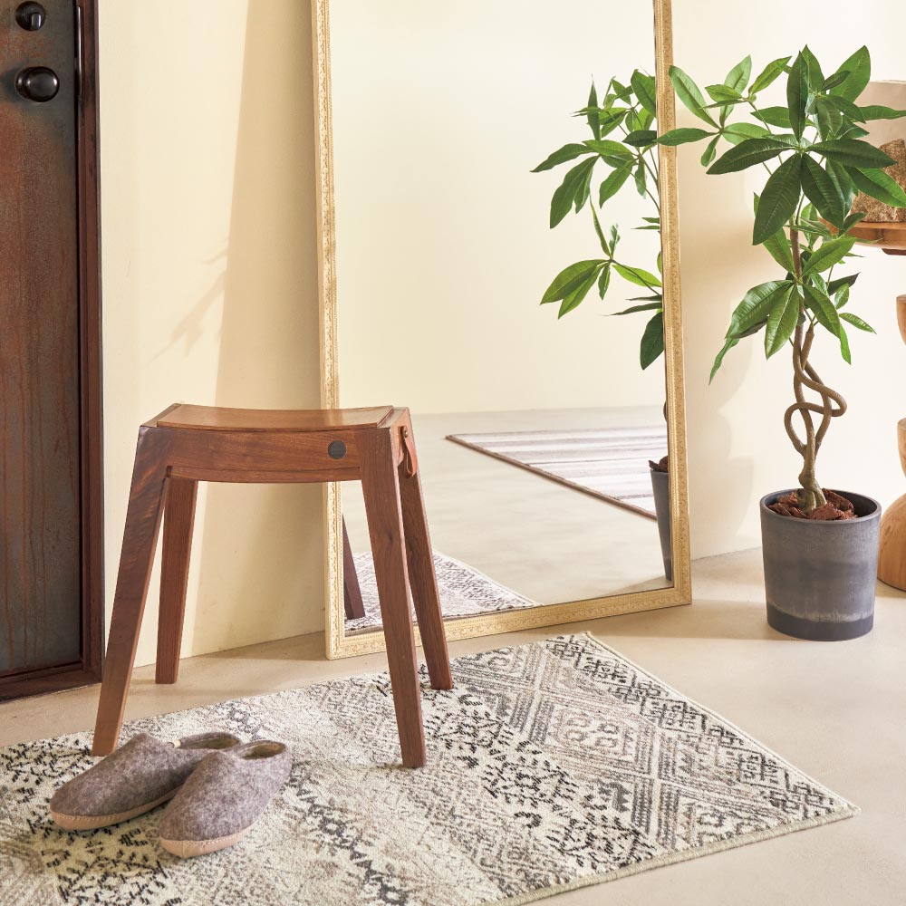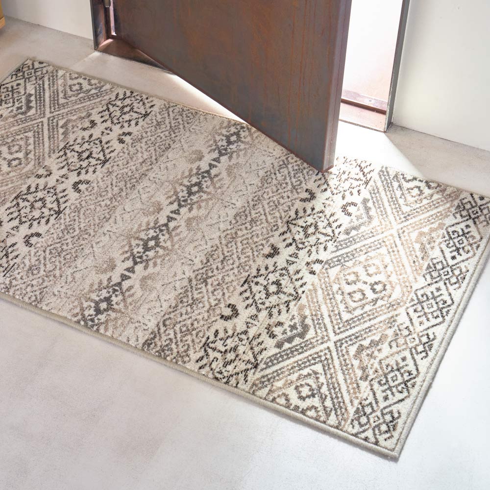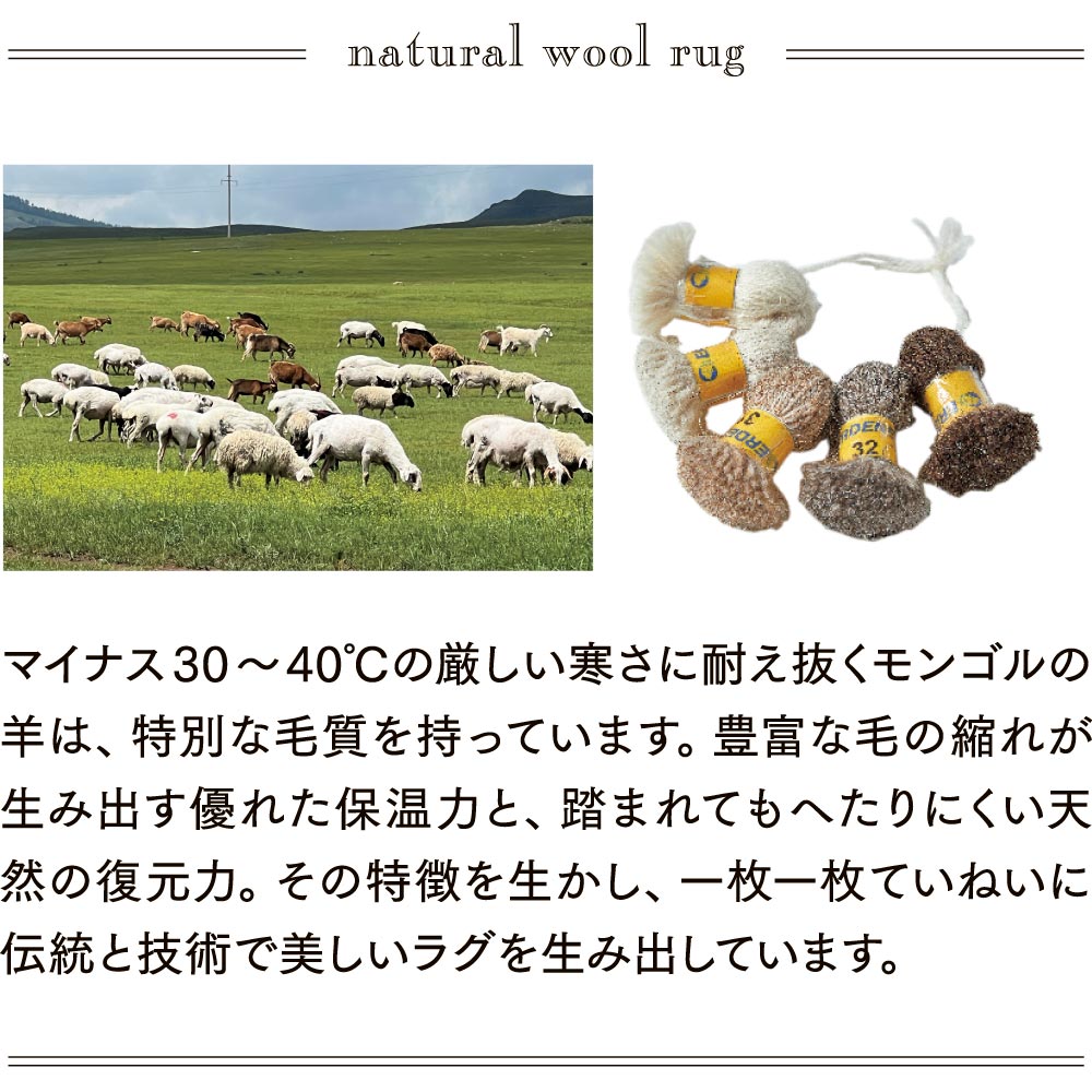 昨年発売し大人気だった「エルデネ」に玄関マット登場!程よい厚みで、足元を心地良く温かく包みます。天然ウールの調温調湿機能で一年中快適。モダンな幾何学柄でどこでも合わせやすいデザインから昨年大人気だった「エルデネ」。今号は、玄関マットサイズもご用意。どんな部屋にもなじむ風合い無染色100%の天然ウールマット寒暖差が激しいモンゴルで育った羊毛のウールを、着色することなく使用。保湿力、耐久力、はっ水性に優れ、汚れがつきにくいのが特徴です。湿気にも強いので年間を通しての使用もOK。遊び毛が発生しにくい特殊処理済みも嬉しい。●天然素材モンゴルウールを100%使用マイナス30〜40度の厳冬を過ごすモンゴルの羊は、強靱な毛で体を守っているので、その毛は踏まれてもへたりにくくラグやマットに最適な素材。広い草原で遊牧民が飼育しており、羊の毛をホワイト・アイボリー・ブラウン・ダークブラウン・ブラックの5色に分類します。染料を使わず天然の色のまま使用するので、地球に優しい天然素材と言えます。【モンゴル産にこだわるポイント】・ 着色しない天然そのままの羊毛で糸を作り、ありのままの色を活かしてデザインされたマットです。そのため、他のウールラグと比べてウールの持つ自然のあたたかみをより感じることができます。・ 寒暖の差が激しい地域で育った羊のため、毛のちぢれ(クリンプ)が多くその分たくさんの空気を含んでいます。そのためウールの中でも特に保温力が高く耐久性に優れているほか、撥水性や汚れが付きにくい点が特徴です。吸湿・保湿にも優れており湿気にも強いので年間通してお使いいただけます。・ このような特徴からモンゴルウールは、カーペットに一番適した素材といえます。ですが、モンゴルからの輸入は非常に時間がかかります。ディノスとメーカーではお客様にいつでもお届けできるよう、在庫をしっかりと確保しております。また、お客様に永く愛されるよう常に「肌触り・風合い・デザイン性」を追求しております。●遊び毛を最大限に抑えるため、しっかりと検品しています糸の品質にもこだわり、カーペット用の糸を作るまでに80以上の工程をふみ、色やデザインのばらつきをなくし、ウール特有の遊び毛(切れたりほどけて出てきた繊維)を少なく抑えています。●ウールってどんな素材?【1】保温保冷効果保温・保冷効果も高く、冬は暖かく夏は涼しくさわやか快適です。【2】湿度調整でお部屋を快適に湿度を調整する機能を持ち、夏はサラッと快適に、冬も適度な湿度を保ってくれます。【3】水を弾き、汚れにくいウールは素材由来の油分を含んでおり水を弾き、シミ(汚れ)が付きにくいという特徴を持っています。そのため、お手入れが簡単です。【4】長く続く弾力性天然の縮れにより優れた回復力があり、そのおかげでパイル(毛足)のヘタリが無く、気持ちの良い感触(踏み心地)が長続きします。【5】燃え広がりにくい素材ウールは燃え広がりにくい、安心・安全な素材です。【6】音が響きにくい空気をまとい音波の振動を防ぎ、防音効果が期待できます。マンションや小さなお子様がいるご家庭におすすめです。