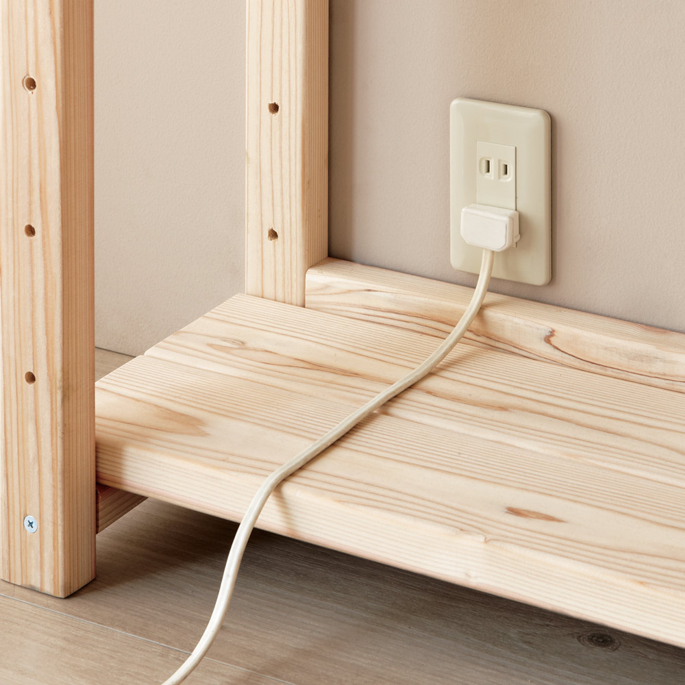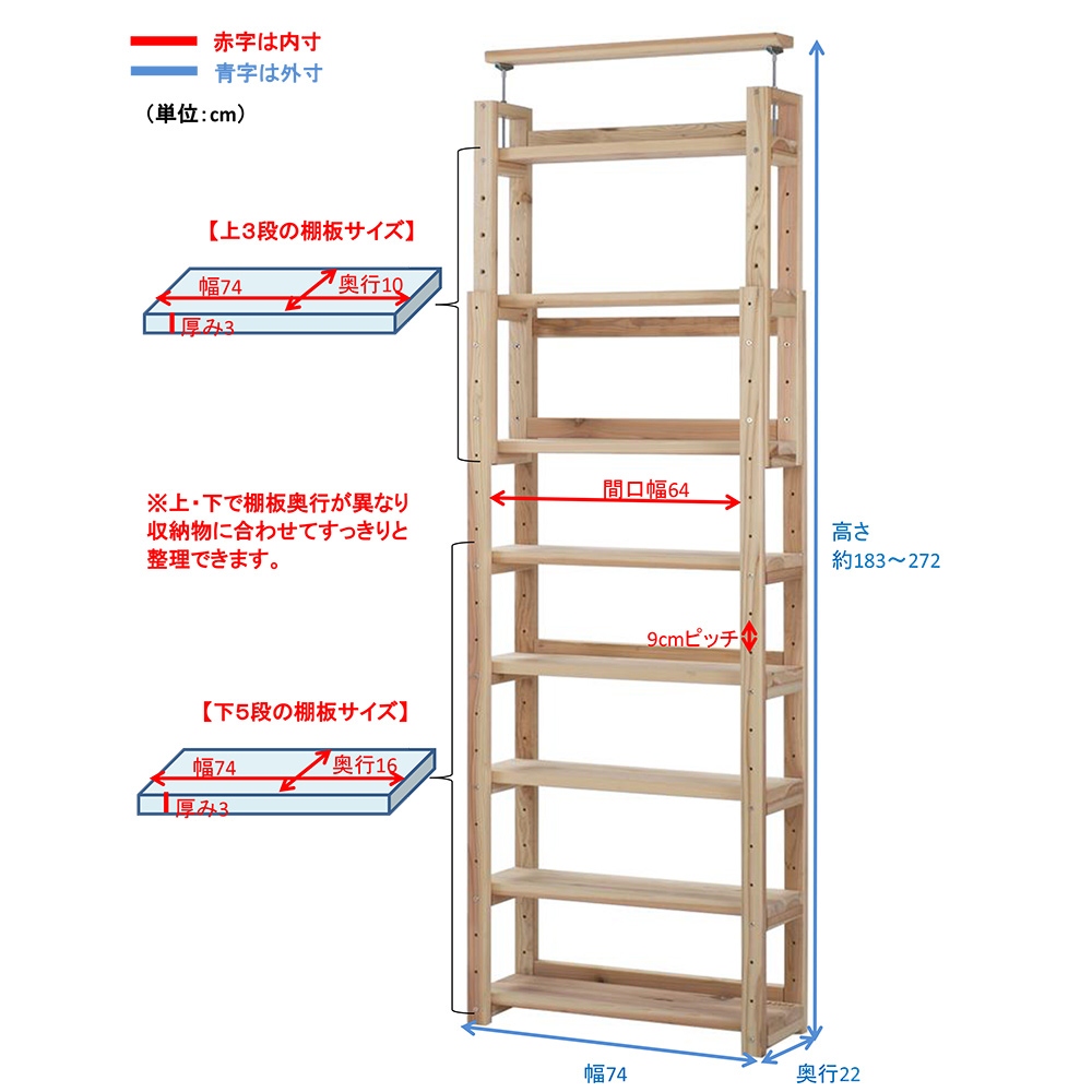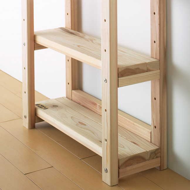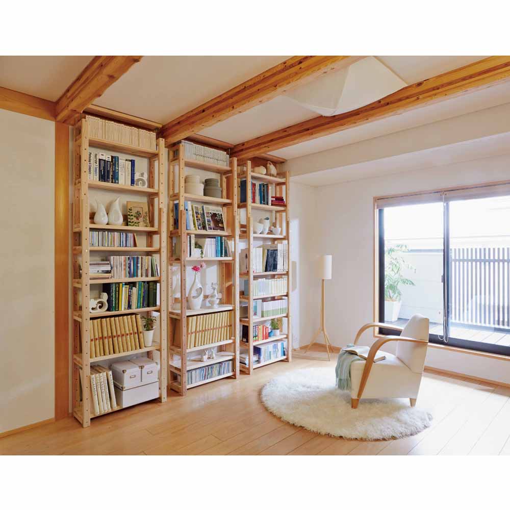 【国産杉無垢】【頑丈】【日本製(国産)】播磨・兵庫県宍粟市の製材所で2週間以上かけて仕上げる「杉無垢」をふんだんに使用。長年使い続けても安心の、確かな耐久性を備えています。天然の節目を生かした自然のままの木肌は、永く使うほどに風合いが深まる愉しみを味わえ、まるで木に包まれるような心地よさを味わえる壁面ラックです。お子様がいらっしゃるご家庭にもおすすめです。【POINT 1】播磨の製材所で仕上げる杉無垢をふんだんに使用。〜品質・強度にこだわった製材ライン〜●播磨・兵庫県宍粟市の木材センターで仕上げる杉無垢を贅沢に使用。●この製材所は、主に建築材を生産しています。●木材の含水率の測定や打撃による強度計測などを最新機器で徹底管理。●建材と同じレベルで2週間以上かけ丁寧に製材し、●最後は一つ一つ手で触れ目で見て、しっかりと最終品質チェックを行います。●確かな技術で仕上げる杉を使用した、永くお使い頂ける頑丈本棚ラックです。〜日本の森を守るために〜●輸入材が増えて国内の放棄森林が増加。●その中で、兵庫木材センターは日本の森を守るための取組をスタート。●生産から供給までの一貫体制で、積極的に日本の森を活用。●そうして森を循環させることで、荒廃する森林の再生を目指します。【POINT 2】棚板1枚当たりの耐荷重「約50kg」の頑丈さ。●しっかり目の詰まった木質による丈夫さで、建材にも使われる国産杉。●棚板は3cmと厚みたっぷりで頑丈。重い本を大量収納できるブックシェルフです。●テレビを置いて、シアター壁面収納にしたり、オーディオやプリンターを置いたり、幅広い用途でお使い頂けます。【POINT 3】日々使うものだから、こまやかな機能にもこだわりました。●天井と面で突っ張ってしっかり安定。オープンなので圧迫感もありません。●低い天井・梁下183cmから高い天井272cmまで対応。●棚板は穴に合わせて9cmピッチで可動できます。●背板がないので、コンセントやスイッチをいかせます。●コーナー部分に丸みを持たせて、手触りもなめらかに。●ホルムアルデヒド含有量が最も少ないF☆☆☆☆接着剤を使用しているのでお子様がいても安心。●間仕切りラックとしてもお使い頂けます。オフィス、書斎、リビングやキッズルームをナチュラルで心地よい空間に。●お気に入りのアイテムを飾って、木製コレクションシェルフとしても◎●頑丈なので、テレビ台、プリンター台としても有効活用でき便利です。●薄型スリムタイプは、廊下や寝室、玄関など省スペースでお使い頂くのもおすすめの書棚です。【ウッドデザイン賞2024受賞】ウッドデザイン賞は木の良さや価値を再発見させる製品や取組について特に優れたものを消費者目線で評価し表彰する顕彰制度です。ライフスタイルデザイン部門に入賞。