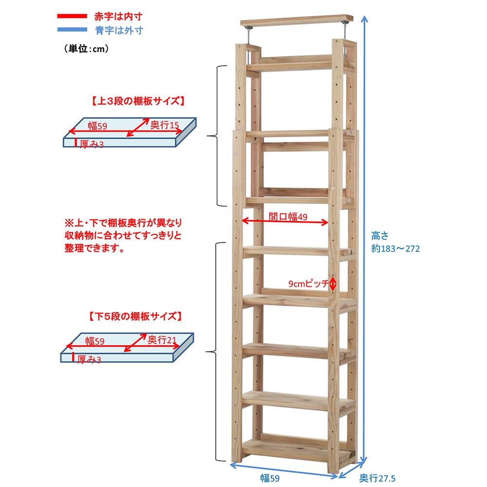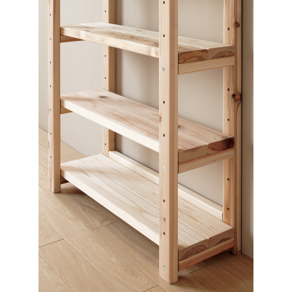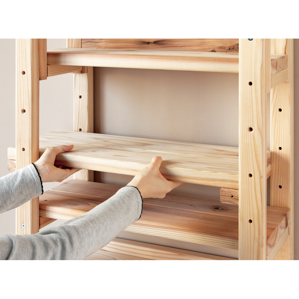 【国産杉無垢】【頑丈】【日本製(国産)】播磨・兵庫県宍粟市の製材所で2週間以上かけて仕上げる「杉無垢」をふんだんに使用。長年使い続けても安心の、確かな耐久性を備えています。天然の節目を生かした自然のままの木肌は、永く使うほどに風合いが深まる愉しみを味わえ、まるで木に包まれるような心地よさを味わえる壁面ラックです。お子様がいらっしゃるご家庭にもおすすめです。【POINT 1】播磨の製材所で仕上げる杉無垢をふんだんに使用。〜品質・強度にこだわった製材ライン〜●播磨・兵庫県宍粟市の木材センターで仕上げる杉無垢を贅沢に使用。●この製材所は、主に建築材を生産しています。●木材の含水率の測定や打撃による強度計測などを最新機器で徹底管理。●建材と同じレベルで2週間以上かけ丁寧に製材し、●最後は一つ一つ手で触れ目で見て、しっかりと最終品質チェックを行います。●確かな技術で仕上げる杉を使用した、永くお使い頂ける頑丈本棚ラックです。〜日本の森を守るために〜●輸入材が増えて国内の放棄森林が増加。●その中で、兵庫木材センターは日本の森を守るための取組をスタート。●生産から供給までの一貫体制で、積極的に日本の森を活用。●そうして森を循環させることで、荒廃する森林の再生を目指します。【POINT 2】棚板1枚当たりの耐荷重「約50kg」の頑丈さ。●しっかり目の詰まった木質による丈夫さで、建材にも使われる国産杉。●棚板は3cmと厚みたっぷりで頑丈。重い本を大量収納できるブックシェルフです。●テレビを置いて、シアター壁面収納にしたり、オーディオやプリンターを置いたり、幅広い用途でお使い頂けます。【POINT 3】日々使うものだから、こまやかな機能にもこだわりました。●天井と面で突っ張ってしっかり安定。オープンなので圧迫感もありません。●低い天井・梁下183cmから高い天井272cmまで対応。●棚板は穴に合わせて9cmピッチで可動できます。●背板がないので、コンセントやスイッチをいかせます。●コーナー部分に丸みを持たせて、手触りもなめらかに。●ホルムアルデヒド含有量が最も少ないF☆☆☆☆接着剤を使用しているのでお子様がいても安心。●間仕切りラックとしてもお使い頂けます。オフィス、書斎、リビングやキッズルームをナチュラルで心地よい空間に。●お気に入りのアイテムを飾って、木製コレクションシェルフとしても◎●頑丈なので、テレビ台、プリンター台としても有効活用でき便利です。●薄型スリムタイプは、廊下や寝室、玄関など省スペースでお使い頂くのもおすすめの書棚です。【ウッドデザイン賞2024受賞】ウッドデザイン賞は木の良さや価値を再発見させる製品や取組について特に優れたものを消費者目線で評価し表彰する顕彰制度です。ライフスタイルデザイン部門に入賞。