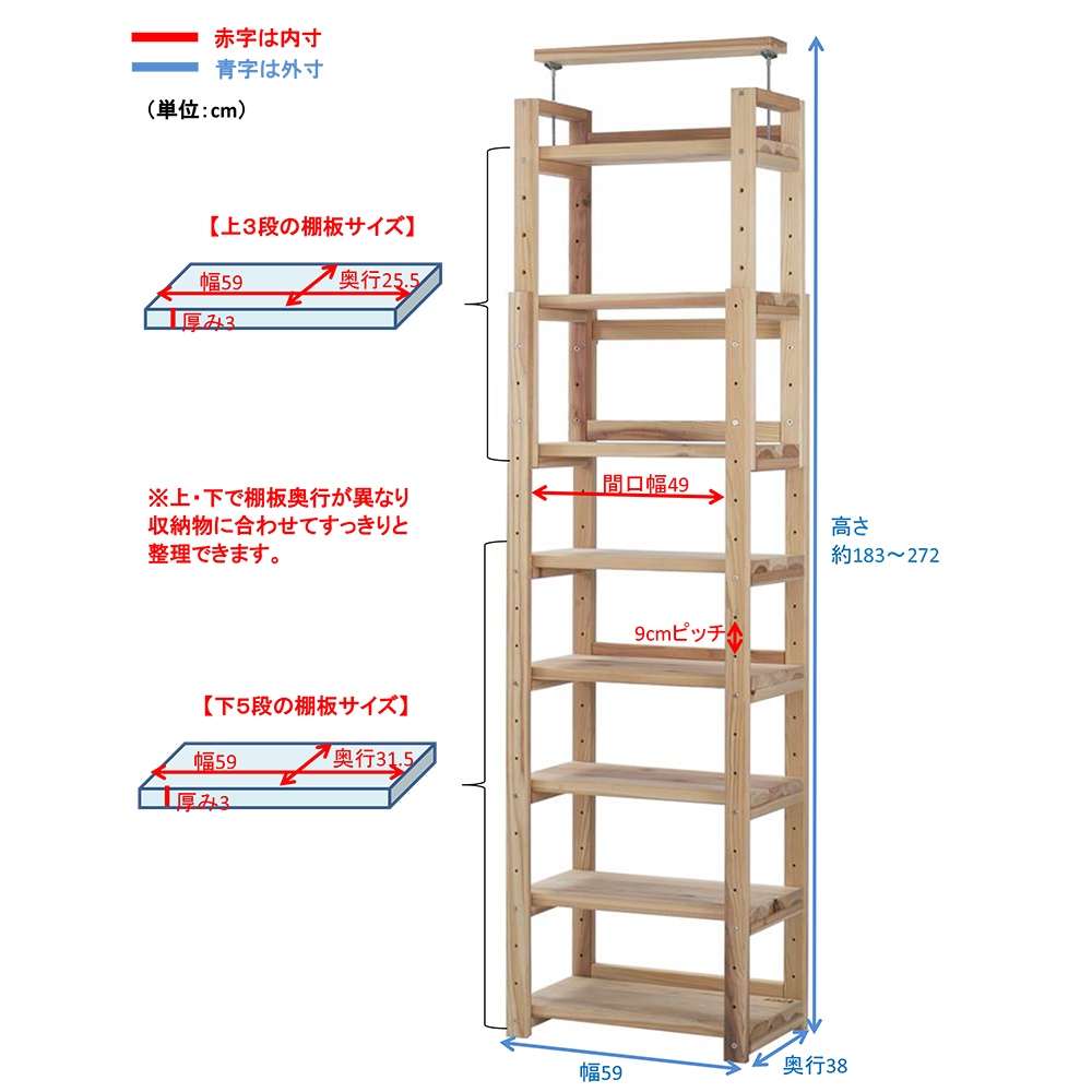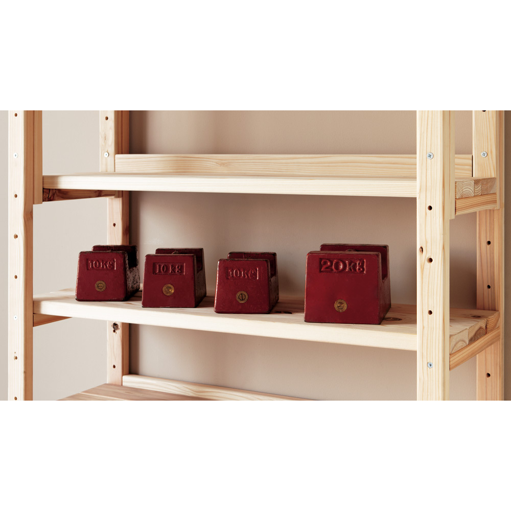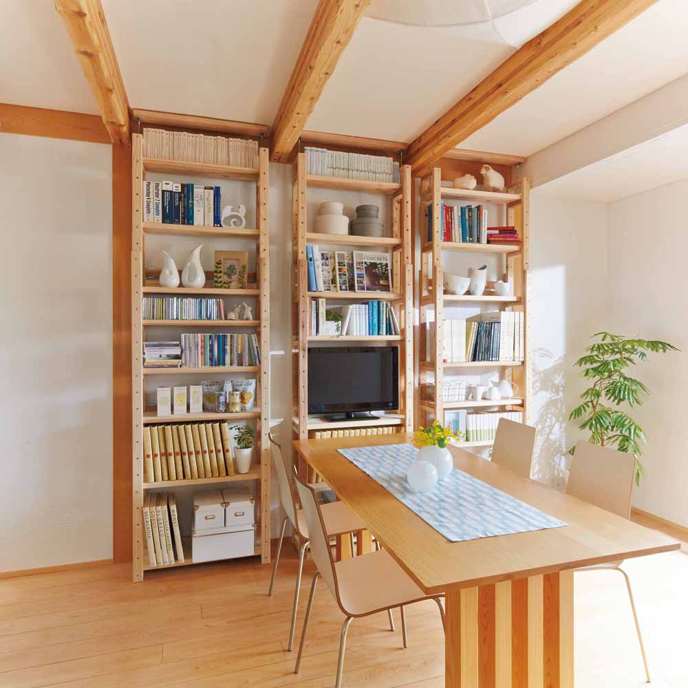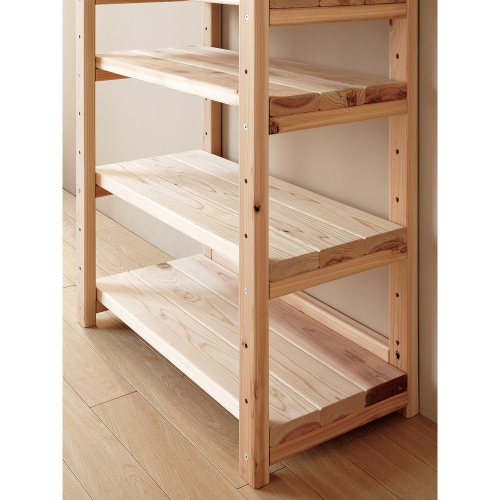 【国産杉無垢】【頑丈】【日本製(国産)】播磨・兵庫県宍粟市の製材所で2週間以上かけて仕上げる「杉無垢」をふんだんに使用。長年使い続けても安心の、確かな耐久性を備えています。天然の節目を生かした自然のままの木肌は、永く使うほどに風合いが深まる愉しみを味わえ、まるで木に包まれるような心地よさを味わえる壁面ラックです。お子様がいらっしゃるご家庭にもおすすめです。【POINT 1】播磨の製材所で仕上げる杉無垢をふんだんに使用。〜品質・強度にこだわった製材ライン〜●播磨・兵庫県宍粟市の木材センターで仕上げる杉無垢を贅沢に使用。●この製材所は、主に建築材を生産しています。●木材の含水率の測定や打撃による強度計測などを最新機器で徹底管理。●建材と同じレベルで2週間以上かけ丁寧に製材し、●最後は一つ一つ手で触れ目で見て、しっかりと最終品質チェックを行います。●確かな技術で仕上げる杉を使用した、永くお使い頂ける頑丈本棚ラックです。〜日本の森を守るために〜●輸入材が増えて国内の放棄森林が増加。●その中で、兵庫木材センターは日本の森を守るための取組をスタート。●生産から供給までの一貫体制で、積極的に日本の森を活用。●そうして森を循環させることで、荒廃する森林の再生を目指します。【POINT 2】棚板1枚当たりの耐荷重「約50kg」の頑丈さ。●しっかり目の詰まった木質による丈夫さで、建材にも使われる国産杉。●棚板は3cmと厚みたっぷりで頑丈。重い本を大量収納できるブックシェルフです。●テレビを置いて、シアター壁面収納にしたり、オーディオやプリンターを置いたり、幅広い用途でお使い頂けます。【POINT 3】日々使うものだから、こまやかな機能にもこだわりました。●天井と面で突っ張ってしっかり安定。オープンなので圧迫感もありません。●低い天井・梁下183cmから高い天井272cmまで対応。●棚板は穴に合わせて9cmピッチで可動できます。●背板がないので、コンセントやスイッチをいかせます。●コーナー部分に丸みを持たせて、手触りもなめらかに。●ホルムアルデヒド含有量が最も少ないF☆☆☆☆接着剤を使用しているのでお子様がいても安心。●間仕切りラックとしてもお使い頂けます。オフィス、書斎、リビングやキッズルームをナチュラルで心地よい空間に。●お気に入りのアイテムを飾って、木製コレクションシェルフとしても◎●頑丈なので、テレビ台、プリンター台としても有効活用でき便利です。●薄型スリムタイプは、廊下や寝室、玄関など省スペースでお使い頂くのもおすすめの書棚です。【ウッドデザイン賞2024受賞】ウッドデザイン賞は木の良さや価値を再発見させる製品や取組について特に優れたものを消費者目線で評価し表彰する顕彰制度です。ライフスタイルデザイン部門に入賞。