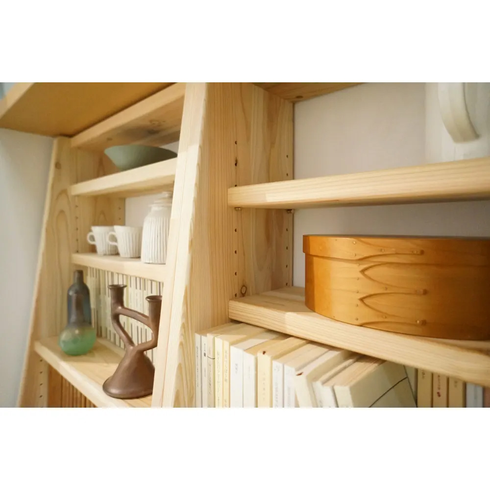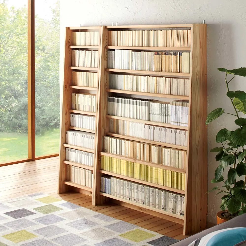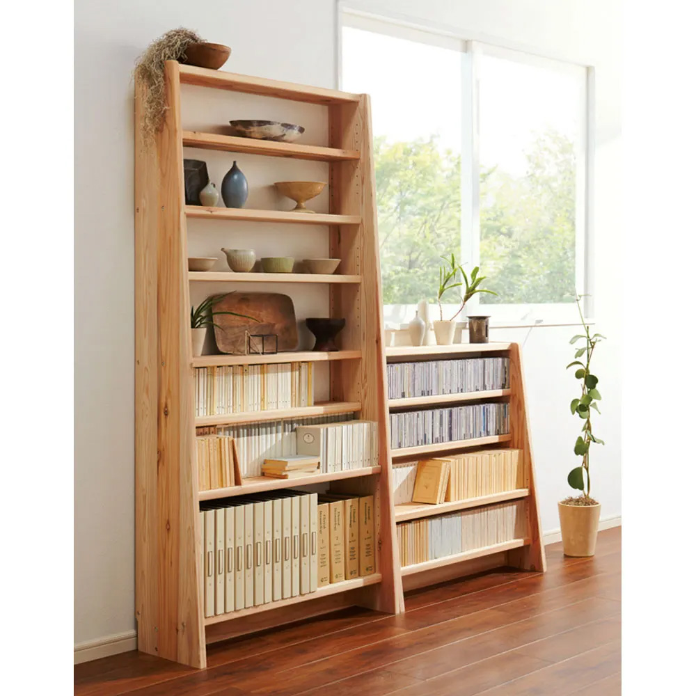 愛書の格を高める、大地の恵みによる斜め本棚。安定感のあるタワー型で、上段は文庫本や新書、下段はA4判に対応。蔵書家のための、大量収納が可能な本格頑丈書棚です。愛書の格を高める大地の恵み◆国産杉の味わい深い素材感をお楽しみいただける、頑丈なブックシェルフオープンラックシリーズです。◆芳醇な香りに包まれ、書籍もお部屋もたちまち上質な雰囲気に。◆仕切りのないすっきりとした頑丈な3cmピッチの可動棚板は、収納性にこだわった本格仕様の証です。◆高さは置き場所を選べる2サイズ(ロータイプ89.5cmとハイタイプ179cm)をご用意。◆省スペース薄型スリムな木製ウッドラックは、書斎やリビング、ベットルームやカウンター下収納など、あらゆるシーンで活躍。◆また、CDラック・DVDラック・コミックラック・ディスプレイラック(飾り棚)など、用途もさまざま。◆バイヤーと職人が細部までこだわり、真心を込めて国産の大地の天然木ギフトをお届けいたします。〜緑豊かな環境で育まれた宍粟市の「国産杉」を使用〜◆その9割を森林が占める、兵庫県宍粟市で産出された「国産杉」を使用しています。◆地場産業として木材、木工製品、家具などの生産が盛んな宍粟市で、熟練の木工職人が加工しています。国産杉は、しっかり目の詰まった木質による丈夫さが特長。建築材にも使われているこの素材をそのまま加工している書棚は、長い年月使い続けても安心の確かな耐久性を備えています。国内生産にこだわった一貫ライン国産杉を、生産から供給まで一貫体制を敷く、木材センターの最新技術で加工。その素材を知り尽くした地場工場にて製造し、熟練の職人によって丁寧に仕上げています。
