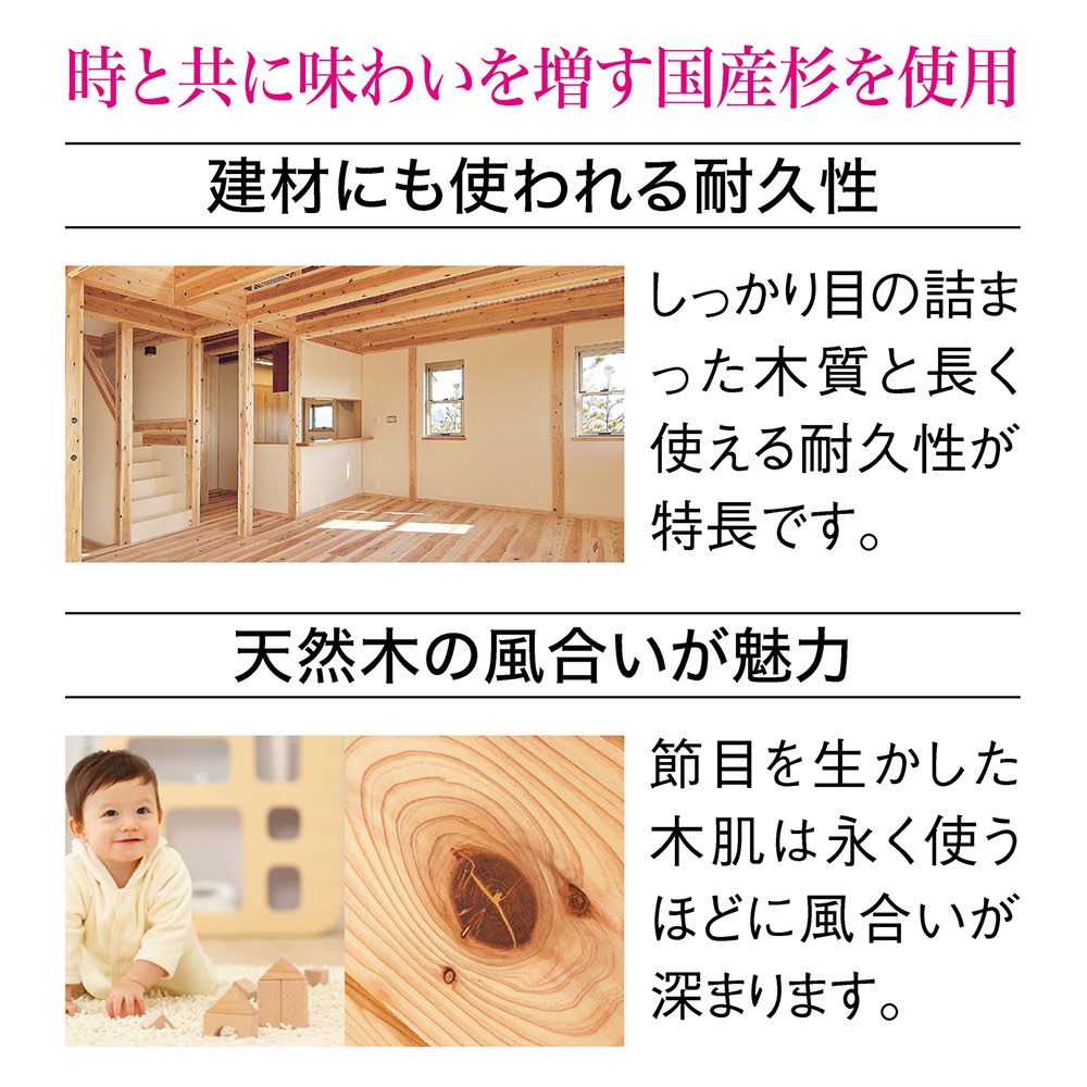 見た目のスタイリッシュさとたっぷり収納できる頑丈さを両立!まるで北欧のつくりつけ家具のような、杉天然木のオープンシェルフ。頑丈な国産杉を日本の職人の手で仕上げました■建材にも使われる国産杉を使用し、素材面から強度をサポート。■日本製にこだわり、素材を知り尽くした職人が丁寧に仕上げています。■豊かな風合いが魅力の天然木は北欧家具・北欧インテリアにも優しく調和する、かわいいインテリアに。■天然杉を「兵庫木材センター」の最新技術で加工。良質な木材をその素材を知り尽くした地場工場にて製造、熟練の職人によって丁寧に仕上げています。■天然の節目を生かした自然のままの木肌は、長く使うほどに風合いが深まり、エイジングと香りも愉しめます。まるで北欧のような、スタイリッシュで美しい天然木の家具を目指しました■棚板の厚みは、頑丈さを保ちつつ従来よりもスリムに。その分、天然木特有のぽってりした感じがなくなり、モダンに見えます。■欧州の家具は、天然木を使い、はっきりとした木目や節目も風合いとして楽しむものが多くあります。それは、自然のあるがままの姿を愛するからこそです。本商品も、あえて杉天然木の節や木目を残し、塗装はせずにナチュラル感を残しています。1点1点異なる表情を持つ天然木に、ほっこりと愛着がわいてくると思います♪■天板部分もしっかり収納スペースに。グリーンやお気に入りのバスケットなどを自由に並べて。■奥行がたっぷりあるので、雑誌や写真集はもちろん、コミックやCD、レコードまで収納は自由自在!あなたのお気に入りをたっぷり収納してみてください。見た目だけじゃない!機能性だってぬかりありません■棚板の1枚当たりの耐荷重は20kg!長く使えば使うほど気になる棚板のたわみが発生しにくいのも特長です。■可動棚の可動ピッチは3cm。収納する本に合わせて、棚板の高さを変更できます。■高さ9 奥行1cmの幅木よけ付き。壁にぴったりとつけて設置できます。■背中部分に板がないので、コンセントやスイッチを生かしながら設置できます。すきまでスマ-トフォンの充電も可能です。