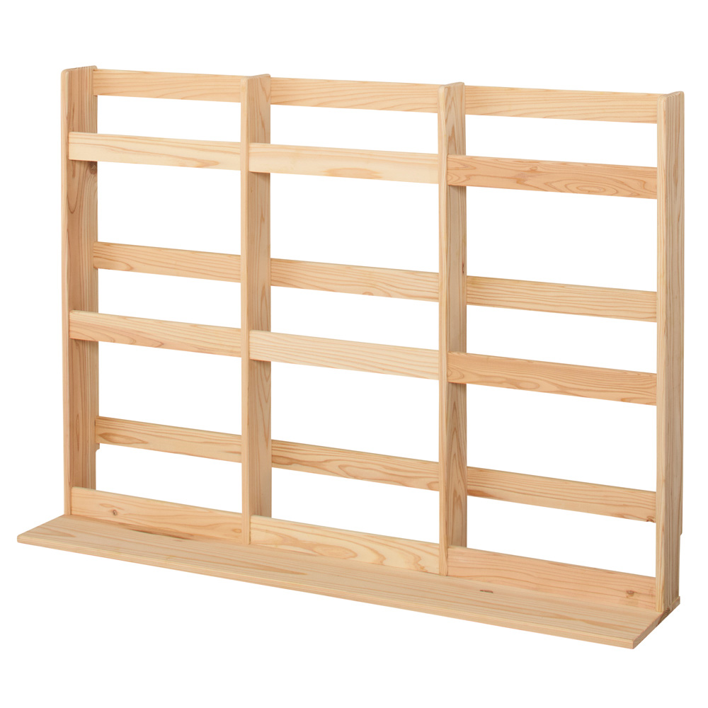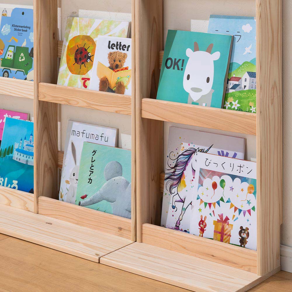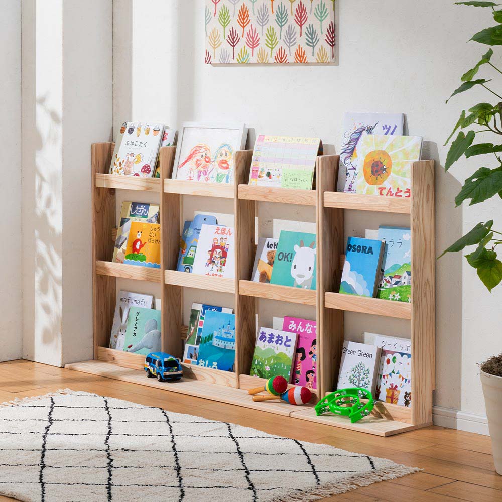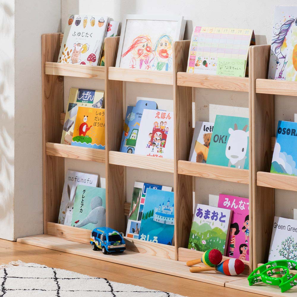 国産杉天然木のぬくもりあふれる収納ラック。絵本ラックはカラフルな表紙をディスプレイ感覚で収納でき、いつも目に触れることで本好きな子に。お子さまの豊かな情緒や学習意欲を育みます。角に丸みのある形状で、小さな手にもやさしく仕上げました。