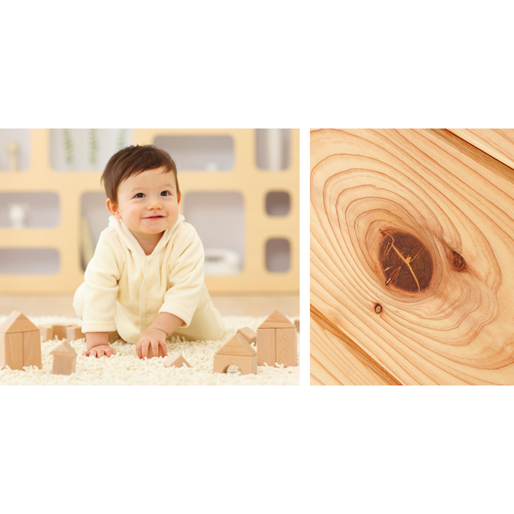 • 国産杉ならではの温もりある自然な風合いを生かし、安心・安全にも配慮した造り。角に丸みのある手に優しい仕上げで、ホルムアルデヒド含有量が最も少ないF☆☆☆☆接着剤を使用しています。