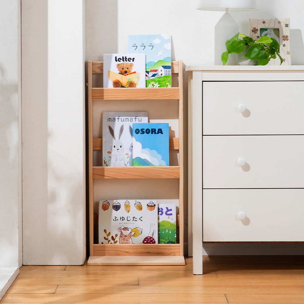 国産杉天然木のぬくもりあふれる収納ラック。絵本ラックはカラフルな表紙をディスプレイ感覚で収納でき、いつも目に触れることで本好きな子に。お子さまの豊かな情緒や学習意欲を育みます。角に丸みのある形状で、小さな手にもやさしく仕上げました。